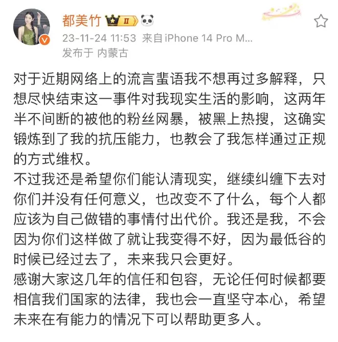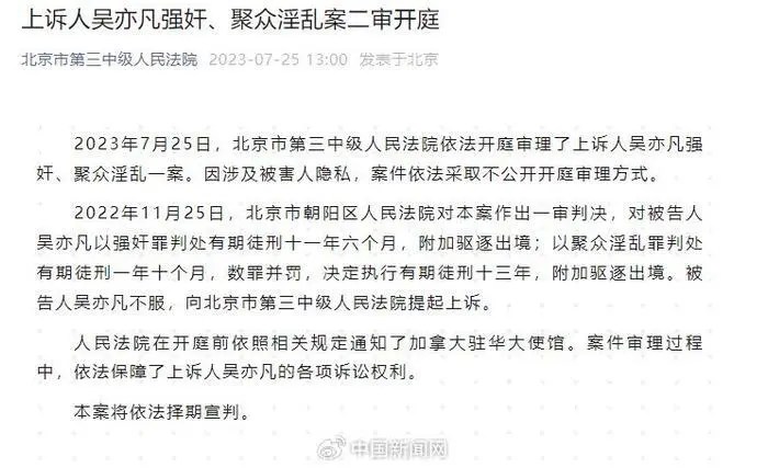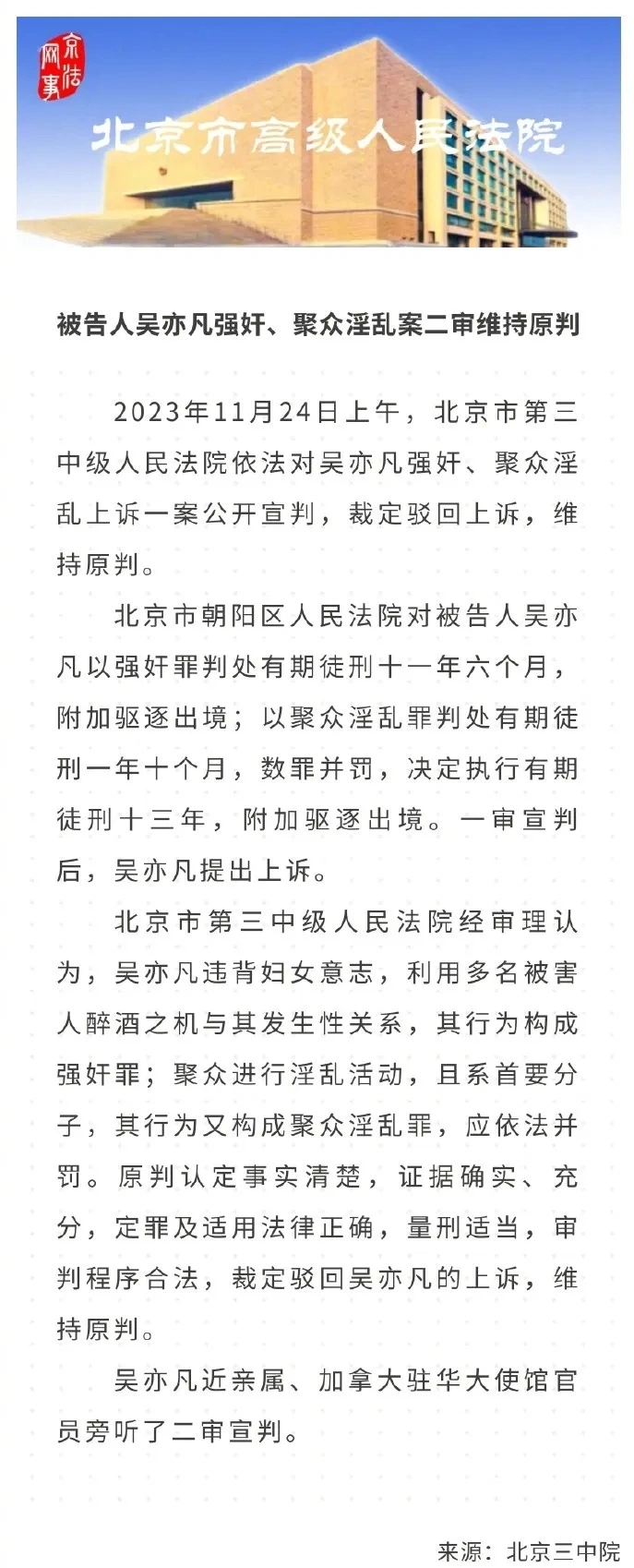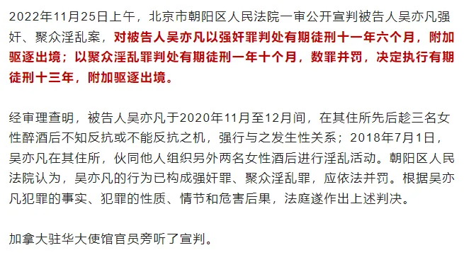 2022年11月25日,吴亦凡一审宣判,数罪并罚,决定实验有期徒刑13年,并驱逐出境。 一审后,吴亦凡提出上诉,2023年11月24日,二审宣判,维持原判。 二审公开宣判后,都美竹公开辟声,体现信赖法律。 都美竹体现网上的飞短流长她不想过分表明,最低谷已经已往,她的将来会更好,并盼望在将来资助更多人。 吴亦凡变乱后,都美竹交际媒体陷落,常年受到大量的攻击,别的她的好友李恩多次反水,在网上曝光都美竹操行不端。 为此,都美竹也曾多次反驳,并体现本身肯定会维权。 不外须要指出的是,吴亦凡此事存案,与都美竹并无直接关系,警方在发布的转达中指出,自动参与是由于关注舆情热门。 以是,无论都美竹本人怎样,都对与吴亦凡变乱的结果没有直接关系。 吴亦凡母亲体现,她对本身当初制止吴亦凡退出娱乐圈体现悔恨,事已至此,她也仍旧信赖法律,固然二审竣事,她也会继续为儿子申说。 她承认吴亦凡有不对,但以为儿子并非罪过滔天。 在此前3天,也就是2023年11月21日,在都美竹变乱中起巨大推动的作用的写手徐某公开辟言体现悔恨。 徐某声称本身在变乱中被都美竹诱骗,深觉对不起吴某,并体现都美竹本品品行不绝不端,并对吴某体现了悔恨。 都美竹因此被指“翻车”。 因徐某文中提及六年半之后,他会送吴亦凡去机场,引发外界对吴亦凡刑期厘革的推断。 但都美竹对此事不绝体现了沉默沉静。 变乱回顾: 2021年6月,都美竹晒谈天,爆料本身与吴亦凡之间有情绪纠葛,控诉对方与本身有不合法关系,吴亦凡给女方转账记载也同时曝光。 爆料内容如下:2020年12月初,多名男女在吴亦凡家中集会,包罗都美竹,众人脱离后,都美竹与吴亦凡有密切打仗。 12月8日吴亦凡给都美竹转账3.2万,都美竹担当。 12月8日起至2021年4月,两人保持微信接洽,言语密切。 2021年4月后,都美竹自感受荒芜,决定爆料。 2021年7月13日,写手徐某开始参与都美竹与吴亦凡变乱,通过网路输出各种言论,变乱发作。 2021年7月14日,吴亦凡母亲自动报警,来由是被都美竹诓骗。 2021年7月18日,吴亦凡交际媒体公开辟表声明,否认都美竹交际媒体的一系列控告,如选妃等。 由于舆情发酵,警方参与。 2021年7月22日,北京向阳警方发布观察结果。 2021年7月31日,吴亦凡被拘捕。 2021年8月16日,吴亦凡涉嫌强奸被逮捕。 2022年6月10日,一审开庭,此时吴亦凡已被关押十个月。 2022年11月25日,吴亦凡开罪宣判13年。 一审后,吴亦凡提起上诉。 2023年7月25日,二审开庭。 如今,吴亦凡名下全部的贸易也处于瘫痪状态。 二审宣判时,除吴亦凡支属,加拿大驻华大使馆官员旁也听了二审宣判。 |