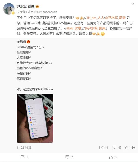 IT之家 11 月 25 日消息,蔚来 NIO Phone 业务负责人尹水军本日在个人微博转发博主 @肥威 对蔚来 NIO Phone 的长处总结,并约请用户提供对 NIO Phone 的发起。 有博主扣问尹水军,蔚来手机内置的 SkyUI 何时能支持谷歌 GMS 框架,并称本身已将 NIO Phone 当成主力机来利用,且拥有利用外洋产物的需求。尹水军复兴称,下个月中下旬就可以支持。 尹水军在复兴网友发起时还透露,NIO Phone 后续更新有望提供如下功能: 增长车控菜单的功能,且支持自界说 配景锁定功能(还须要点时间) 桌面图标批量移动(已在开辟) 在此之前,蔚来 NIOPhone 已经先后迎来 SkyUI 1.0.1、1.0.2 两轮体系更新,在上个月发布的 SkyUI 1.0.2 中,新增了“天空视窗”功能,通过车内中控屏即可快速预览手机桌面并利用手机上全部 App;以及 NIO Link 游戏,可让玩家在车机上全屏嬉戏手机安装的《狂野飙车 9》《暗黑粉碎神:不朽》等游戏。 在 9 月发布的 SkyUI 1.0.1 中,NIO Link 接力、NOMI 语音、智能车控等方面均有更新。 IT之家汇总蔚来 NIO Phone 信息如下: 蔚来手机 NIO Phone 于 9 月推出。硬件方面,蔚来 NIOPhone 搭载高通骁龙 8 Gen 2 领先版处置惩罚器,最高可选 16GB + 1TB 存储,该机配有 6.81 英寸三星 E6 材质 2K 屏,支持 120Hz LTPO 高刷,最高亮度 1800nits;内置5200mAh 大电池,支持 66W 有线充电 + 50W 无线充电 + 10W 无线反向充电。 影像方面,蔚来 NIO Phone 搭载三主摄,分别为 50MP 广角 + 50MP 超广角 + 50MP 潜望长焦,镜头模组排布接纳了类棋盘操持。 |