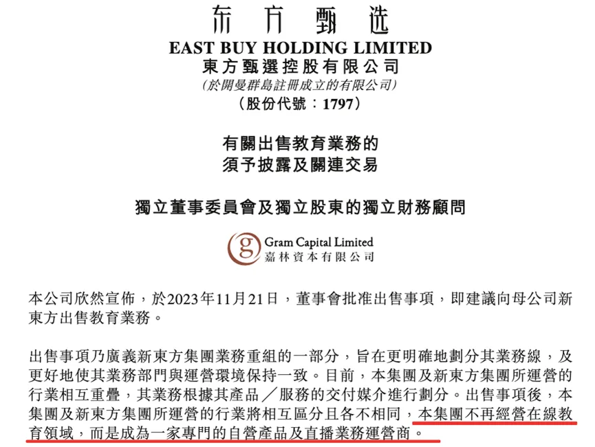 东方甄选出售教诲业务 这下子,俞敏洪真的要一条道走到黑了。 11月21日,东方甄选发布公告称,董事会答应出售事项,即发起向母公司新东方出售教诲业务,代价合共人民币15亿元,以现金付出。 出售过程中,除了付出15亿元现金,新东方还需负担1.53亿元净负债。 也就是说,东方甄选总计录得的出售事项收益将到达16.53亿元,后续这笔款子将作为一样寻常营运资金,用以发展余下业务。 具体来看,东方甄选预备出售的教诲业务,包罗优播香港、酷学慧思、西安睿盈的全部股权,以及与教诲业务有关及东方甄选团体“大学教诲”及“机构客户”业务分部附属的相干知识产权资产、业务合约权利及责任、应收账款及应付账款、存货、其他相干资产及雇用资源等,涵盖范围相称广。 而随着这一系列业务的出售,东方甄选及新东方团体所运营的行业将相互区分且各不雷同,彼时新东方会将更多精神投注于教诲行业中,东方甄选也能更加专注自营产物及直播行业的发展,成为一家专门的自营产物及直播业务运营商。 现在看来,东方甄选正试图扬弃教诲标签,成为一家彻彻底底的直播带货机构。 值得注意的是,现在东方甄选对教诲业务的剥离,着实早有端倪。 本年1月,新东方在线发布公告称,董事会发起将本公司英文名称由“Koolearn Technology Holding Limited”更改为“East Buy Holding Limited”,并将该公司双重外文名称由“新东方在线科技控股有限公司”更改为“东方甄选控股有限公司”。 很显着,其时新东方在线就已完全意识到重点转向直播电商范畴对团体实现久远增长的告急性。 8月尾,东方甄选公布的转型后首份财报表现,停止5月31日,东方甄选2023财年总营收45亿元,同比大增651%;净利润9.71亿元,上年同期净亏损5.34亿元,扭亏为盈;毛利20亿元,同比大增400.1%。 根据财报,东方甄选的营收重要泉源于自营产物及直播电商业务、大学教诲、机构客户中分部,此中自营商品及直播电商业务本财年总营收为39亿元,占比高达86.7%,是东方甄选最告急的收入泉源。 由此可见,2023财年东方甄选实现营收、净利和毛利的大幅提升,重要得益于自营产物及直播电商业务的强劲增长。 差别于直播带货的发作式增长,东方甄选教诲业务的收入占比出现降落趋势。数据表现,以机构客户分部为例,数据表现,2022财年机构客户分部总营收为5840万,2023财年淘汰至3820万元。 而根据新东方在10月份公布的2024财年第一财季陈诉表现,2023年5月31日至8月31日,公司净营收为11亿美元,同比增长47.7%,重要增长同样来自于直播电商业务。 云云看来,向母公司出售教诲业务,显然是东方甄选All in直播带货的告急一步,俞敏洪大概是渴望通过这种明确分别业务线的方式,让东方甄选将会很好地保持其业务部门与运营环境的同等,实现更会集的资源分配。 东方甄选的转型之路,走到了第二步 回顾俞敏洪近两年来的发展动作,着实不难发现,东方甄选的直播带货模式已根本跑通。 2022年8月,东方甄选在各大应用市肆上线了独立APP,但仅限于购物;本年7月初,东方甄选公布在自有APP上开启甘肃专场直播活动,打造私域流量;8月29日,东方甄选入淘开播,交出了17个小时带货1.7亿的良好效果单。 联合前文提到的“新东方在线改名东方甄选”“东方甄选向母公司出售教诲业务”两大标志性变瞎搅看,直播带货显然已从已往的救命稻草,酿成了现在东方甄选创建品牌影响力的关键。 换句话说,随着直播带货业务步上正轨,东方甄选将彻底完成转型,完全褪去前身新东方在线这家教诲机构的影子。 值得一提的是,除了重押直播带货业务,俞敏洪也在积极探求新的发展时机。 尤其针对文旅赛道,俞敏洪下足了功夫。7月19日,北京新东方文旅有限公司正式创建,注册资源高达10亿元,由俞敏洪继承法定代表人、董事长。 自此,东方甄选正式踏上了文旅创业路。 7月21日,新东方官宣再创业方向——开发面向中老年人的文旅奇迹,自此新东方开始重点运营教诲、生存、文旅三大范畴,东方甄选的方向再次明确。 天眼查APP表现,10月16日,东方甄选(珠海)旅游文化有限公司创建,法定代表人为东方甄选CEO孙东旭,注册资源为1000万人民币。 在俞敏洪的棋局里,文旅已成为仅次于直播带货的第二颗棋子。而在东方甄选(珠海)旅游文化有限公司之前,东方甄选早已在悄悄试水文旅产业。 客岁年底,东方甄选推出“东方甄选看天下”账号,加速探索“旅游+直播”的新模式。停止11月1日,东方甄选外景专场直播已走过15省市、17场次,外景专场均匀场次贩卖环境破亿,每场累积观看人次均匀4000万以上。 现在,“东方甄选看天下”的抖音账号粉丝数目已达334.7万,比北京新东方文旅有限公司刚创建那会儿,粉丝数目上涨超40万。 就当前的环境来看,东方甄选已经进入第二发展阶段,接下来主打的是在直播电商业务稳步进步的底子上,拓展新的业务,探求新的增量。 另一个转型方向在那里? 直播电商行业日新月异,市场已由增量竞争转为存量竞争。 云云配景之下,以东方甄选为代表的直播带货机构,固然乐成在电商平台内站稳了脚跟,但其背后所面对的风险却是相称大的。 就拿东方甄选来说,本年7月,东方甄选APP上线最新版本,并公布开启初次APP直播带货。 但当月月尾,因规则要求,抖音平台东方甄选自营产物店肆、自营产物直播间停息业务3天。 由于抖音的封禁,东方甄选当月的自营品业务销