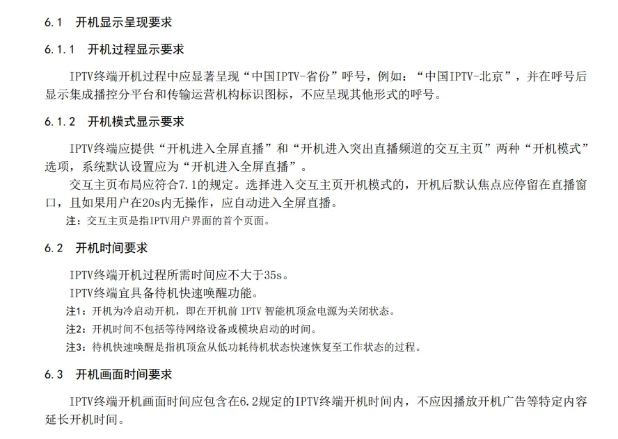 IT之家 11 月 27 日消息,国家广电总局发布《有线电视业务技能要求》等三项广播电视和网络视听行业尺度,此中《IPTV 业务技能要求》规定,IPTV 终端开机过程中应明显出现“中国 IPTV-省份”呼号,比方:“中国 IPTV-北京”,并在呼号后表现集成播控分平台和传输运营机构标识图标,不应出现其他情势的呼号。 《要求》规定 IPTV 终端应提供“开机进入全屏直播”和“开机进入突出直播频道的交互主页”两种“开机模式” 选项,体系默认设置应为“开机进入全屏直播”。 交互主页布局应符合以下规定。选择进入交互主页开机模式的,开机后默认核心应停顿在直播窗口,且假如用户在 20s 内无利用,应自动进入全屏直播。 用户界面交互主页布局要求呼号表现要求 IPTV 交互主页上的呼号应为“中国 IPTV-省份”,比方:“中国 IPTV-北京”,不应出现其他笔墨及 字符,且应放置在屏幕左上角位置。 播放窗口要求 交互主页应在屏幕中设置直播频道播放窗口,窗口面积应不低于屏幕面积的 40%。 免费业务专区入口要求 交互主页应设置明显、便捷的免费业务专区入口,从交互主页默认核心至免费业务专区入口的利用 次数不宜高出 3 次。 直播频道标识要求 交互主页导航栏应在明显位置设置直播频道标识,名称同一为“看电视”,图标样式示例见附录 A,颜色可根据必要调解。 页面切换时间要求用户利用遥控器切换页面至该页面完全表现,所需时间应不大于 2s。 注:页面是指由 IPTV 集成播控分平台直接运营的各业务的各级页面。 用户界面模式要求用户界面宜面向老年、未成年等用户群体提供特定的服务模式,并提供便捷切换入口。 付费提示要求对于业务的订购或退订等相干利用,均应在用户界面上提供明白的提示阐明和流程利用阐明,且应提供确认付费或取消付费的明白利用步调,不应设置“一键付费”相干利用。对于任何业务的定期或连续扣费,均应在扣费前明白、自动提示用户。 用户数据收罗安全要求要求如下: 应确保数据收罗的正当性和正当性; 应通过对组件、终端、装备等收罗终端举行须要的技能控制,如在摆设前对收罗终端举行收罗本事认证、计量等,确保数据的完备性、划一性和真实性; 应明白数据网络和获取过程中个人信息和告急数据的知悉范围和安全管控步调,确保收罗数据的正当性、完备性和真实性; 应采取脱敏、加密等技能或管理步调确保收罗过程中涉及的个人信息和告急数据不被泄漏; 应对数据收罗举动举行权限管理。 IPTV 终端开机过程所需时间应不大于 35s,宜具备待机快速唤醒功能。 IT之家注:开机为冷启动开机,即在开机前 IPTV 智能机顶盒电源为关闭状态;开机时间不包罗等待网络装备或模块启动的时间;待机快速唤醒是指机顶盒从低功耗待机状态快速规复至工作状态的过程。 时移业务的进入服务时间、选时利用相应时间、退出服务时间均应不大于 2s。 回看业务的进入服务时间、选时利用相应时间、退出服务时间均应不大于 2s。 点播业务的进入服务时间、选时利用相应时间、节目搜刮结果加载时间、退出服务时间均应不大于2s。 音视频格式要求方面,高清视频的分辨率应为 1920 ×1080 ,宽高比应为 16:9,帧率应不低于 25fps。 4K 超高清视频的分辨率应为 3840 ×2160 ,宽高比应为 16:9,帧率应不低于50fps,量化精度应为 10bit。 遥控器按键要求方面,遥控器应具备快捷看直播频道的按键,通过此按键直接进入全屏直播,按键名称应为“看电视”。遥控器应具备主页键,通过此按键直接进入用户界面交互主页。 |