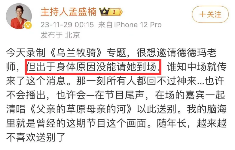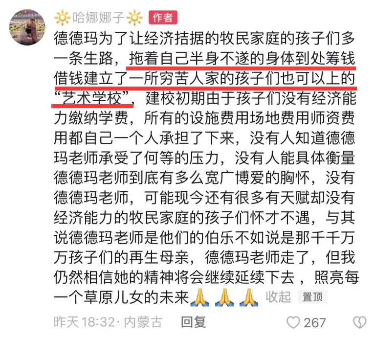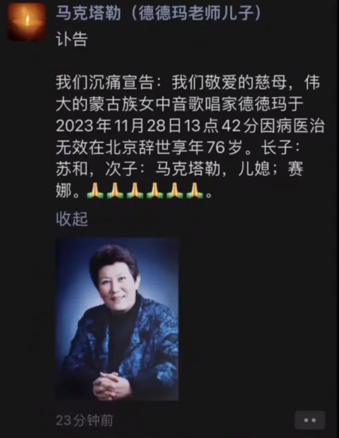 11月28日,著名歌唱家、国家一级演员德德玛因病去世,享年76岁,作为备受赞誉的老艺术家,德德玛一生都奋斗在热爱的歌唱奇迹中,其演唱的《漂亮的草原我的家》非常经典,即便因脑出血偏瘫,她仍对峙坐轮椅登台演唱,其对歌唱奇迹的热爱精神值得晚辈去学习,她的拜别是我们的丧失,深深不舍。 德德玛去世后,其小儿子对外发布了讣告,他悲伤公布妈妈去世的噩耗,并透露妈妈是在睡梦中安详地与世长辞,没有遭罪。 别的,各人都关心德德玛老师去世的缘故因由,据知情者爆料,德德玛老师是由于高血压导致脑出血,她的身段从客岁就很差了,不绝断断续续在医院担当治疗,也曝光了德德玛老师住院治疗的画面。 可以看到,即便在医院担当治疗,德德玛老师都会把本身摒挡得漂漂亮亮的,涂抹口红、染着头发让本身看上去没那么干瘪。她在住院期间还对峙唱歌,真就是爱唱歌爱到了骨子里,这个时间德德玛老师病得还没那么严峻。 德德玛老师走得很突然,她在11月15日还曾公开露面,当时没看出什么非常,就是人瘦了许多,还化着妆气色红润。 11月12日她还坐着轮椅在小区里遛小狗,德德玛老师穿得非常丰富,脸上不绝露着笑容。 11月1日她与门生还一起在家唱歌,从这些动态可以大概确定,德德玛在去世前半个月都还好好的,没想到病情来势汹汹,睡梦中就脱离了。 着实德德玛在去世前不绝对峙着减肥,她也知道想要身段康健,血压稳固,就必须控制好体重,也有了显着的瘦身效果,可她体重确实太高了,随着年事的增大,各种疾病就缠身了,幸亏没有遭罪,很圆满的走完了本身一生。 据主持人孟盛楠透露,德德玛老师去世的当天,她原来想约请德德玛老师录制《乌兰牧骑》的专题,由于身段的缘故因由没能请她到现场,谁知中场就传来德德玛老师去世的消息,那一刻全部人都没有回不外神来,难以担当这个毕竟。 别的,门生透露德德玛老师不为人知的一面,德德玛为了让经济窘迫的牧民家庭的孩子们多一条生路,拖着半身不遂的身段随处筹钱创建了一所贫困人家孩子也能上的“艺术学校”。 建校初期孩子们没有经济本事缴纳学费,全部的办法费、师资费都是德德玛一人负担了下来,当时她有许多压力,但没有放弃,也因她的善举,让许多有天赋却没钱的孩子担当了专业教诲,可以说德德玛是这些贫困门生的伯乐,是他们的再生母亲,真的很巨大。 腾格尔、哈文等人纷纷发文哀悼德德玛,在家人、亲朋、粉丝的送别声中,德德玛老师会走得无牵无挂。 如今关于德德玛老师后事安排还没对外发布,后续家人会对外公开。 |