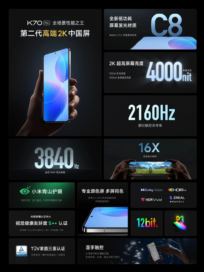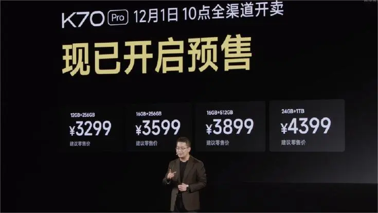 鞭牛士 11月29日消息,本日,在红米K70系列发布会上,官方公布了红米K70系列,包罗红米K70和红米K70 Pro。 红米K70 Pro代价公布,12GB+256GB尺度版3299元;16GB+256GB售价3599元;16GB+521GB售价3899元;24GB+1TB售价4399元。 王腾先容,红米K70 Pro共有墨羽、晴雪、竹月蓝3款配色。 红米K70手机芯片将接纳高通骁龙8gen3,现场跑分224780分。K70系列还将搭载小米汹涌OS,公开资料体现,汹涌OS是小米打造的最新一代体系,它实现了全面的底层重构。 影像上Redmi K70 Pro搭载了光影猎人800传感器,支持闪电快拍,同时拥有一颗2X的人像镜头和一颗12MP超广角镜头。 续航上是接纳120W+5000mAh电池的组合,接纳金属中框+自研双翼天线,通讯本领优化,自研AI网络算法,低延时、低卡顿,多功能NFC,AI影院 。 接纳无界计划,搭配1.3mm高透玻璃Deco,无屏幕支架。 别的,K70 Pro还搭配全新的冰封散热体系和2K屏幕,峰值亮度4000nit。 |