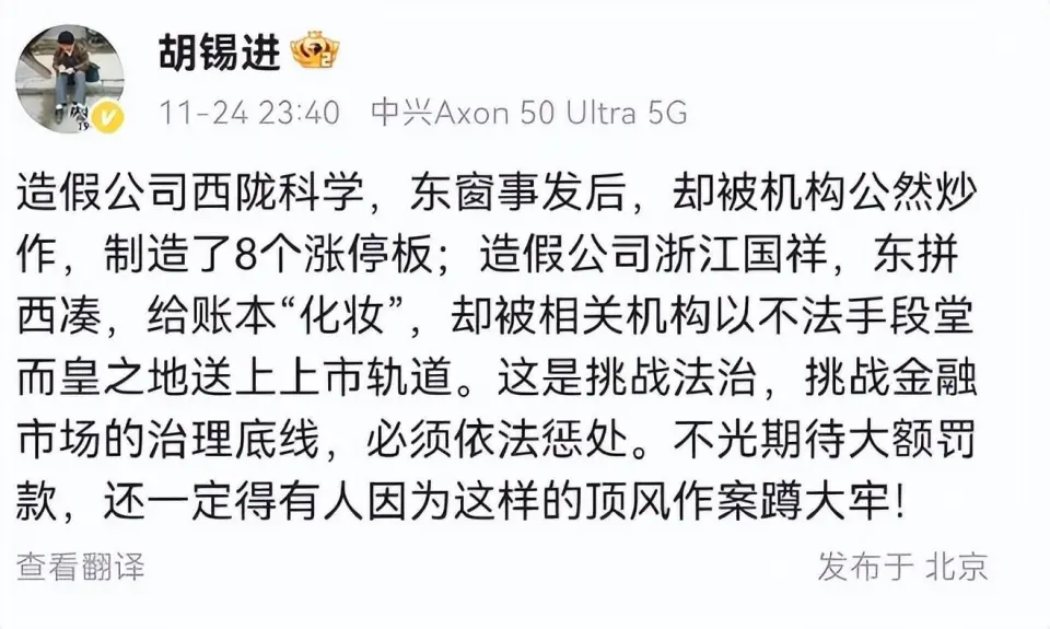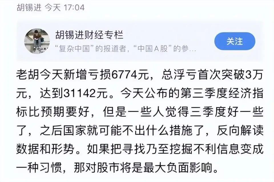 胡锡进炒股不绝备受关注。 11月30日,胡锡进在搜狐财经论坛体现,“我就不信股市回不到3200点、3300点,只要到那一步,老胡瞬间就赢利了。” 胡锡进体现本身6月作为一个散户入市,当时是3144点,他判定股市跌得差不多了,该往上走了,股市快要3300点时,他赚了一万块钱,高兴坏了,感觉他本身是新巴菲特。 不外,很快,胡锡进就被啪啪打脸。股市从3300附近开始连续下跌,胡锡进的账户也是由红利转为亏损,反面亏损越来越大。 9月7日,胡锡进在交际媒体发文体现,“老胡本日上午做了出场以来的最大加仓,如今本金47万,已全部满仓”。 9月20日,胡锡进再发布炒股日志时,他的亏损已经到达了14315元。“本身的筹划就是投入50万,让本身做一个合格的小散,不会伺机出逃。” 10月,对于胡锡进来说,简直就是噩梦。 10月18日,胡锡进在个人账号发文称,老胡本日新增亏损6774元,总浮亏初次突破3万元,到达31142元。 10月19日,胡锡进再更新炒股日志,“老胡本日新增亏损7306元,与大盘跌幅大要相当。当初3144点时没看准,很内疚,我亏了该死。我临时没有钱继承加仓,但一分钱也不会撤。” “无论我本日亏多少,这些钱都会末了一分不少地回到我的账下。我就不信,股市永久回不到3500或4000点了。”胡锡进刚强地体现。 比及了10月23日时间,胡锡进亏损已经高出4万了。不外,到11月22日,胡锡进的账户浮亏已经回升到23059元。 连续的亏损,让胡锡进也不得不破防,11月24日深夜,胡锡进更新了微博,稀有破防痛骂浙江国祥、西陇科学等公然造假利用股市。 “这是挑衅法治,挑衅金融市场的管理底线,必须依法惩处。不光等待大额罚款,还肯定得有人由于如许的顶风作案蹲大牢!”胡锡进愤怒说道。 值得一提的是,纵然亏损,胡锡进仍旧看好A股市场。 “我眼界不可,靠什么?靠信心,信心是什么?我信任中国经济肯定会重新抬起来。假如信心还不敷,反面另有信仰,国家说中国经济要往上走,我信任末了能起来。” “眼界,信心加上信仰,如今支持着我的是信心这一步,信仰还没用上呢。直到如今我都没卖,我就不信股市回不到3200点、3300点,只要到那一步,老胡瞬间就赢利了。” 胡锡进刚强地体现:“固然我如今是亏了,但有一天会赚返来。” 作者 | 张小磊 |