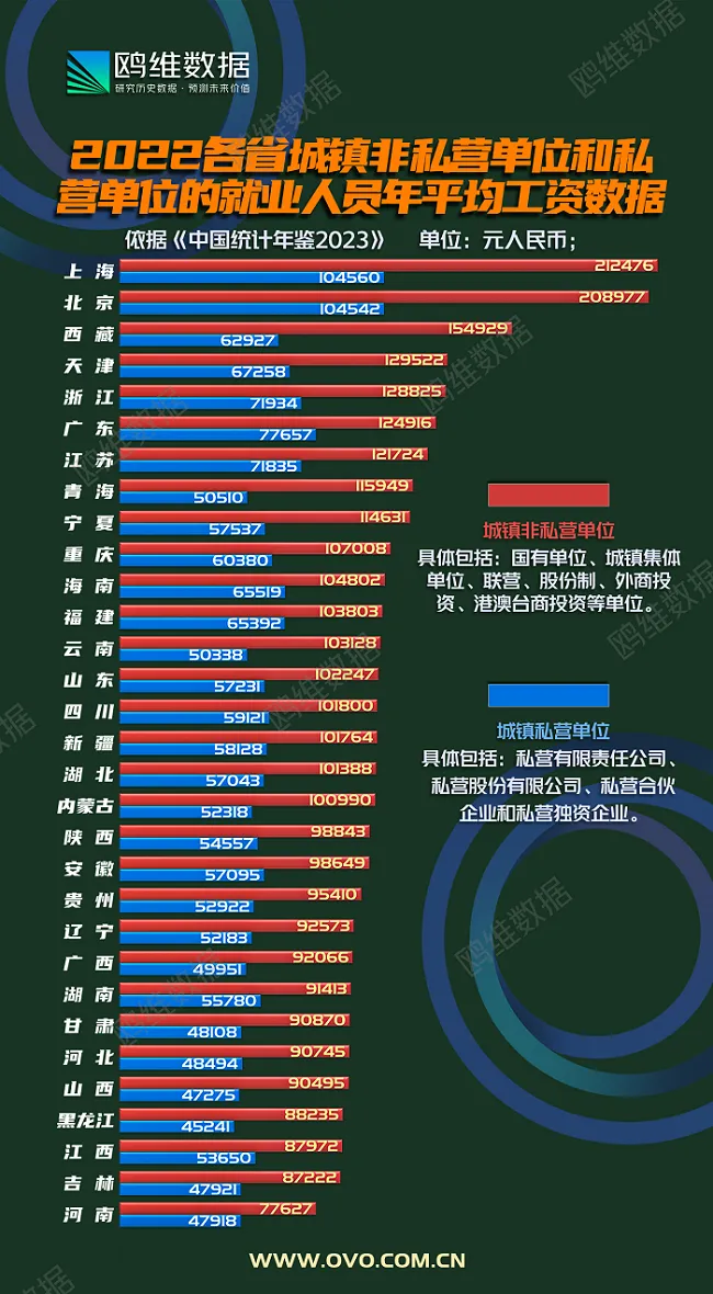 榜单表现,2022年,在城镇非私营单元中,上海、北京、西藏、天津、浙江、广东、江苏、青海、宁夏共计9个省份,就业职员年均匀工资高出“国家线”(114029元)。此中,上海、北京两地无论黑白私营单元还是私营单元,就业职员均匀工资均居首位,成为天下唯二高出20万(城镇非私营单元)及10万(城镇私营单元)的省份。 其下,单看城镇非私营单元,西藏、天津、浙江、广东、江苏等省份也均在12万元以上。而城镇私营单元中,除北京上海两地逾越10万,其下浙江、广东、江苏同属7万档位。西藏、天津、重庆、海南、福建5省份位居6万梯队。别的,5万元档次的省份有内蒙古、辽宁、安徽、山东、江西、湖北、湖南、四川、贵州、云南、陕西、青海、宁夏、新疆。别的省份年均工资则为4万余元。 这里须要留意的是,根据统计界说,城镇非私营单元具体包罗国有单元、城镇团体单元、联营、股份制、外商投资、港澳台商投资等单元。根本也可以视为大中型企业和单元聚集体。而我们一样寻常所见的无论是“三桶油”、三大运营商等大型央企,还是阿里巴巴等大型民营企业,抑或特斯拉等外资企业,还是富士康等港澳台资企业,都席卷在内。 与之相对比的城镇私营单元则具体包罗私营有限责任公司、私营股份有限公司、私营合资企业和私营独资企业,根本则视为中小企业。以是工资与大型企业之间存在悬殊也就不惆怅到明白。 |