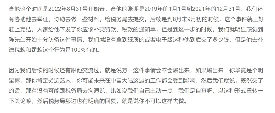 12月第一天,男星陈志朋就陷入了偷漏税丑闻,他的前员工出头爆料他偷税漏税2000万元,拖欠工资,詈骂员工,信息量很大。别的,这位知恋人士继续向媒体爆料他在职期间,所看到的干系陈志朋直播幕后细节,堪称精彩。 该前员工爆料,陈志朋是被举报偷漏税,干系部分在2022年8月开始稽察,然后查出来之后,要求陈志朋补缴罚款和税款。前员工还爆料,陈志朋是主观偷漏税,他本人也不绝畏惧被曝光,以是观察结果出来后就找各种来由驱逐公司,以致驱逐后还欠拖员工工资。 在脱离小虎队之后,陈志朋人气低迷,无法接到好的作品,他比年来重要依赖直播带货赢利,在前员工看来,陈志朋这些年靠着直播赚了2000万元,可实际上,他个人看不起直播,以为直播带货很low,但是由于接不到好的作品,因此只能被迫用直播赢利。 前员工还透露陈志朋把报酬看得比作品的质量还要重,还很自尊,不绝以来,他给自己的定位就是一位非常锋利的顶流明星,既然是大明星,那么面子肯定要做足,吃穿住行都要接纳最高标准。 无论是直播还是商演,第一,陈志朋明确要求住本地最好的五星级旅店,第二,要求旅店必须给陈志朋准备双位的行政套房。 第三,当陈志朋工作的时间,配备的工作职员最少3个,最好可以大概有五个,不但云云,陈志朋还让工作职员与活动方协商,出行期间产生的交通费可以先由陈志朋方付出,但是末了活动方要报销费用,自己肯定要讲这个场面。旅店要顶级,工作职员要多,除了这些之外,接送的车子必须最低配是GL8,另有每天的餐费必须要到达800块钱一天。 这位自称前助理的人吐槽了很多有关陈志朋的内容,从他口中可知,陈志朋险些无戏可拍,可却靠直播年赚2000万,光补税就有1000万,出行场面都是高标准。在网友来看,根本不必心疼208,哪怕如陈志朋如许的十八线艺人,光偷的税就是很多人一辈子也赚不到的钱,心疼这些有钱人,倒还不如心疼心疼自己。 陈志朋并不是个例,有无数例子都能印证艺人的钱真好赚。陈志朋两三年偷税漏税就被查出了1000万,还别说没有查出来的,除了陈志朋之外,夏克立曾自曝当年带女儿录制综艺,录制一集《爸爸去哪儿》的薪酬就有25万,没有996和内卷,这一季下来,夏克立那段时间在本地赚的钱就凌驾600万美金。 别的,前有王传君曾经出圈的经典名言,自称自己很崎岖潦倒的时间,穷到卡里只有100万了,后有杨幂采访哭穷自己卡里真没钱,这些都可以大概看得出明星的穷和我们的穷不是一个概念。 言归正传,陈志朋大概已颠末气,但他确实要比平凡人好赢利得多,曾经有网红出价30万的进场费,让陈志朋化身为推蛋糕的小哥刷个脸。 这些年,陈志朋游走于各大商演之中,穿着奇装异服,扮丑搞怪,固然靠自己的本领赢利不丢脸,可如果三番两次偷税漏税,肯定会涉及到大众的底线,末了,盼望陈志朋出来回应一下,切忌想要走捷径,克制因小失大。 |
