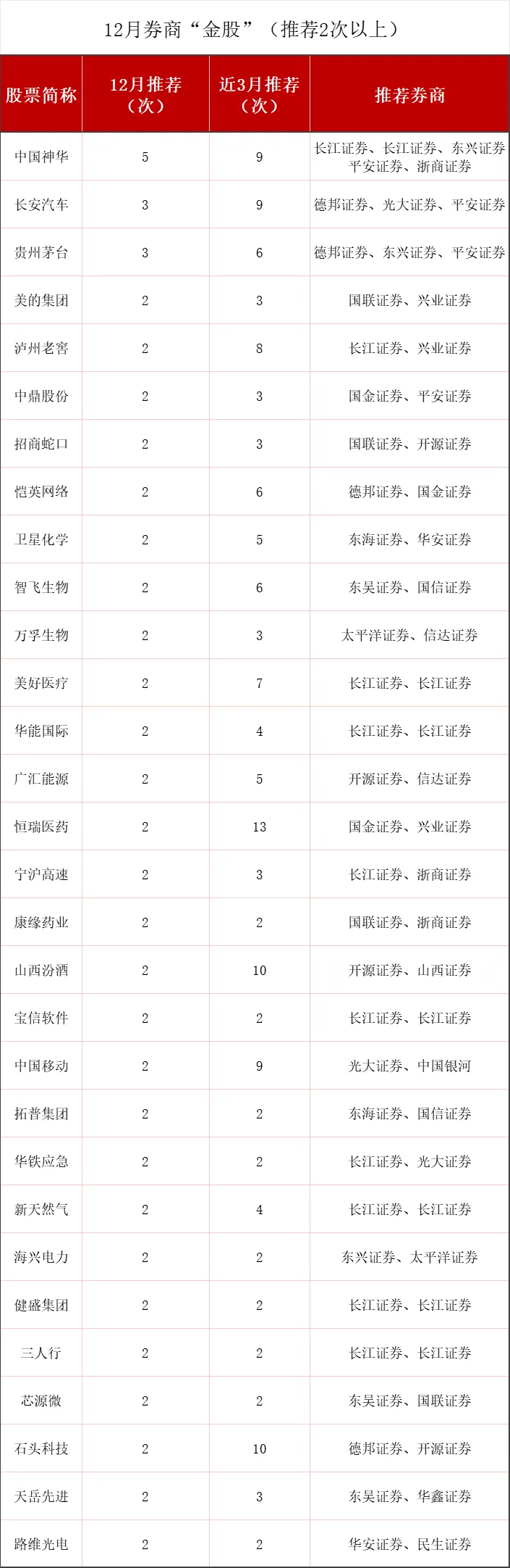 2023年来到末了一个月,新一月的券商“金股”又出炉了。 银柿财经注意到,相比此前,本年12月,券商们显得较为审慎,月保举金股199只,在数量上为年内初次低于200只。相比11月的276只,镌汰27.9%;同比客岁12月的302只,镌汰34.1%。 同花顺iFinD表现,12月的199只“金股”分布于29个行业。此中,“金股”数在两位数以上的行业共5个,分别为电子、医药生物、盘算机、汽车、食品饮料。与11月相比,行业排名上,电子取代医药生物荣登第一。 从个股上看,电子行业有3只个股分别得到2家券商保举,为芯源微(688037.SH)、天岳先辈(688234.SH)、路维光电(688401.SH); 医药生物有4只个股分别得到两家券商保举,为智飞生物(300122.SZ)、万孚生物(300482.SZ)、恒瑞医药(600276.SH)、康缘药业(600557.SH);精美医疗(301363.SZ)得到长江证券两次保举; 盘算机有1只个股得到长江证券两次保举,为宝信软件(600845.SH); 汽车行业的长安汽车(000625.SZ)得到3家券商保举,尚有中鼎股份(000887.SZ)、拓普团体(601689.SH)分别得到两家券商保举; 食品饮料业,坐保举第一名的为行业“一哥”贵州茅台(600519.SH),得到3家券商保举,相比上月增长两家,尚有泸州老窖(000568.SZ)、山西汾酒(600809.SH)分别得到2家券商保举。 12月的“金股”中,得到最多券商青睐的个股为中国神华(601088.SH),长江证券、东兴证券、安全证券、浙商证券共5位分析师做了保举,相对杀硐粥了3位。安全证券以为,未来随着经济规复,煤炭需求有望渐渐增长,煤炭代价中枢有望维持在较高水平,中国神华单季度归母净利润同比增速降幅较二季度收窄,红利环比增速由负转正,且对标可比煤炭及电力公司,中国神华的分红水平相对较高。 数据泉源:同花顺iFinD |