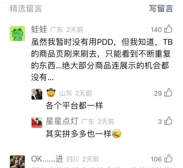 阿里巴巴的收盘市值遭拼多多赶超,失去中国电商巨头的第一把交椅,引发业内广泛热议。这放在三年前,险些全部人都以为不大概,但这却真实的发生了。 在市值逾越阿里之后,摩根士丹利将拼多多列为中国电子商务范畴的首选,以为在消耗者对代价日益敏感的配景下,该公司“处于最佳位置”。 拼多多最新公布的第三季度业绩陈诉表现,公司实现业务收入688.4亿元,同比增长93.9%,旗下跨境电商平台Temu的贩卖额已经突破50亿美元。 担心在拼多多买赝品,仅退款省时间,带来安全感 拼多多打败阿里,有一张图特别盛行——拼多多贬价+仅退款打败了阿里的一系列结构化、差别化、风雅化的方法论与组合拳。 拼多多仅退款曾经引发了巨大的风波,引发大量商家“炸店”风波,但是拼多多最吸引人的地方不是省钱,而是省时间。 信赖很多去拼多多购物的都担心买到赝品,但是拼多多的行业最优退款体验,就给了有这种疑虑的人最大的安全感。有网友表现: 双十一的时间这一点特别显着,该网友双十一买个剃须刀,去对比了一下,淘宝又是抢直播券又是叠加首单又是跨店满减,一轮轮叠加到末了,还得620左右才气拿下。 本质是靠优惠券机制筛选用户,利润最大化。 “拼多多则直接告诉你,来我这买,所见即所得,全网不敢说绝对最低,但是肯定是最低的之一。万一看到了更低的,嫌贫苦你就继续用,不爽你退款就是了。究竟,谁的钱都不是大风刮来的,同样的东西,一个600一个800,没人乐意多掏这两百。对于缺时间的人来说,想买什么,直接下单,竣事。这种购物体验,对比淘宝这真的就是降维打击了。” 简单来说。拼多多非常直接、简单、粗暴,它不怎么思量商家的诉求,但把用户的需求与人性洞察更准, 用简单粗暴的贬价+仅退款打败了淘宝的繁琐复杂。 淘宝在刚刚已往的双十一,广被诟病的优惠叠加,跨店满减,整点抢券,定金膨胀等,这种复杂的套路算下来还亏了,实在已经被诟病很多年了,但是一如既往没有改变,实在消耗者很智慧,知道那里自制,那里划算。 而从产物自己来看,淘宝的产物也被诟病。 现在有不少网友提到阿里的产物,“不说别的,先看淘宝APP,打开一堆没用的,我上来是买东西的,连个分类按钮都找不到。” “固然我临时没有效拼多多,但是我知道,TB的商品页刷来刷去,只能看到不绝重复的东西,绝大部分商品连展示的机遇都没有。” 如果单说跨境电商,阿里做的更早,做类似项目的的公司有不少,包罗shein,花了几年时间做到的gmv,隔断被temu逾越应该不远了。通过接纳全托管的模式,temu大幅低落了跨境电商的门槛,商家只需做好产物,剩下的都交给平台,赚的估计是少了很多的,但是真的非常省心。 太贪心了就会让对手有机可乘 拼多多乐成实在就两方面:一个是自制,别的一个是好退货,这背后是拼多多积极讨好用户的效果,这另一面是,拼多多对供应商压榨的非常锋利。对于被压榨,差别的人应该有差别的思索角度,作为股东大概投资者,对于公司压榨员工代价,压榨供应商代价的举动最少可以持肯定态度,固然不人性,但是资源、嗜血。 但淘天在已往迟迟不跟进百亿补贴,也不学拼多多搞仅退款,每年双十一商家提价再打折的征象非常多,消耗者年复一年的吐槽也缺乏改变,本质上,阿里在寻求消耗者长处与商家长处的平衡,钻营长处最大化。包罗我们看到淘宝直播带货的背后,实在是使用大数据流量分配机制举高流量资本,紧缩正常供应链条把手直接伸到了供应链顶端厂商,同时增长各种线上隐性资本。 很多大牌乐意入驻天猫不愿去拼多多,是由于天猫可以做到更好的利润,拼多多则会拉低品牌溢价。而阿里也会故意识平衡商家与用户的长处。对大牌商家的友好倾向是比力显着的,过分方向商家不可制止会伤害到部分消耗者的长处。 这分析一个标题,太贪心了就会让对手有机可乘。尤其是从本日的行情来看,外貌看是两个公司的市值在变革,实则上是各人的钱包在变革,不是全部人天天坐在办公室里收着快递,看动手机,买着自己喜好的东西,也不是全部人月薪都过万的,尚有很多人月收入2000~3000元的,消耗降级不是短暂的趋势,这几年,甭管都会、州里、五环外、五环内,各人都上头全网比价、寻求性价比。当前是很多人手头没那么宽裕,贫民还是占大多数的! 百亿补贴、拼单、仅退款等恰好接住,让人“占到自制”的感情拉满。 照现在态势发展下去,最怕的不是拼多多逾越阿里,而是逾越之后与阿里拉开差距。 未来两年,拼多多在外洋的对手,会是亚马逊 马云说本日的阿里人各人都在看都在听,更坚信阿里会变,阿里会改。全部巨大的公司都诞生在冬天里。 从长期来看,拼多多的潜力很可骇,有了友好的代价,再加上方便快捷的退货方式,那简直是打的各个平台无力还手,在外洋这种趋势已经出来。 阿里如今很伤害,由于电商的竞争力的核心不是技能,而是平台化规模,阿里自己只是一个巨大的平台。但如今阿里的平台化存在一些毛病,而平台化本质是争取用户与商家,争取商家本质是要争取用户,但拼多多在通过各种本领积极讨好用户,而阿里则在鉴戒翼翼的平衡用户与商家的两端诉求。 当下马云谈的改变还在聚焦所谓的产物创新、AI购物,但这实在不是重点,电商的核心不在于技能,而在于消耗者的人性需求与体验以及迎合消耗者当下要省钱、占自制的感觉、要实惠这个核心痛点,阿