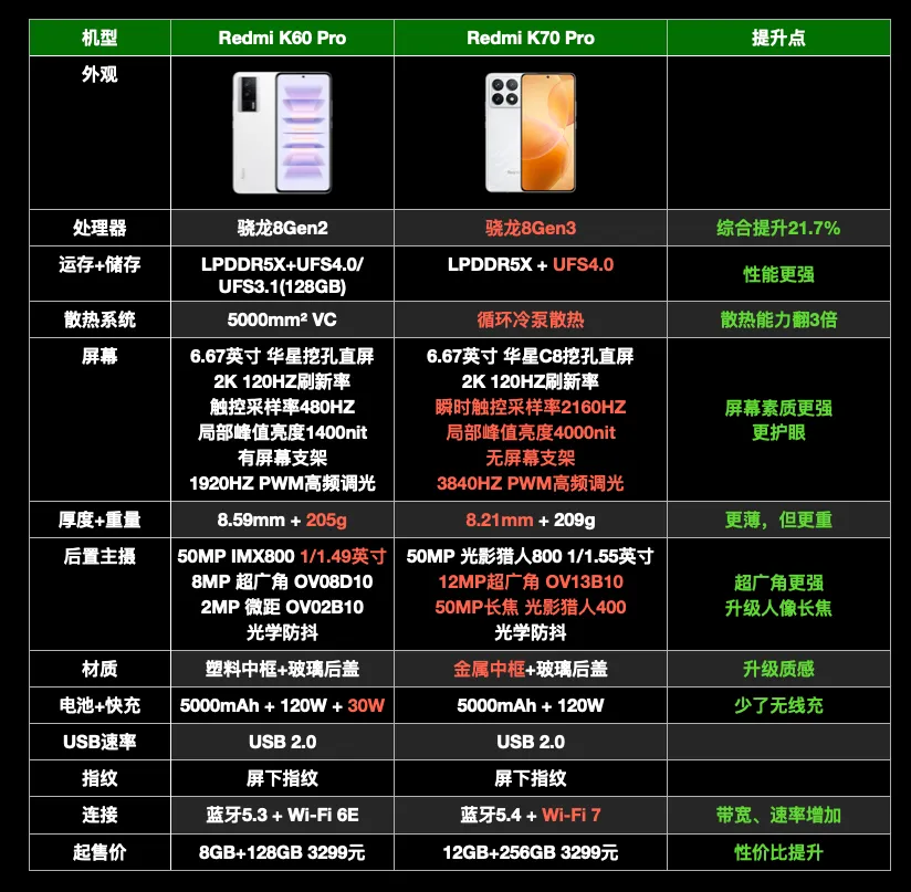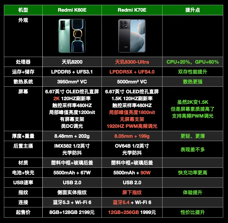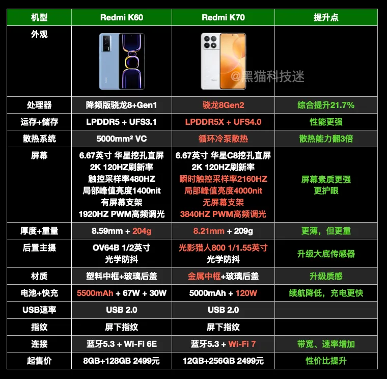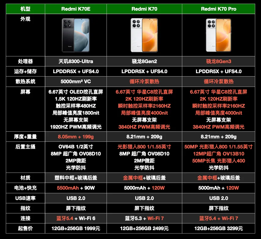 文|黑猫科技迷 序言 11月29日,红米K70系列发布会在北京举行。 我也受邀到场了,这次发布会比力特殊,不光要发布新品,还恰逢Redmi品牌建立十周年。于情于理,卢伟冰都要煽情一波。 卢伟冰先是回顾了历代红米手机的乐成,再是报告了小米和国产供应链之间的相助往事——比如和华星光电团结开发2K屏。 北京的气候固然很冷,但卢伟冰的攻击力拉满,全程高能,爆出了不少金玉良言。 比如拿IQOO的VC散热面积来举例,炮轰友商用9000mm的VC是不老实——“固然同宗同源,但是差别天职。” 显然,继红米K60被一加后发机型打了个措手不及后,卢总心有不甘,K70这次主打的就是“复仇”——不光要比你先发布,而且还不给反超的机遇。 十周年诚意之作,复仇光环加持,这句话用来总结K70再好不外了。 说回正题。 这次发布会,统共发布了3款新机:K70E(1999元起)、K70(2499元起)、K70 Pro(3299元起)。 为了让各人更好明确,这篇文章将按照下面2个思绪,序次睁开。 1,相比K60,3款新机重点提升了哪方面,又有什么倒退? 2,K70E、K70、K70 Pro的区别在哪,怎样选购? 天玑加持,K70E咸鱼翻身 K60E是没有存在感的一代,除了三星2K屏没有别的亮点,米粉甘心加几百去买K60。但K70E差别的地方在于,它遇上了联发科神U,而且双存没有缩水,属于咸鱼翻身。 天玑8300-Ultra比起天玑8200,CPU提升20%,GPU提升60%,综合性能略胜于骁龙8+Gen1,对隔代机型来说绝对是超预期的提升。 再加上K70系列的双存规格,全部同一为LPDDR5X+UFS4.0,性能可以说完全没遗憾了。 屏幕固然从2K降到了1.5K,但是峰值亮度提升到了1800尼特,而且去掉了屏幕支架(全系列),支持1920HZ PWM高频调光——更养眼,也更护眼了。 同时K70E还搭载了屏幕指纹,摘掉了中低端机的帽子。 别的,在同样搭载5500毫安电池,同样是6.67英寸的条件下,K70E机身厚度更薄,重量更低,这分析K70E的工业计划本领也有所进步。 最最关键的是,K70E的标配版从8+128,升级为12+256起步,乃至代价还降了200元——1999元起步。对不寻求相机体验的小搭档来说,K70E确实是够用了。 全面升级,K70不留死角 对次旗舰来说,消耗者最看重的无非就是性能。客观地说,K60最大的失误就是性能不敷极致,比如降频版骁龙8+,LPDDR5,这就给对手留了逾越的空间,作为先发机型很亏损。 K70最显着的变革,就是性能终于不妥协了。满血的骁龙8Gen2,满血的LPDDR5X+UFS4.0,只要是同价位机型,根本没有逾越的大概——卢伟冰果然不留手了。 要注意的是「循环冷泵」,根据小米高管王腾的科普,VC面积凌驾5000平方毫米的时间,边际效益趋近为0。而循环冷泵可以做到水气分离,散热性能是传统VC的3倍,技能上领先一代。 关键在于,Redmi K70搭载的屏幕也非常强横,它采取华星光电最新的C8发光质料,瞬时触控采样率提升到了2160HZ,局部峰值亮度可以到达4000nit,PWM调光频率高达3840HZ。 别的,这块屏幕针对护眼做了全面调教,官方称之为「小米青山护眼」,进一步办理OLED屏伤眼的标题。 相机方面,Redmi K系列标准版的相机不是重点,但这一次也提升到了均匀程度。K70搭载的主摄是光影猎人800(ov50E),传感器尺寸为1/1.55英寸,带OIS防抖。 比起上一代K60采取的OV64B,OV50E的低光场景拍摄本领,好了不止一点点。 同时,K70的快充升级到了120W,但是砍掉了无线充,电池降到了5000毫安,方案更加公道。中框材质也初次从塑料升级为金属,质感更强。网络性能也升级到了最新的Wi-Fi7,该提升的地方都有改进。 比起K60,K70可以说是无死角式的升级,方方面面有有涉及到。而且K70还加量不加价,12GB+256GB才定价2499元——要知道K60的8GB+128GB版本,起步价就2499元。 固然,红米K70性价比的提升,也有内存颗粒贬价的功劳,不管怎么说, K70是这场发布会最大的黑马,代价也充足到位。 全场景旗舰,K70 Pro革新底价 对红米K系列来说,Pro的存在意义在哪?实在用一句话就能总结:「最低价买最强芯」。不外从这一代开始,手机厂商开始在次旗舰市场上卷影像,因此相机也很告急。 和K70一样,K70 Pro的双存规格也是LPDDR5X+UFS4.0,搭载自研循环冷泵体系。比起K60 Pro,K70 Pro最大的区别在于处置惩罚器升级为骁龙8Gen3。 骁龙8Gen3固然是台积电N4P工艺,不是最新的N3。但它的CPU、GPU架构,比起骁龙8Gen2都有很大的改进。 生手看跑分,老手看能效。在同性能下,比起骁龙8Gen2,骁龙8Gen3的CPU功耗低沉34%,GPU功耗低沉38%,可以简单明确为:领先一代半。 至于屏幕方面,K60、K60 Pro的屏幕规格划一,而K70、K70 Pro的屏幕规格也一摸一样,因此结论和K70的部分是一样的——更强,更护眼。 关键是要看相机,相比K60 Pro,K70 Pro的3摄体系是全方面升级。 主摄的传感器改为定制的光影猎人800,超广角尺寸从1/4英寸升级为1/3.06英寸,充数的2MP微距,升级为50MP的光影猎人400人像长焦,比旗舰也差不了多少了。 3款手机选购发起 末了我们来答复一个标题:红米K70E、红米K70、红米K70 Pro,这3款手机应该怎么选?我们直接给结论,可以细看对比图。 1,红米K70E电池容量最大,机身最浮滑,天玑8300性能也够大多数人用了。不须要极致的性能和相机,可以选红米K70E。 2,红米K70综合来看性价比是最高的,骁龙8Gen2已经性能溢出,散热、双存、屏幕、快充、主摄和K70 Pro 一样顶级,不寻求超广角、人像长焦,无脑选它。 3,红米K70 Pro代价比红米K70高了800元,但是带来了更好的骁龙8Gen3,以及无短板的3摄体系,想要无短板旗舰的,直接选它。 以上就是红米K70系列3款手机的全