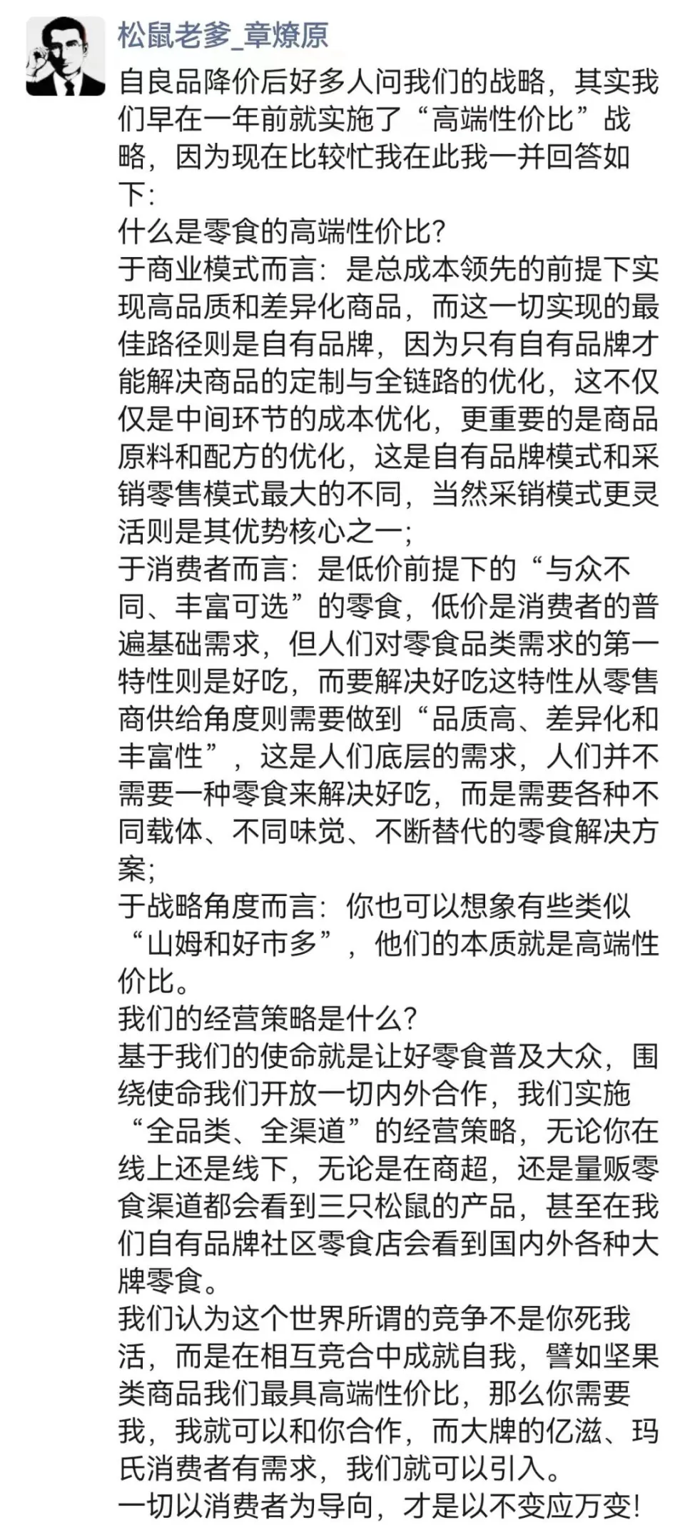 “高端零食”良品铺子贬价了。 11月30日,良品铺子公布17年来的初次最大规模贬价,门店在售300余款产物会员价匀称贬价22%,最高降幅45%。贬价背后,是需求在变,斲丧者越来越不愿意为高价零食买单了。 将来的斲丧者更想要“高端性价比”的零食。 就在刚刚,章燎原在朋侪圈对“高端性价比”做出公开回应,指出“高端性价比”三个关键点,从贸易模式、斲丧者需求和品牌战略角度对“高端性价比”做出了全面深度的论述。 将良品铺子贬价、章燎原朋侪圈公开回应和已往一年的团体经济形势放在一起看,我们可以得出一个结论:这事没那么简朴。 贬价背后,零食行业或将迎来一次深度调解,而三只松鼠又跑在了趋势前面。早在本年年初,三只松鼠就对外界公布了“高端性价比”的计谋,而这个“高端性价比”计谋的正式提出着实是在客岁年底,整整抢跑了一年。 假如要再穷究,三只松鼠抢跑了不止一年,而是六年。 1 早早结构,久久为功 回到六年前,2017年8月,三只松鼠在安徽无为投资了一个园区,项目分两期,总占地面积约890亩,集生产、检测、物流、研发、综合服务等多种功能区于一体。彼时新斲丧市场方兴未艾,许多国潮品牌代价疯涨,因此三只松鼠在无为建厂的消息并没有引起太多器重。 在外界看来,三只松鼠在无为建厂只是一次通例的扩张,是品牌走到高位后的一次进化,是其生态发展中的关键一步。 在随后的发展中,三只松鼠又推出云造体系,利用数字化云造体系买通从质料供应、食品安全检测、产物分装、储存保管、运输、产物流畅全流程环节的管理,紧缩从工厂到斲丧者的时间,进步管理服从。 同样,在外界看来这依然是生态进化的一定一步,彼时三只松鼠谁人体量深入供应链开启“智造”并不让人感到不测。 但是,如今转头再看,无论是无为建厂,还是推出云造体系,都没那么简朴,深入供应链的同时,三只松鼠早就开始了资源结构性的优化。 在这个过程中,三只松鼠以传统电商为焦点,聚焦新兴电商,将从订单到生产制造到交付斲丧者整个环节协同起来,实现供应链的纵向协同和渠道的横向协同,打造“1+4+1+N”的全品类全渠道本事。 所谓“1+4+1+N”,指得是包罗底层的供应链和品牌体系,4大新兴渠道,社区零食店及其他渠道,贯穿此中的就是高端性价比。 无论外界怎样解读,当前斲丧市场,“下沉”和“性价比”无疑是两个关键词,越来越被企业和斲丧者看重。闲鱼用户日渐生动,陌头上越来越多的餐厅开始做起自选式快餐生意业务,拼多多的市值突飞猛进。这些征象似乎都在表明,斲丧变得更加理性,人们越来越不愿意为品牌的溢价买单。 三只松鼠提出“高端性价比”战略,是站在趋势里的精确之选。正云云前公司首创人章燎原在继续媒体专访时所说,从整个大的斲丧层面来讲,更广阔的中下线市场斲丧已经觉醒,当前斲丧力紧张在中下线市场。“高端性价比”战略是符合整个大情况和大电商厘革的,各人想买到既好吃又自制的东西,这是共同的诉求。 在章燎原看来,“高端性价比”战略的本质是为斲丧者提供更加质高价优和丰富可选的全品类零食。产物性价比的提升并非单一让利,而是通过供应链全链路的优化确保产物风致的同时实现利润的溢出,并将这部门利润让渡给斲丧者,从而实现高质的同时兼具性价比。 2 由内而外,精耕细作 抢跑趋势听起来轻易,只要预判将来就行了,但着实否则,采购、生产到运营贩卖,这中心有无数个环节必要精致打磨。 先说采购,着实自创建以来三只松鼠就不绝在不绝优化采购,不绝通过规模化采购和技能赋能,将市场需求导向供应链,举行产、供、销的整合。这此中的重点内容有两个,一是不绝探求优质的原采地,二是推动技能力气在此中发挥紧张作用。 在供应链端,通过拓宽供应商泉源;部门坚果质料采购从国外转向国内;依托“直采直卖”模式与国际大型农场创建直接互助关系;优化自有工厂服从等方式,有用实现坚果产物资源低沉。在交付端,三只松鼠联合渠道计谋调解全面升级物流交付模式,在自有仓储业务根本上,积极探索产地仓和云仓模式,连合上游多家供应商推动工厂直发,进一步降本增效。 如许做的效果显而易见,据三只松鼠品类负责人体现,客岁线上售卖的量贩大袋装夏威夷果(500g)售价约为30元/袋,如今在天猫旗舰店售价为22.9元。本年双11期间,该产物贩卖额同比增长超50%。 在运营端,以京东自营渠道为例,基于精致化运营,三只松鼠适配了1.1kg、750g、500g等多代价带逐日坚果矩阵,6款大颗粒树坚果矩阵,频道定制坚果礼包矩阵,以分层代价带计谋,赢得了斲丧者承认。本年11月份,逐日坚果通用款在京东自营共售卖32.5万盒,贩卖额突破2200万元。 通过升级主动化生产装备、包装材质优化、产物克重重塑、极致发货模式探索-工厂直发、主图详情优化等,手撕面包终极团体交付资源低沉约18%,主流克重肉松饼相比客岁资源优化40%,从日销300箱发展为日销过万箱单品。辣卤大礼包超值装60包(售价19.9元)、特惠装75包(售价20.9元)、特惠装70包(售价19.9元)等,日销达1万+。 脱销品的界限还在不绝扩展,鹌鹑蛋、牛乳沙琪玛、风干牛肉、坚果礼盒、芒果干、鳕鱼肠、去骨凤爪等,销量直线上升,不胜摆列。 3 社区门店,高歌猛进 不但大家吃得起,还要随处买得到。酒香也怕巷子深,全品类天然也要适配全渠道。既然是全渠道,天