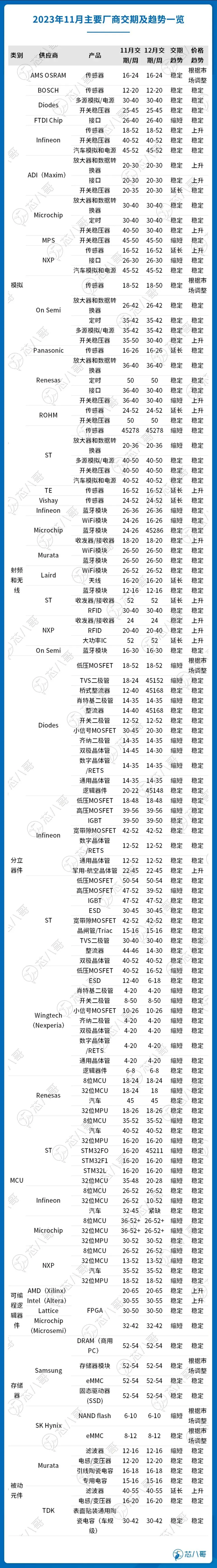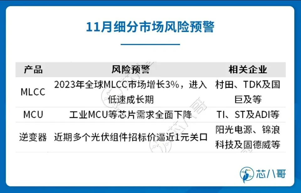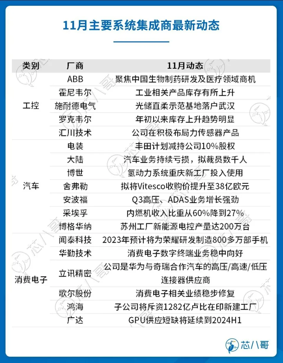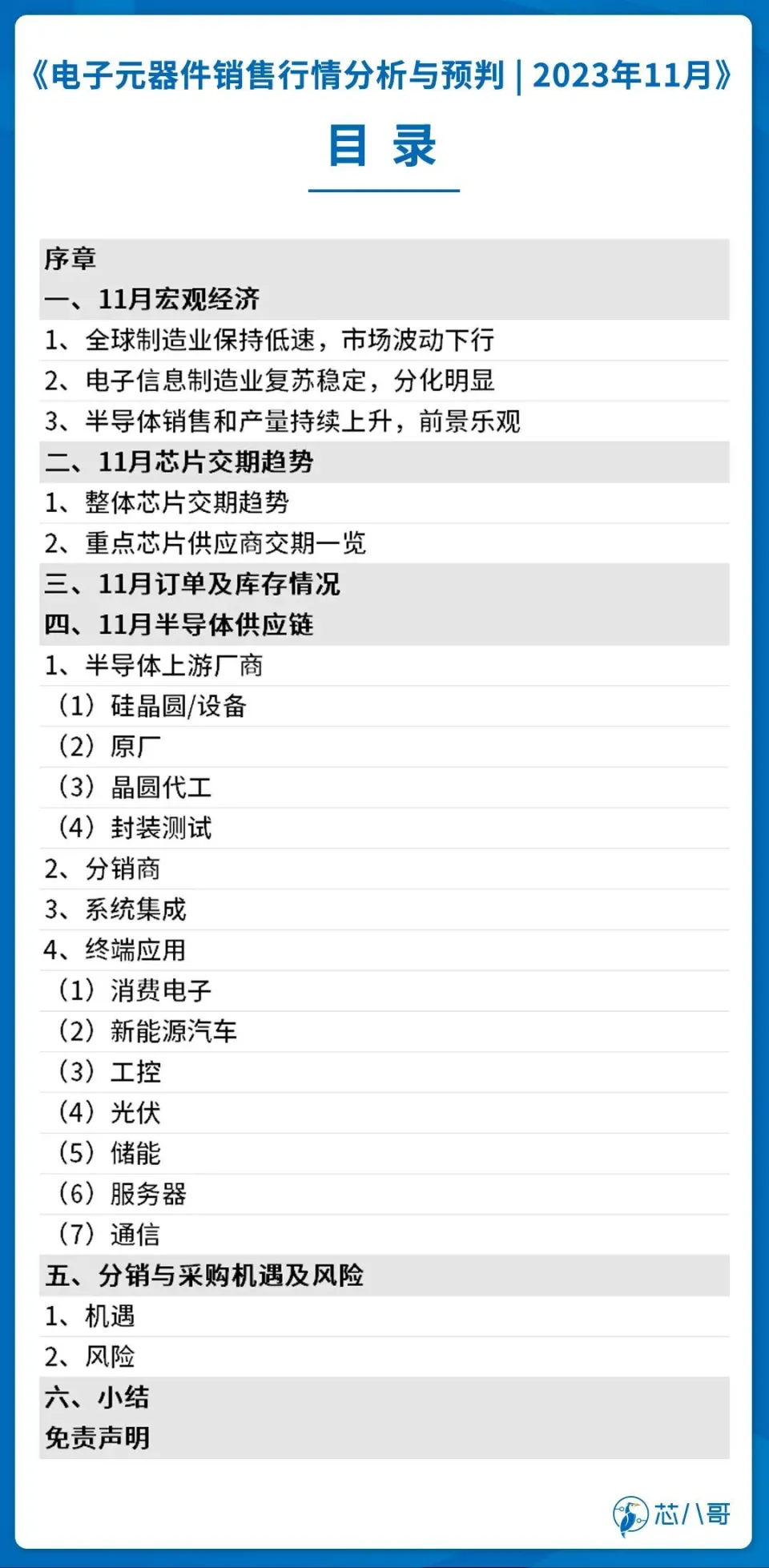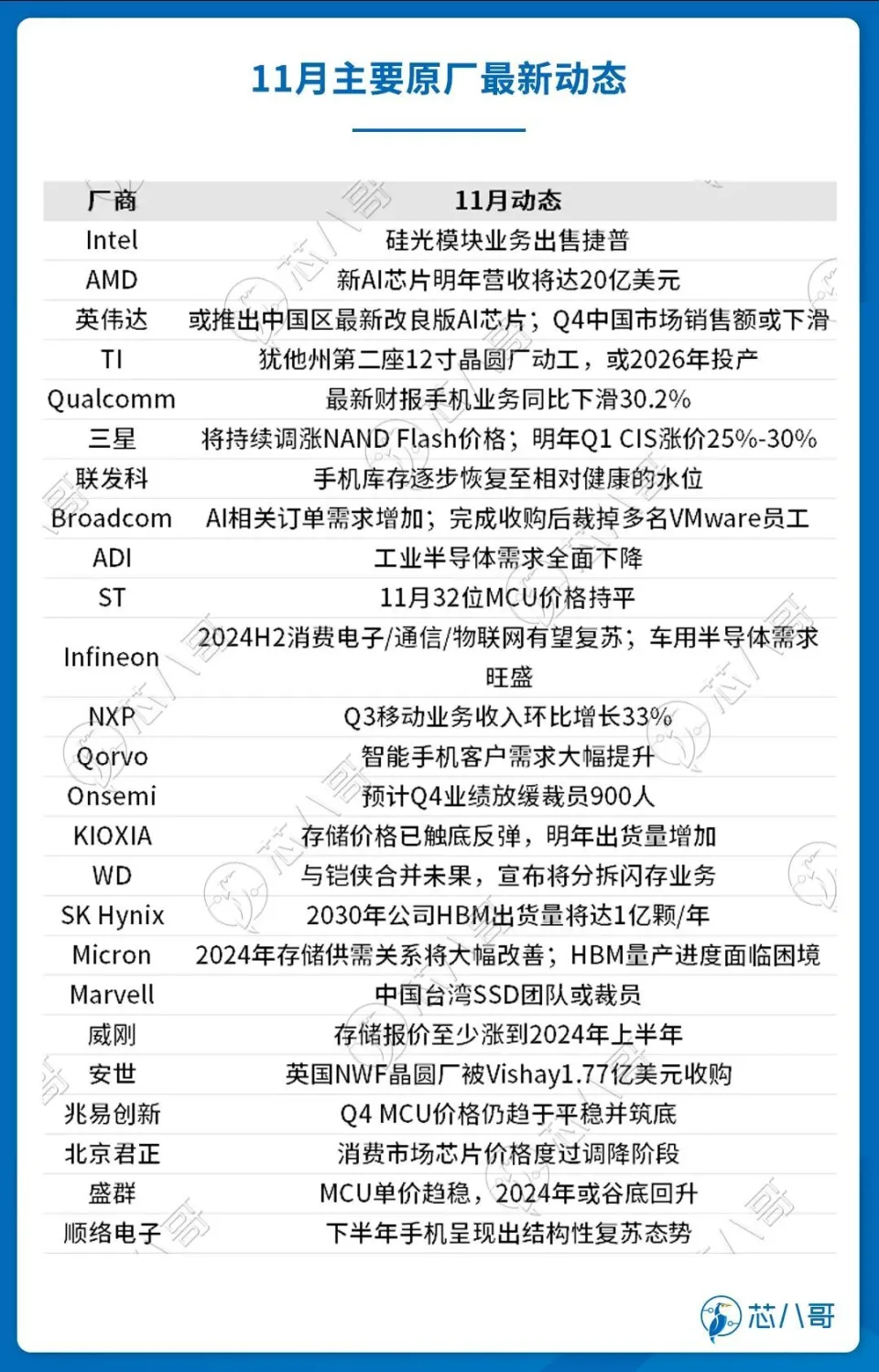 半导体人每月必看! 本文共1649字,预估阅读时间5分钟 11月宏观经济 1、举世制造业保持低速,市场颠簸下行 11月,举世经济不稳固特性显现,包罗中国、美国、欧盟、日本等紧张经济体出现颠簸下行态势。 11月举世紧张经济体制造业PMI 资料泉源:国家统计局 2、电子信息制造业复苏稳固,分化显着 2023年1-10月,中国电子信息制造业生产一连回升,出口降幅收窄,效益一连改善,投资稳固增长,地区营收分化显着。 资料泉源:工信部 3、半导体贩卖和产量一连上升,远景乐观 根据SIA最新数据,9月举世半导体贩卖额达448.9亿美元,环比增长1.9%,行业需求远景看好。 资料泉源:SIA、芯八哥整理 从集成电路产量看,10月份,举世集成电路产量约1048亿块,同比增长41%;中国产量达313亿块,同比增长34.5%,回升趋势显着。 资料泉源:工信部、SIA、芯八哥整理 收支口方面,10月中国集成电路收支口金额有所下跌,有肯定颠簸。 资料泉源:工信部、SIA、芯八哥整理 从资源市场指数来看,11月费城半导体指数(SOX)上涨13.18%,中国半导体(SW)行业指数上涨0.76%,市场信心有所下跌。 11月费城及申万半导体指数走势 资料泉源:Wind 11月芯片交期趋势 1、团体芯片交期趋势 11月,举世芯片交期一连向好,增速有所趋缓,承接力有所支持,预示库存去化趋近尾声。 资料泉源:Susquehanna Financial Group、芯八哥整理 2、重点芯片供应商交期一览 从11月各供应商看,交期一连紧缩,但仍处较高程度。部分存储型号代价开始回升,斲丧/工业等MCU代价进入筑底阶段,国产MCU厂商制止代价战。 资料泉源:富昌电子、Wind、芯八哥整理 11月订单及库存环境 从企业订单看,汽车需求维持增长,工业需求疲软,斲丧/IOT一连改善。团体库存一连改善,但仍处于较高程度。 注:高>较高>一样平常/稳固>较低>低>无 资料泉源:芯八哥整理 11月半导体供应链 装备/质料需求稳固,代工产能下跌,原厂订单颠簸,终端一连回暖。 1、半导体上游厂商 (1)硅晶圆/装备 11月,质料订单一连疲软,装备需求渐渐改善。 资料泉源:芯八哥整理 (2)原厂 11月,芯片需求复苏显着,斲丧类需求可见度较高。 资料泉源:芯八哥整理 (3)晶圆代工 11月,成熟制程一连贬价拉升产能,先辈制程需求稳固。 资料泉源:芯八哥整理 (4)封装测试 11月,行业头部厂商利润回升,订单渐渐回升,先辈封装需求量价齐升。 资料泉源:芯八哥整理 2、分销商 11月,元器件分销团体行情回升,存储需求改善显着。 资料泉源:芯八哥整理 3、体系集成 11月,工控需求疲软,新能源汽车需求增长,斲丧类需求修复。 资料泉源:芯八哥整理 4、终端应用 (1)斲丧电子 11月,智能手机及PC复苏高于预期,供应链需求回升。 资料泉源:芯八哥整理 (2)新能源汽车 11月,新能源汽车需求一连增长,东南亚市场成厂商结构重点。 资料泉源:芯八哥整理 (3)工控 11月,工控行业需求尚未显着回升,入口PLC代价部分涨价。 资料泉源:芯八哥整理 (4)光伏 11月,光伏行业量增价跌,内部竞争猛烈,库存去化一连。 资料泉源:芯八哥整理 (5)储能 11月,储能产能扩张出现显着放缓迹象,高速增长或不可一连。 资料泉源:芯八哥整理 (6)服务器 11月,传统服务器库存去化竣事,AI服务器需求快速增长。 资料泉源:芯八哥整理 (7)通讯 11月,行业订单需求低迷,库存仍处较高程度。 资料泉源:芯八哥整理 分销与采购时机及风险 1、时机 11月,关注存储产业链复苏时机,看好汽车及AI市场需求增长。 资料泉源:芯八哥整理 2、风险 11月,MLCC、工业MCU需求疲软,关注光伏产业链风险。 资料泉源:芯八哥整理 小结 综上,根据芯八哥研判,举世半导体月度贩卖额一连回升,Q2以来半导体厂商团体营收环比改善,库存去化靠近尾声。半导体行业由库存周期转向需求周期趋势显着,叠加近期智能手机新品对于市场复苏拉动,行业景气周期加速回调,重点关注国产智能手机供应链发展。 时至岁末,进入到本轮周期底部供需博弈的振荡阶段,行业在曲折中酝酿向上动能。在此阶段,半导体业者更需分辨各终端范畴此中蕴含的风险及埋伏时机,审慎应对行情反复,留意手头现金流状态,同时密切关注国际地缘政治、经济贸易及汇率厘革,适时调解供应链市场战略。 |