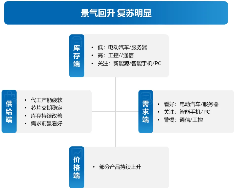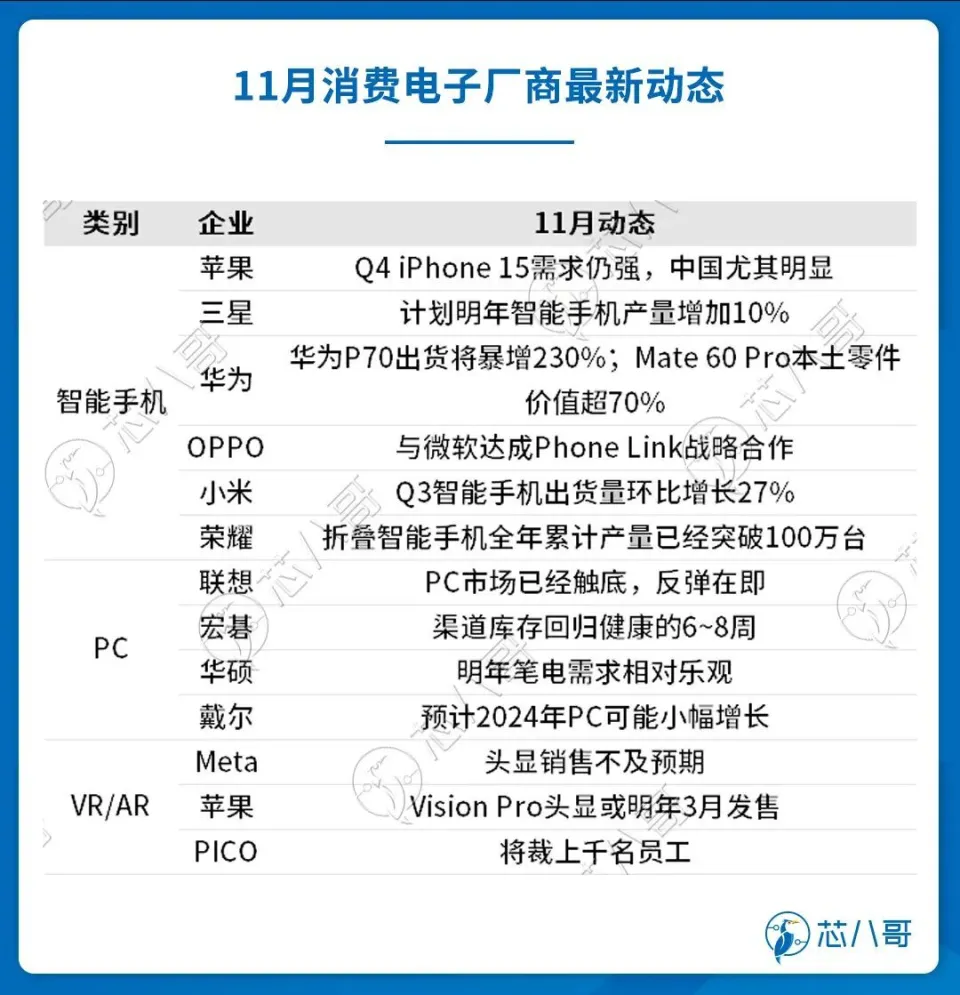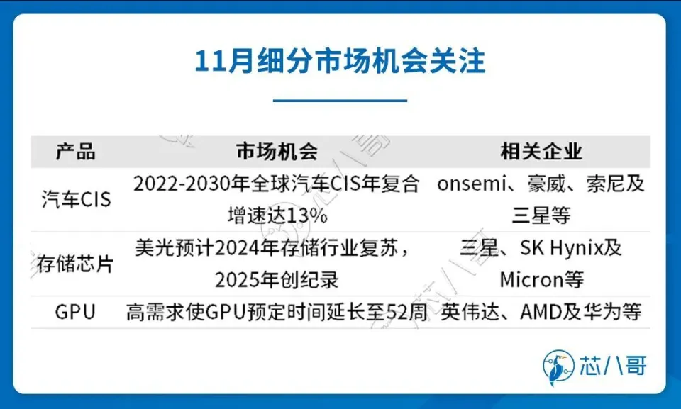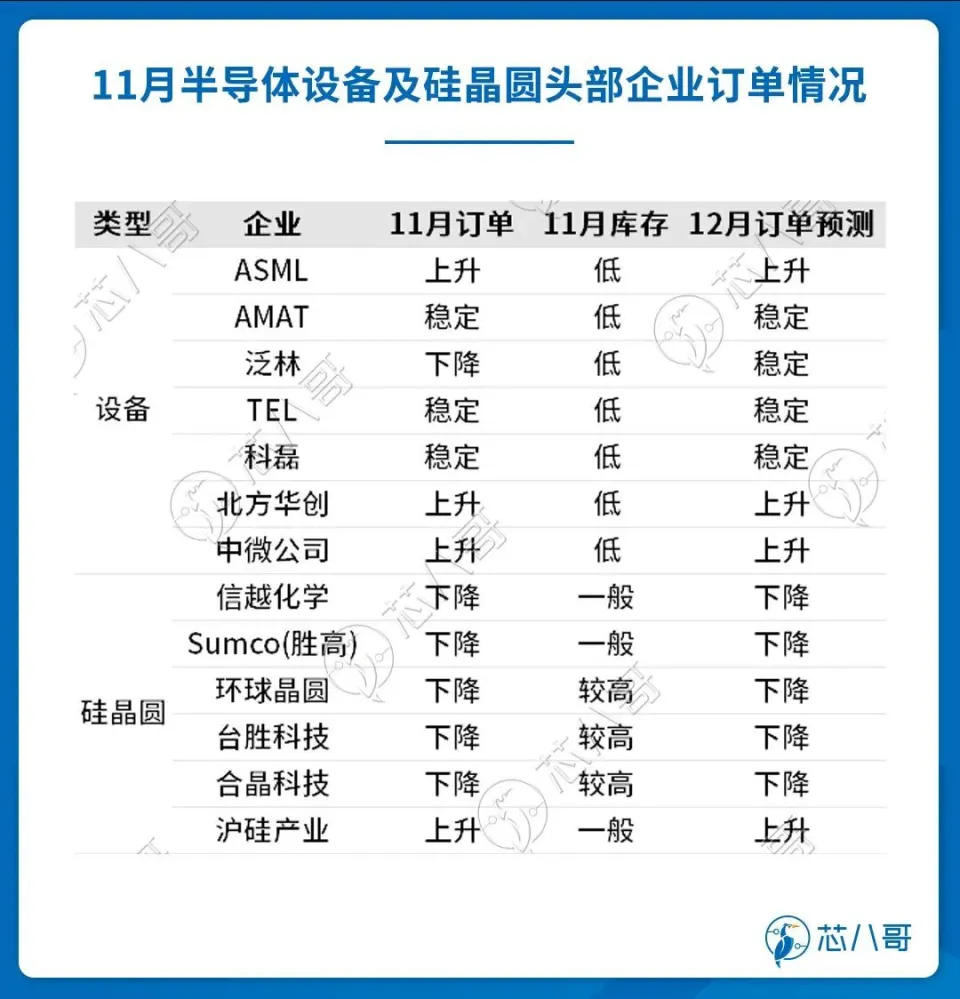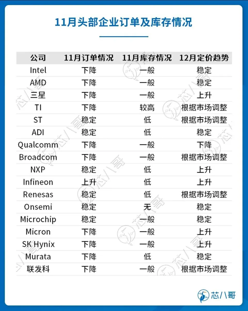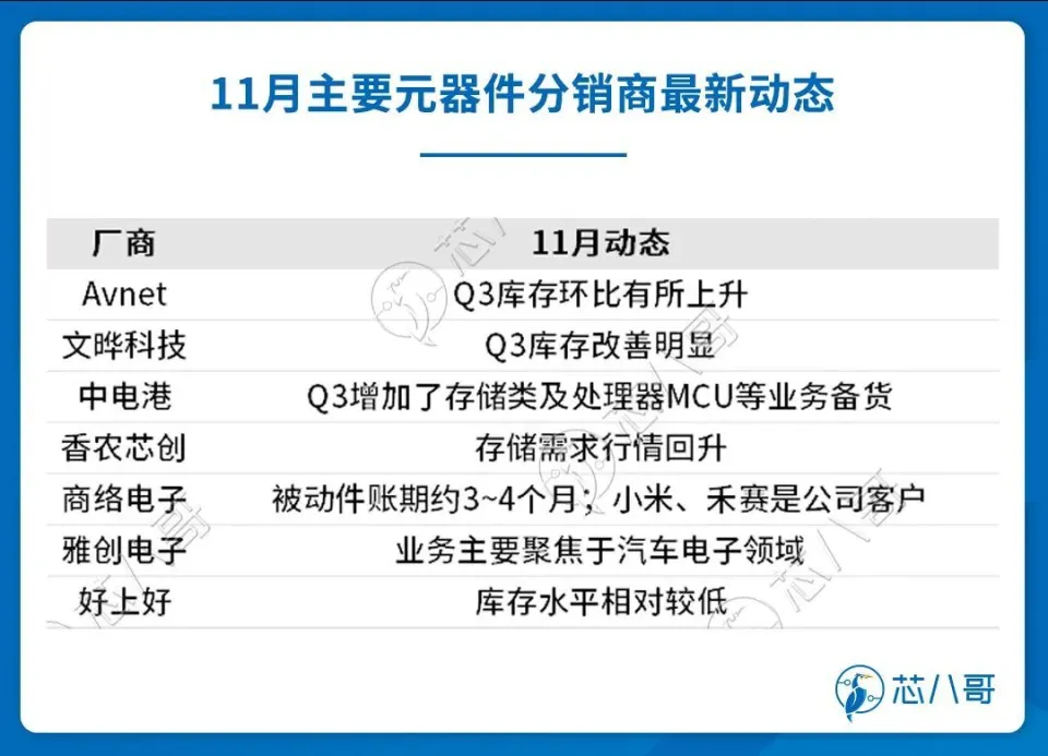 半导体人每月必看! 本文共1649字,预估阅读时间5分钟 11月宏观经济 1、举世制造业保持低速,市场颠簸下行 11月,举世经济不稳固特性显现,包罗中国、美国、欧盟、日本等紧张经济体出现颠簸下行态势。 11月举世紧张经济体制造业PMI 资料泉源:国家统计局 2、电子信息制造业复苏稳固,分化显着 2023年1-10月,中国电子信息制造业生产一连回升,出口降幅收窄,效益一连改善,投资稳固增长,地区营收分化显着。 资料泉源:工信部 3、半导体贩卖和产量一连上升,远景乐观 根据SIA最新数据,9月举世半导体贩卖额达448.9亿美元,环比增长1.9%,行业需求远景看好。 资料泉源:SIA、芯八哥整理 从集成电路产量看,10月份,举世集成电路产量约1048亿块,同比增长41%;中国产量达313亿块,同比增长34.5%,回升趋势显着。 资料泉源:工信部、SIA、芯八哥整理 收支口方面,10月中国集成电路收支口金额有所下跌,有肯定颠簸。 资料泉源:工信部、SIA、芯八哥整理 从资源市场指数来看,11月费城半导体指数(SOX)上涨13.18%,中国半导体(SW)行业指数上涨0.76%,市场信心有所下跌。 11月费城及申万半导体指数走势 资料泉源:Wind 11月芯片交期趋势 1、团体芯片交期趋势 11月,举世芯片交期一连向好,增速有所趋缓,承接力有所支持,预示库存去化趋近尾声。 资料泉源:Susquehanna Financial Group、芯八哥整理 2、重点芯片供应商交期一览 从11月各供应商看,交期一连紧缩,但仍处较高程度。部分存储型号代价开始回升,斲丧/工业等MCU代价进入筑底阶段,国产MCU厂商制止代价战。 资料泉源:富昌电子、Wind、芯八哥整理 11月订单及库存环境 从企业订单看,汽车需求维持增长,工业需求疲软,斲丧/IOT一连改善。团体库存一连改善,但仍处于较高程度。 注:高>较高>一样平常/稳固>较低>低>无 资料泉源:芯八哥整理 11月半导体供应链 装备/质料需求稳固,代工产能下跌,原厂订单颠簸,终端一连回暖。 1、半导体上游厂商 (1)硅晶圆/装备 11月,质料订单一连疲软,装备需求渐渐改善。 资料泉源:芯八哥整理 (2)原厂 11月,芯片需求复苏显着,斲丧类需求可见度较高。 资料泉源:芯八哥整理 (3)晶圆代工 11月,成熟制程一连贬价拉升产能,先辈制程需求稳固。 资料泉源:芯八哥整理 (4)封装测试 11月,行业头部厂商利润回升,订单渐渐回升,先辈封装需求量价齐升。 资料泉源:芯八哥整理 2、分销商 11月,元器件分销团体行情回升,存储需求改善显着。 资料泉源:芯八哥整理 3、体系集成 11月,工控需求疲软,新能源汽车需求增长,斲丧类需求修复。 资料泉源:芯八哥整理 4、终端应用 (1)斲丧电子 11月,智能手机及PC复苏高于预期,供应链需求回升。 资料泉源:芯八哥整理 (2)新能源汽车 11月,新能源汽车需求一连增长,东南亚市场成厂商结构重点。 资料泉源:芯八哥整理 (3)工控 11月,工控行业需求尚未显着回升,入口PLC代价部分涨价。 资料泉源:芯八哥整理 (4)光伏 11月,光伏行业量增价跌,内部竞争猛烈,库存去化一连。 资料泉源:芯八哥整理 (5)储能 11月,储能产能扩张出现显着放缓迹象,高速增长或不可一连。 资料泉源:芯八哥整理 (6)服务器 11月,传统服务器库存去化竣事,AI服务器需求快速增长。 资料泉源:芯八哥整理 (7)通讯 11月,行业订单需求低迷,库存仍处较高程度。 资料泉源:芯八哥整理 分销与采购时机及风险 1、时机 11月,关注存储产业链复苏时机,看好汽车及AI市场需求增长。 资料泉源:芯八哥整理 2、风险 11月,MLCC、工业MCU需求疲软,关注光伏产业链风险。 资料泉源:芯八哥整理 小结 综上,根据芯八哥研判,举世半导体月度贩卖额一连回升,Q2以来半导体厂商团体营收环比改善,库存去化靠近尾声。半导体行业由库存周期转向需求周期趋势显着,叠加近期智能手机新品对于市场复苏拉动,行业景气周期加速回调,重点关注国产智能手机供应链发展。 时至岁末,进入到本轮周期底部供需博弈的振荡阶段,行业在曲折中酝酿向上动能。在此阶段,半导体业者更需分辨各终端范畴此中蕴含的风险及埋伏时机,审慎应对行情反复,留意手头现金流状态,同时密切关注国际地缘政治、经济贸易及汇率厘革,适时调解供应链市场战略。 |