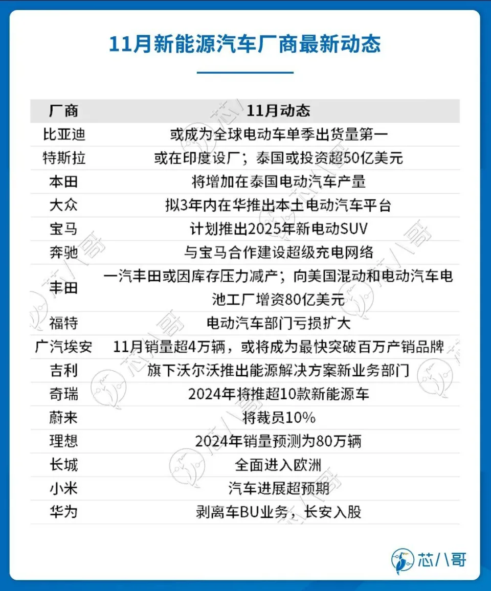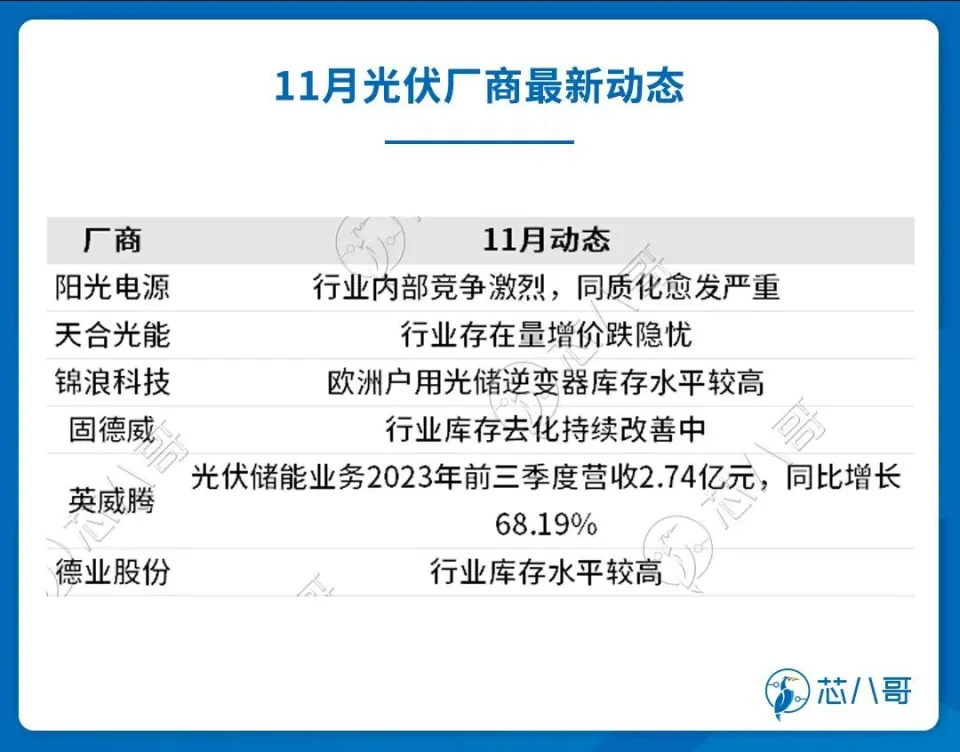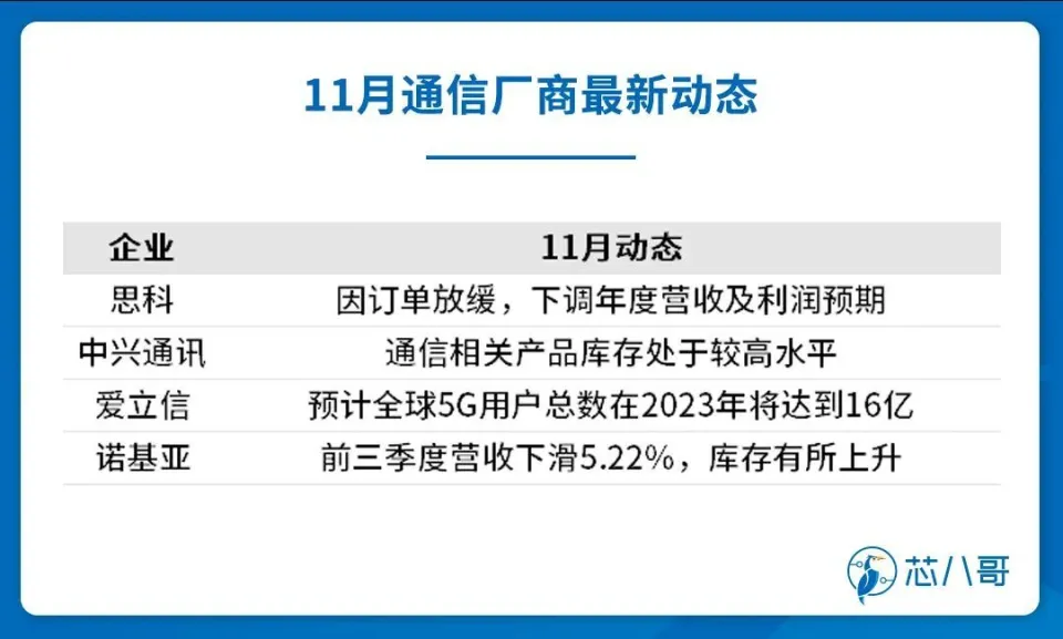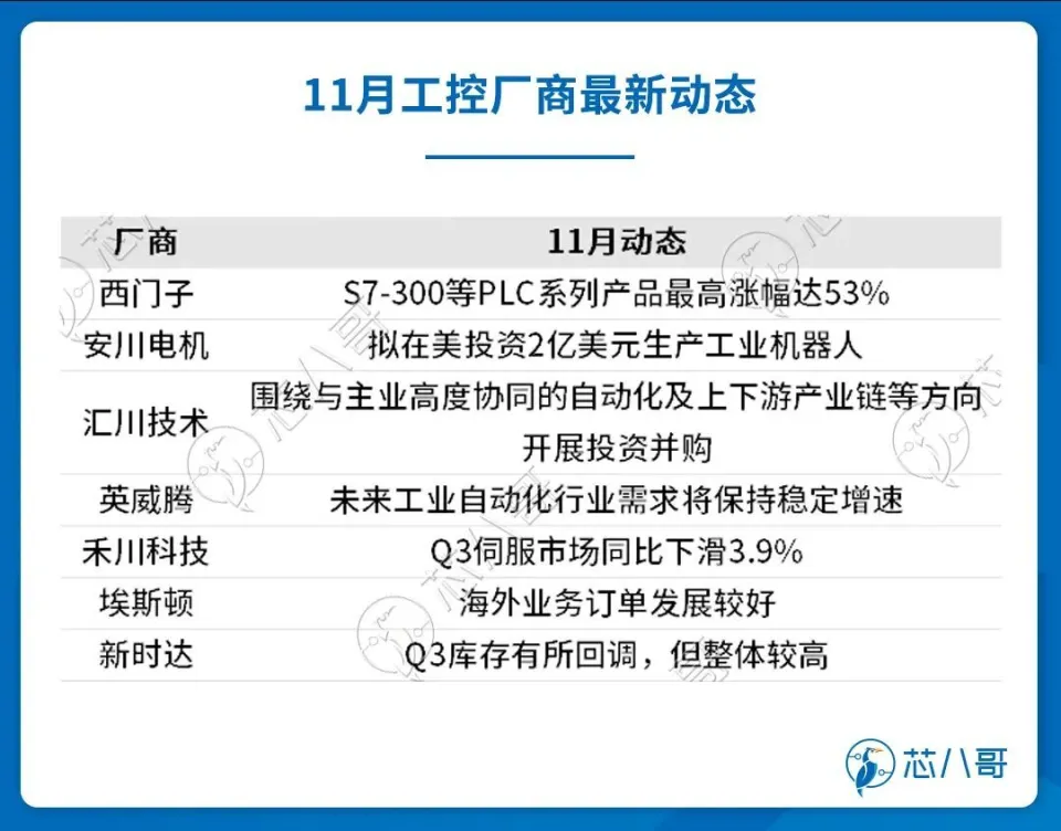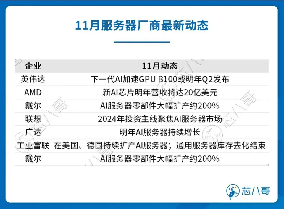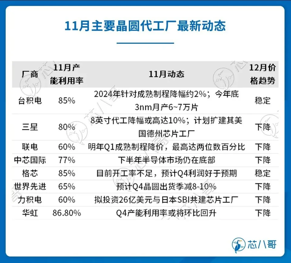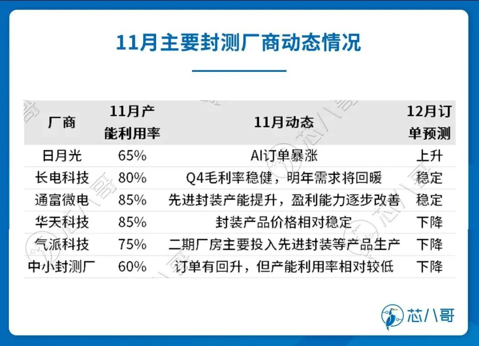 半导体人每月必看! 本文共1649字,预估阅读时间5分钟 11月宏观经济 1、举世制造业保持低速,市场颠簸下行 11月,举世经济不稳固特性显现,包罗中国、美国、欧盟、日本等紧张经济体出现颠簸下行态势。 11月举世紧张经济体制造业PMI 资料泉源:国家统计局 2、电子信息制造业复苏稳固,分化显着 2023年1-10月,中国电子信息制造业生产一连回升,出口降幅收窄,效益一连改善,投资稳固增长,地区营收分化显着。 资料泉源:工信部 3、半导体贩卖和产量一连上升,远景乐观 根据SIA最新数据,9月举世半导体贩卖额达448.9亿美元,环比增长1.9%,行业需求远景看好。 资料泉源:SIA、芯八哥整理 从集成电路产量看,10月份,举世集成电路产量约1048亿块,同比增长41%;中国产量达313亿块,同比增长34.5%,回升趋势显着。 资料泉源:工信部、SIA、芯八哥整理 收支口方面,10月中国集成电路收支口金额有所下跌,有肯定颠簸。 资料泉源:工信部、SIA、芯八哥整理 从资源市场指数来看,11月费城半导体指数(SOX)上涨13.18%,中国半导体(SW)行业指数上涨0.76%,市场信心有所下跌。 11月费城及申万半导体指数走势 资料泉源:Wind 11月芯片交期趋势 1、团体芯片交期趋势 11月,举世芯片交期一连向好,增速有所趋缓,承接力有所支持,预示库存去化趋近尾声。 资料泉源:Susquehanna Financial Group、芯八哥整理 2、重点芯片供应商交期一览 从11月各供应商看,交期一连紧缩,但仍处较高程度。部分存储型号代价开始回升,斲丧/工业等MCU代价进入筑底阶段,国产MCU厂商制止代价战。 资料泉源:富昌电子、Wind、芯八哥整理 11月订单及库存环境 从企业订单看,汽车需求维持增长,工业需求疲软,斲丧/IOT一连改善。团体库存一连改善,但仍处于较高程度。 注:高>较高>一样平常/稳固>较低>低>无 资料泉源:芯八哥整理 11月半导体供应链 装备/质料需求稳固,代工产能下跌,原厂订单颠簸,终端一连回暖。 1、半导体上游厂商 (1)硅晶圆/装备 11月,质料订单一连疲软,装备需求渐渐改善。 资料泉源:芯八哥整理 (2)原厂 11月,芯片需求复苏显着,斲丧类需求可见度较高。 资料泉源:芯八哥整理 (3)晶圆代工 11月,成熟制程一连贬价拉升产能,先辈制程需求稳固。 资料泉源:芯八哥整理 (4)封装测试 11月,行业头部厂商利润回升,订单渐渐回升,先辈封装需求量价齐升。 资料泉源:芯八哥整理 2、分销商 11月,元器件分销团体行情回升,存储需求改善显着。 资料泉源:芯八哥整理 3、体系集成 11月,工控需求疲软,新能源汽车需求增长,斲丧类需求修复。 资料泉源:芯八哥整理 4、终端应用 (1)斲丧电子 11月,智能手机及PC复苏高于预期,供应链需求回升。 资料泉源:芯八哥整理 (2)新能源汽车 11月,新能源汽车需求一连增长,东南亚市场成厂商结构重点。 资料泉源:芯八哥整理 (3)工控 11月,工控行业需求尚未显着回升,入口PLC代价部分涨价。 资料泉源:芯八哥整理 (4)光伏 11月,光伏行业量增价跌,内部竞争猛烈,库存去化一连。 资料泉源:芯八哥整理 (5)储能 11月,储能产能扩张出现显着放缓迹象,高速增长或不可一连。 资料泉源:芯八哥整理 (6)服务器 11月,传统服务器库存去化竣事,AI服务器需求快速增长。 资料泉源:芯八哥整理 (7)通讯 11月,行业订单需求低迷,库存仍处较高程度。 资料泉源:芯八哥整理 分销与采购时机及风险 1、时机 11月,关注存储产业链复苏时机,看好汽车及AI市场需求增长。 资料泉源:芯八哥整理 2、风险 11月,MLCC、工业MCU需求疲软,关注光伏产业链风险。 资料泉源:芯八哥整理 小结 综上,根据芯八哥研判,举世半导体月度贩卖额一连回升,Q2以来半导体厂商团体营收环比改善,库存去化靠近尾声。半导体行业由库存周期转向需求周期趋势显着,叠加近期智能手机新品对于市场复苏拉动,行业景气周期加速回调,重点关注国产智能手机供应链发展。 时至岁末,进入到本轮周期底部供需博弈的振荡阶段,行业在曲折中酝酿向上动能。在此阶段,半导体业者更需分辨各终端范畴此中蕴含的风险及埋伏时机,审慎应对行情反复,留意手头现金流状态,同时密切关注国际地缘政治、经济贸易及汇率厘革,适时调解供应链市场战略。 |