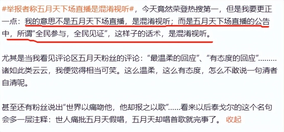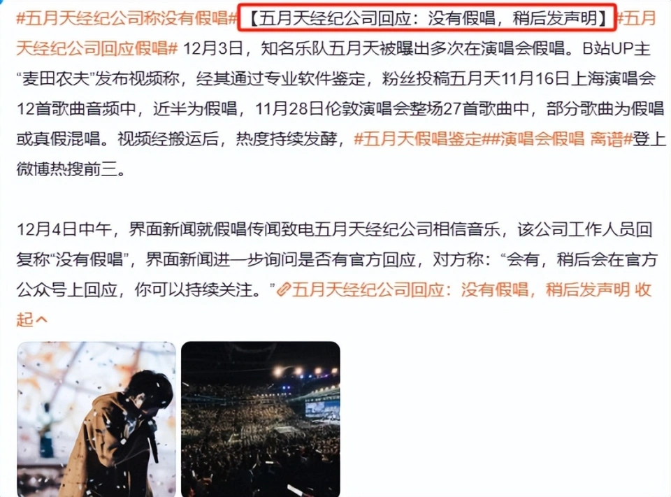 文案|罗生 编辑|喵三三 什么,五月天“塌房”了? 真的假的,这是要创死多少人啊? 作为华语乐坛的顶峰乐队,五月天跟周杰伦、陈奕迅等歌星的职位着实中分秋色了。无论是传唱度,还是国民度都不在话下。 对于许多80、90后的网友来说,五月天就是一代人的芳华追念。 而随着大情况的开放,越来越多的演唱会也重新开启。这不,五月天天然也“杀”回本地,让各人抢破头就只为抢一张演唱会的门票。 不外,眼下一位音乐博主关于五月天演唱会真假唱的视频分析在网上掀起了轩然大波。 拜托,这但是五月天啊,谁敢不要命去嘴他们假唱啊? 着实几个小小的博主去质疑五月天如许的歌坛巨星假唱,网友们一开始都不敢信赖。 但人家博主的视频有理有据,音轨分析相当细节。 博主直言“12首歌曲,居然有5都城是假唱”,此中不乏《干杯》、《满足》、《爱人错过》等经典爆款歌曲。 另有些歌曲是真唱与假唱掺着来,前一秒还是大叔音,下一秒就是少年音,居然连近期的灌音版本都懒得录制吗? 他真的,我哭死。 总之,看完视频分析,懂行和不懂行的网友,全都沉默沉静了。 不但云云,另有人表现要以菲薄之力向消协举报五月天,依附着后者的热度,相干词条敏捷冲上热搜,这事可闹大了。 要知道无论五月天的咖位有多大,一旦假唱消息属实,那可就是违背了《业务性演出管理条例》,也陵犯了消耗者的合法权益,属于违法举动。 轻则罚款,重则禁演。 更紧张的是,这件事假如不给各人一个妥善的交代,大概反面还会有其他歌手争先效仿,到头来丧失的只能是歌迷们的长处。 舆论争议云云之大,相干部门天然不能坐视不管。 中国演出行业协会工作职员称:已关注到此事,现在正在等文化执法部门的处理惩罚效果。 新华社发文中写道:上海文旅局执法总队回应已按照《业务性演出管理条例》要求主理方共同观察,待有关情况依法核实后,将及时回应网友关切。 央视消息官方媒体称:五月天演唱会音视频已提交稽察部门。 也就是说,此事已经进入到观察阶段,信赖很快就能给网友们一个表明。 而眼看着骂声越来越大,本以为五月天官方会尽快回应,没想到“信赖音乐”官方媒体账号率先给出的居然是下一次演唱会的消息。 字里行间也不乏“全民到场、全民见证”、“现场直播”等字眼,似乎在暗戳戳地表现自己的明净。 但这和上一场的演唱会又有什么关系呢?直播就算全程真唱也不能证明之前没有假唱过吧。 云云肴杂好坏的话术,还不如不表明呢!也意味着再一次将五月天推到了风口浪尖。 而后五月天经纪公司工作职员又回应道:没有假唱,稍后会发声明。只是不知道这一次究竟还会不会让网友们买账了? 着实这已经不是五月天第一次被质疑假唱了,演唱会上对口型失误的视频有不少,另有一些镜头里能显着看到阿信将发话器拉远后,声音的巨细没有任何改变。 懂得都懂吧? 可以明确一些歌手由于年事太大,现场演出没办法做到完美无缺,就连周杰伦的现场都有一些网友吐槽。 但无论是多大年事,状态怎样,“真唱”永世都应该是歌手的底线,而这个底线不能破。 只惋惜不是全部人都能守住这个底线的。 “天后”在演唱会上被人撸走了手上的戒指,情急之下光顾着喊“戒指还我”,却忘记了音响里的歌声还在继续,因此被质疑假唱。 但对此那英的复兴居然是:“什么是假唱?我是假唱吗?那灌音也是我自己唱的啊!” 这一番话属实说的不嫌怕羞了,假如可以用灌音取代现场,那观众费钱买灌音不就好了?何必多花大代价来演唱会呢。 固然,有本心的歌手无论什么情况都会选择朴拙地面对观众。 薛之谦在一次演唱会上因高烧与扁桃体疾病无法正常演唱,却没有选择假唱乱来观众,而是亲身上台,并用跪姿向观众表现歉意。 过后他也提供无偿退票的服务,以致答应报销外地歌迷们往外机票和旅馆过夜费用。 有的歌手费经心思“割韭菜”,有的歌手却费经心机只管将歌迷的丧失降到最低。 果然是没有对比就没有伤害啊。 同样备受的好评的另有陆虎,别看他人气不算高,但歌手的原则不能丢。 在演唱会上他也因身材缘故原由一度对峙不下去,声音断断续续,却还是强撑着一口吻真唱。 而配景下的张远跑上来为兄弟撑场子,大合唱看得人眼泪汪汪。 另有魏晨,在某次运动现场大概是没有提前沟通好音频,,他的发话器还未打开就已经出现了歌声。 而魏晨却直接表示停息要求重唱,并说:专业歌手不假唱。 歌手的态度,在这一刻让歌迷有了最直观的感受。 崔健曾说:“真有才气的艺术家,还真就不假唱,拼就拼这一点。” 韩红也说:“技能职员可以用科技本领让歌手唱不上去的地方也能唱上去。但你作为一个歌手来说,(假唱)非常不应该,由于你就是吃这一碗饭的。” 对,没错,真正良好的歌手都是以假唱为耻的。 假如连直面自己声音和唱功的勇气都没有,那另有什么资格站在舞台上面给那些支持你的歌迷们演出? 五月天演唱会风波着实也让全部人意识到,即便是再着名的歌手,一旦对演出敷衍了事,也会遭到反噬,自食其果,以致被天下封杀也不为过。 固然,眼下假唱还是真唱,效果还没有确定,必要以官方发布的信息为主。 但这件事无疑是给娱乐圈全部的歌星敲响了一个警钟,爱惜羽毛,恭敬职业,比什么都紧张。 那么你以为五月天是假唱吗? |