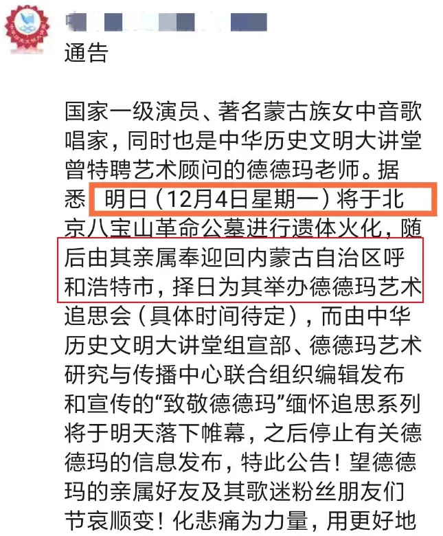 11月28日,著名歌手德德玛离世,享年76岁。家人在讣告中写道“歌唱家德德玛于2023年11月28日13点42分因病医治无效在北京逝世”,随后透露她走的很安详,生前并没有遭受痛楚,是在睡梦中脱离。消息曝光后,无数网友争先哀悼,为她的脱离感到伤怀。 12月4日,德德玛的追悼会正式在北京八宝山革命公墓举行,待追悼会竣过后,家人会将她的遗体火化,将骨灰送回内蒙古自治区呼和浩特市下葬,择日再为她举行追思会。 一早便有很多市民自觉来到八宝山,兰厅门口上写着“深切吊唁人民歌唱家德德玛”,走进门厅后,有屏幕循环播放德德玛的生前贵重影像,下面另有黄白色相间的菊花。 德德玛在圈内因缘广,腾格尔、斯琴高娃、杨丽萍、杨坤等人早早的就送来了花圈,摆放在兰厅的一旁。 前来哀悼的粉丝们自觉列队,手持菊花来送德德玛老师末了一程。本日会有不少业内大咖现身,德德玛老师德高望重,想来送她末了一程的人很多。 只是没想到德德玛老师在北京定居多年,生前的唯同心用心愿照旧回故乡安葬,不外也可以明确,这才实现了真正意义上落叶归根。 德德玛老师之以是受人恭敬,是由于她会与歌唱古迹做出了突出成绩,她1978年依附歌曲《漂亮的草原我的家》一举成名,而后进入中心民族歌舞团担当独唱演员。 在从业的几十年中,她先后得到“天下听众最喜好的歌唱演员”大赛美声唱法“濠江杯”奖、“天下十大女歌唱家”大赛第一名、蒙古国国家文化艺术最高奖,19年还登上了春晚的舞台,独树一帜的唱法给人留下了深刻印象。 德德玛老师暮年身段状态不佳,她暮年不绝在控制体重,就在脱离前的几个月,还透露自己在减肥,吃得非常康健。想必也是身段给她的生存带来了肯定的影响,她才开始下定刻意控制。 不外她脱离的根本缘故起因,是由于脑梗后遗症引发癫痫,其孙女在交际平台写下长文,透露奶奶由于脑梗进入ICU,固然每天都在被病痛折磨,但是想要病愈的心非常刚强,不绝积极共同治疗,还出院和家人团圆。 然而天不遂人愿,由于年龄已高再加上后遗症的缘故起因,她终极照旧难敌病魔,在家人的伴随下脱离了人间。癫痫发作原来就非常凶恶,何况她自己就已经有根本病,根本无力和病魔抗衡。 现在德德玛老师脱离人间,对歌唱界也是一大丧失,在这里也渴望她一起走好,愿天国没有病魔。 |