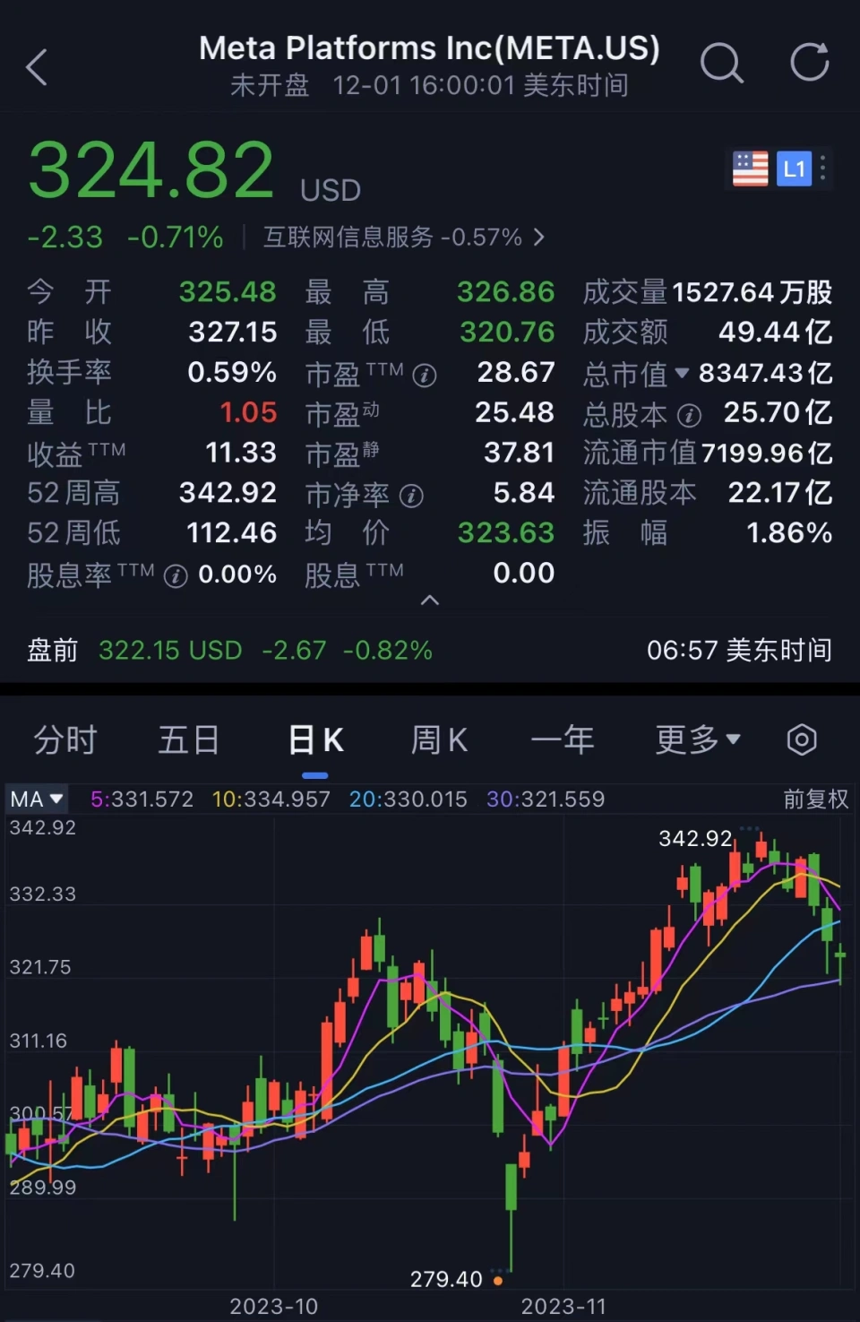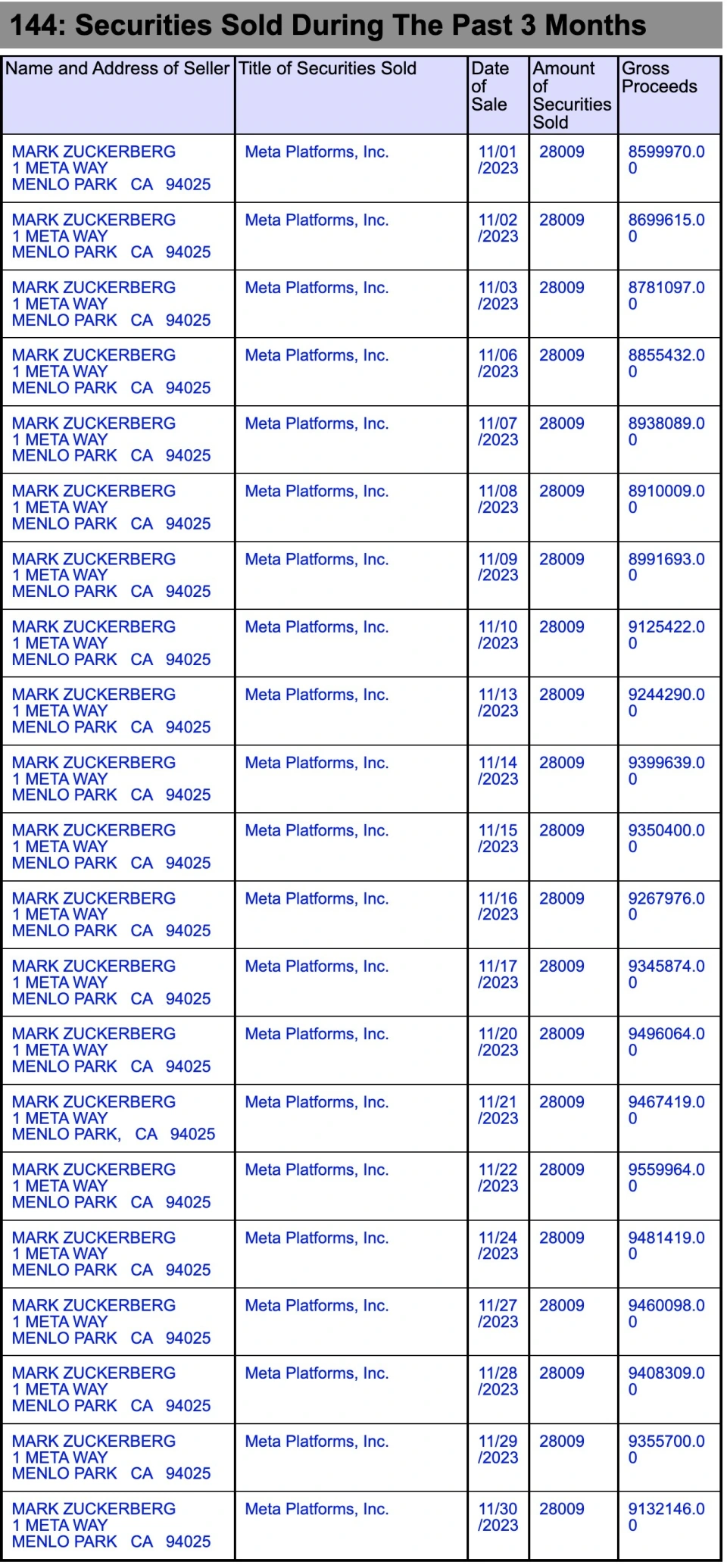 腾讯科技讯 12月4日消息,外媒报道称,Meta公司股票在11月份一度上涨,到达近两年的最高点,其CEO马克·扎克伯格11月险些每天都在抛售,累计金额近2亿美元。 根据美国证券买卖业务委员会的Form 4文件,扎克伯格在11月份每天都在出售Meta的股票,克制11月29日,统共出售超56万股,出售的股票代价约1.929亿美元。 Meta股票在11月份上涨了8.6%,连续第三个月实现增长,在11月22日收盘时到达了341.49美元的最高价,这是自2021年12月30日以来的最高收盘价,之后有所回落。Meta股票本年涨幅超170.4%。 扎克伯格出售的大部门股票是在2004年其作为“首创人股票购买”的一部门得到的。近15万股出售的股票是在出售当天以0美元的代价通过利用2013年得到的期权得到的。 根据迩来的文件,扎克伯格仍然持有约莫凌驾3.65亿股。根据彭博亿万富翁指数,克制12月4日,扎克伯格在富豪榜排名第九,净产业约1180亿美元。 固然一个月内出售代价凌驾1.9亿美元的股票听起来很多,但根据已往30天的日均买卖业务量19.18万股,Meta的股票每天匀称买卖业务额凌驾62亿美元。(编译/小北) |