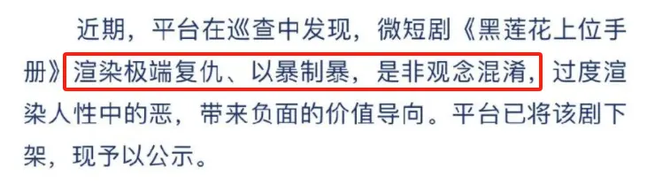 近来,一股霸总风,刮到了美利坚。 在国剧市场被嗤之以鼻的国产霸总爽剧,开始出征外洋,在西欧文化圈攻城略地。 白富美被男友囚禁心痛欲绝、灰姑娘入赘权门碰到毒辣继母、产业被夺的令媛小姐开启复仇之路…… 这剧情,眼熟吗? 再看名字: 《再见,我的总裁大人》、《致命勾引》《我的亿万富翁丈夫的双重生存》…… 富足狗血,富足辣眼,结果却富足响亮。 在外洋市肆里,专攻霸总短剧的APP“ReelShort”,冲上榜单首位。 霸总剧多为付费点播,一聚集人民币五六块,100多集就是五六百块。 这门好生意业务,在国外风起云涌。 但在国内,如今却冰火两重天。 依托于短视频平台的网文爽剧,近来正在成规模的下架。 这内里,有一部短剧,被指名道姓点了出来:《黑莲花上位手册》。 不久前,该剧上线,一天吸金超2000万,比网大更卖座,比网剧更受接待。 不外,刚爆5天后,该剧又被告急下架,“出道即顶峰”,自此杳无音讯,账号也变成了私密。 该剧的下架,掀起了不小的波涛。 对它该不应下架的缘故原由,众说纷纭。 但榜单里,类似的短剧仍旧风起云涌,均匀观看均超700万。 在圈钱烂剧横行的当下,怎么就容不下一部单集几分钟,剧情直给的复仇爽剧? 我们对影视作品的容忍水平,到底是进步了,还是低沉了? 01、该不应下?要不要下? 还拿《黑莲花上位手册》提及。 一部剧下架,观众自动分成两派。 一派,反对,“比如今很多古装剧要悦目很多”。 一派,力挺,“如许的人(剧),确实应该封杀”。 各人各执一词,各执己见。 那么这部一百多集的爽剧,讲的到底是什么? 剧如其名,相当直给,“黑莲花上位”,就是整部剧的剧情。 女主是个“美强惨”,家人被陵暴死,于是从“小白花”秒变“黑心莲”。 进宫后不但步步高升,还不择本领,铲除异己,为家人报仇,行事凌厉,狠辣果断,突出一个“宫斗森林法则”。 这种以牙还牙,以血还血的剧,丝绝不拖沓,没有任何废戏,就像将全部女频爽文的爽点全部会合在一起,在很短的时间内全部开释。 要的就是一个爆炸爽的结果。 这部剧改编自番茄爆款小说《昭华乱》,自己就是一本“大女主爽文、高智商宫斗、女主算计全后宫、疯批反派性格的小说”。 转成画面,打击力更强。 以是,《黑莲花上位手册》不留丝毫中央地带,喜好的人,冲的就是它自带的女频爽点。 不喜好的人,骂的就是它简单直给的剧情。 看完几集,皮哥大概明白了,平台下架缘故原由中的这几个评价词: “渲染极度复仇,以暴制暴,黑白观念肴杂,过分渲染人性中的恶”。 用暴力办理暴力,用自己的恶,对别人的恶,看似是天经地义。 但过于直白,强行,毫无遮拦地显现这种代价观,却不符合。 这种剧该不应下,要不要下的题目,我们还要从两个维度来思量。 第一个维度,是行业。 网友有所不知,这种曾经被不少人驳倒“又土又low”的剧,在当下,已经是一片蓝海的搏杀现场。 竖屏网络短剧,被称为“2023最赢利赛道”,其市场规模达373.9亿元,同比增长267.65%,2027年中国网络微短剧市场规模将超1000亿元。 不但爱优腾三家长视频龙头切身了局血拼,就连抖音快手,也推出了自己制作的短剧系列。 (腾讯短剧《大妈的天下》) 这个千亿的市场,全部的投资人都像红了眼的狼一样盯着。 而当一个行业刚刚开始,势必免不了蛮横生长,良莠不齐,杂草丛生的现状。 在这个时间,就须要国家和干系部门羁系,在行业发展初期就拨乱反正,这才气从源头包管,微短剧市场的公道化运行。 我们已经履历过网络大影戏的乱象丛生,十年已往,擦边色情,血腥暴力仍旧横生。 微短剧市场,绝不能重蹈覆辙。 第二个维度,是影响。 最恰当拍短剧的文章,是什么? 是那些苦苦找不到投资的网文IP。 这些IP常常包罗着色情低俗、血腥暴力、不良代价观等等糟粕,但在杀红了眼的制作人手中,这些IP却都是能生出金蛋的香饽饽。 为什么? 不就是由于这些脚本,都跟《黑莲花》一样,刺激又直给。 它们根本都靠氛围感和感情宣泄赢得受众,不讲逻辑不讲被页粳只讲人设和情节。 用最低俗的方式,撩拨观众最轻易被触碰的神经。 那么,这些短剧,赚的又是谁的钱? (手机中的短剧广告) 说出来各人大概不信,此类短剧的核心受众,多数是家庭主妇,底层工人,村镇青年,尚未出到社会的门生。 这些加起来,有一个名词,叫“下沉市场”,实质上,它的受众比下沉更下沉。 有媒体研究过短剧爆改热区IP“多宝文”的核心读者,女性比例占超9成,29岁以下占超三分之一,超7成读者,学历在大专或本科以下。 在这些短剧的代价观体系里,天下每每非黑即白。 跟《黑莲花上位手册》一样,不是你弄死我,就是我弄死你。 男频短剧,迎合男性一夜暴富的理想,或是征服女性的快感,或是穿越后无所不能的超本事。 女频短剧,迎合女性从饱受陵暴的主角到上位复仇的理想,或塑造一个多金埋头帅气,却只为她一人死去活来的霸总,满足她们的感情和感情需求。 总结起来一句话,就是造梦,就是只满足人在动物性层面上的须要。 对高智商高文化群体来说,看此类剧只图一乐,无可厚非。 可偏偏,这类短剧针对的群体,并非只是那些能黑白分明的人群。 尤其尚未打仗社会的门生,在家带孩子的家庭主妇,很轻易受此影响,代价观产生歪曲。 有些人,是看爽了。 可潜移默化之间,又不知道多了多少,因此影响,成为以后人生门路的悲剧主角。 以是,题目的答案是肯定的。 不
