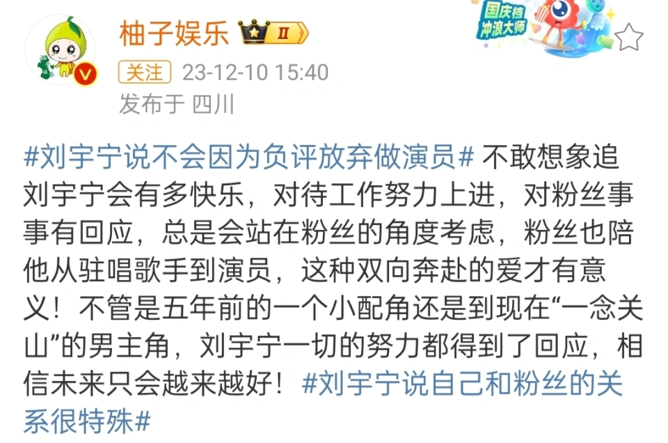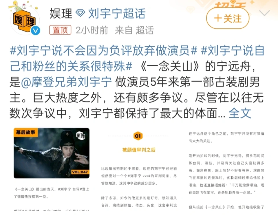 《一念关山》从开播起就没制止过上热搜,作为刘诗诗复出的首部古装大女主戏,关注度可见一斑。 首播当天热度破7千,突破了爱奇艺首日播出热度的最高记载。 然而作为剧中刘诗诗的官配CP,男主刘宇宁却备受质疑,乃至差评如潮。 大概许多人对刘宇宁的印象还停顿在网红歌手上,对于他跨界做演员并不看好。 这也难怪,《一念关山》是刘宇宁的首部古装男主戏,第一次做男一号就搭档国民女神刘诗诗,压力简直很大。 第一集刚播出,就有网友吐槽刘宇宁的古装扮相太丑,笑他难登风雅之堂。 形容他眼睛小,缺乏夫君风格,扮相不像六道堂堂主,反倒像宫里的宦官。 乃至有人将他的脸AI换成了霍建华,讽刺他不配和刘诗诗搭戏。 不外幸亏脚本佳,剧情节奏快,摆脱古偶老套路,打戏、转场、配乐都非常出彩,让各人渐渐忽视了刘宇宁的长相。 可随着后期剧情的推进,网友的质疑声又开始大了。 说剧为了捧他弱化女主本领,为了凸显宁远舟的完尤物设,魔改了许多剧情。 更可骇的是,有网友统计了1-20集的男女主进场时长,发现宁远舟的进场时间多于任快意。 加上刘诗诗粉丝爆料,显着是大女主戏,却把女主戏份删减,刻意增长男主戏份,直指刘宇宁抢番位。 就连剧外的观众也直呼嗑不动宁远舟和任快意的CP,直言更看好李同光这个疯批徒弟。 从长相丑到抢番位,从剧情魔改到男主高光,无论是剧里照旧剧外,刘宁宇都被舆论推上了风口浪尖。 台词、演技、长相、体态、头套,网友的审判从未制止。 从歌手到演员,从副角到主角,刘宇宁走过的舆论风暴一样平凡人不可思议。 怎样正视“审判”外貌的词条,刘宇宁在采访中说,他在无数的争议中都保持了最大的面子。 面临网友八倍镜的审判,他并没有那么刀枪不入,当仁不让。 “说真话我很惆怅,固然我以为各人没须要恭敬我,但我简直感受到了不被恭敬的感觉。” 他自我安慰,假如是由于宁远舟这个脚色很良好,各人才AI换脸,那宁远舟是他演的,他是不是也解释了一点宁远舟的魅力呢? 被吐槽颜值差,刘宇宁也意识到作为演员,颜值这件事应该被器重,可他没有找到好的办理方法。 每个演员都有本身的特点,长相已经固定,总不能让刘宇宁去整容吧? “我只能好好调养,让皮肤只管紧致一点,然后早睡早起,保持身材康健和皮肤状态。” 正如刘宇宁所说,作为艺人,享受的东西比平凡人良好,平凡人没须要替他感同身受。 他无法要求观众什么,但他的粉丝肯定会惆怅,他也只能躲在被窝里难过。 怕粉丝瞧不起他,说他30多岁的大老爷们,这点事都处理处罚欠好。 “不配”这个词刘宇宁听了许多,当网红的时间被说不配当歌手,演戏的时间被说不配当演员。 他说印象最深的一条品评是:“顶刘是最牛的,你们这帮95花颤动吧,他要跟你们互助个遍了。” 又可笑又好气,歌手跨界当演员,有戏拍有口饭吃对刘宇宁来说就很满足,粉丝的“大饼”他自嘲简直配不上。 刘宇宁没进娱乐圈时,做过200元一个月的厨师学徒,端过三年的盘子,卖过衣服也做过酒吧驻唱。 他非常清晰本身几斤几两,有人找他拍戏他已经很开心了,不会由于负评就放弃做演员。 至于番位之争,刘宇宁更是坦然,直言选角的时间,无论一番二番照旧五番八番,他都无所谓。 他也不明白为什么各人那么喜好争番位,对他来说,一番又怎样,看的都是脚色。 刘宇宁宠粉这一点,在娱乐圈真的没几个艺人能比,每次一有争议,他就开直播向粉丝表明。 “事事有回应”是刘宇宁对粉丝最大的爱,粉丝对他也是无条件支持,从不干预。 刘宇宁与他的粉丝之间默契互通的爱,在娱乐圈独一无二也毋庸置疑。 《一念关山》里的宁远舟着实没有舆论说的那么差,他负担大义,夺目果敢。 有责任、有继承这点,和实际中的刘宇宁还颇有一些相似。 与其把眼光放在他的颜值和番位之争上,不如多关注剧情,每个演员都不轻易。 |