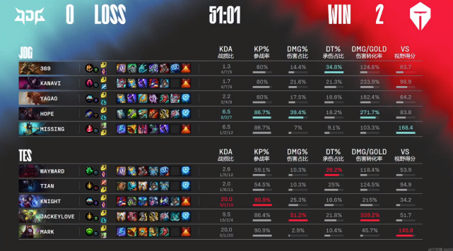 LPL夏日赛季后赛JDG和TES的胜者组决赛第二局,JDG在前期上风的环境下,惨遭翻盘,终极TES通过50分钟的鏖战后,拿下了第二局的胜利。而在这场比赛中,JKL的泽丽打出了9W2的伤害,可以说是革新了本赛季的最高伤害。 第二局JDG前期的运营打得很好,团战固然有来有回,但是JDG也不绝手握上风,在比赛40分钟的时间,JDG领先来到了1W,还拿到了水龙魂,而且抱团推掉了TES的两路高地和两座门牙塔,效果JDG这边决议失误,没有选择去拿太古龙,而是想要强行一波竣事比赛,被TES找到了机会,团灭JDG。TES拿下了太古龙,之后JDG不绝失误,TES固然只剩下裸水晶,但是通过运营,以及JKL泽丽骑脸输出,终极完成了神级翻盘。 末了比赛数据如下,JKL的泽丽打出了92113的伤害,而TES之以是在裸水晶的环境下翻盘JDG的水龙魂,也多亏了JKL泽丽的发挥,可以说没有他的体现,TES这把不大概翻盘,有一波团战打出了2W2的伤害,这真的不是一样平常选手可以做到的。他应该是继小虎之后,又一个打出了9w伤害的选手,而且两人都是那场比赛队伍力挽狂澜的核心选手。 别的JKL这场伤害占比也到达了51%,伤害转化率有339%,数据非常浮夸。他这个赛季的体现,确实是值得一阵,也是TES可以或许拿到夏日赛通例赛第一的紧张缘故原由。 而对于JDG来说,前两场比赛输得非常难熬,由于他们都是在上风环境下被翻盘了,没有把握住得胜的机会,失误连连,给了TES机会。强强对决比的就是队伍之间的决议和实行本事,JDG大概是想要打得更自大一些,但是自大过头就会上头,一连两场断送好局,反面难度就更大了。盼望红米锻练在赛后可以好好引导一下这些队员们吧。 那么,对于这件事故,你们有什么想说的吗? |