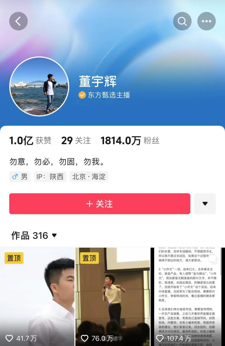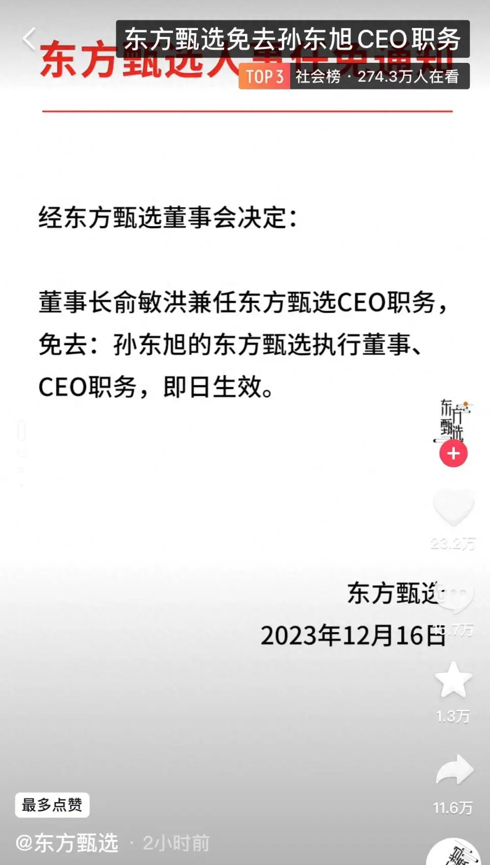 文/王新喜 董宇辉小作文事故,闹到本日出现了一个迁移变革点,日前,东方甄选 在抖音账号发布人事任免关照: 经东方甄选董事会决定:董事长俞敏洪兼任东方甄选CEO职务,免除:孙东旭的东方甄选实行董事、CEO职务,克日见效。 这件事变的走向出现了与网友预期差别的结果,在网友看来,董宇辉功高盖主,与孙东旭的抵牾公开化,14号就有内部谈天记载曝出,说俞敏洪如今面临要保CEO孙东旭,还是要保主播董宇辉,二选一的处境,东方甄选也在去董宇辉化。东方甄选小作文事故连续发酵,粉丝跌破3000万,从12月9日的3115万粉丝跌至如今的2856万。 从京东开始与董宇辉打仗到罗永浩支持董宇辉创业等,不少人以为董宇辉出走将是早晚会发生的事,但从如今东方甄选免除孙东旭CEO职务来看,董宇辉很大大概将继承留在东方甄选,这对董宇辉或是东方甄选,都是最好的选择。 由于从董宇辉的个性来看,他的个性着实不适当创业,创业要杀伐果断,要对商业化嗅觉非常灵敏,对团队的运营,具备更强的本领与实行力。如今来看,还临时看不到董宇辉在这方面的潜力与本领。 从个性来看,董宇辉与小杨哥、李佳琦着实是差别的人,前者有很强的人文气味,观众喜欢的是他的书卷气,但后两者不是文人,本身就善于商业化运营。很多人以为董宇辉本身出来单干,乐成的大概性很大,究竟,IP有了,粉丝有了,着名度有了,乐意投资董宇辉的投资人大把,这些人资源就缺好项目,如果董宇辉出来单干,肯定是资源眼中的优质股。 但是创业乐成与做主播乐成是两个差别的概念,董宇辉的乐成,不是他一个人的乐成,客观来说,有疫情期间的很多人焦急症发作带来的风口与时机,也是东方甄选团体团队的运营与扶持的结果,时机、风口、时机以及斲丧者心态、董宇辉个人本领、团队运营本领等多方面因素综合的结果。这是不能否认的,只不外网友们意识不到。 如果董宇辉出走,去了京东大概本身单干,结果未必有在东方甄选这么好,究竟,东方甄选与董宇辉着实是形成了IP强绑定关系,如果在京东大概其他企业绑定不免会出现不平水土,大概团队运作不匹配,工作风格与思绪不契合的题目,到时间也会有新的题目。 东方甄选免除孙东旭CEO职务,背后有多重目标: 起首是权衡利弊,东方甄选可以失去孙东旭,但不能失去董宇辉 从东方甄选的角度来看,失去董宇辉,意味着失去什么,这着实已经不消过多分析了,这两天的舆论,着实让东方甄选颇有种山雨欲来风满楼的意味,东方甄选粉丝与股价都在大跌,如今东方甄选一周掉粉了225万,从3115.9万粉丝跌到了2894万粉丝,股价跌了24%。如果还没有动作,东方甄选的股价与粉丝都还将继承往下掉,结果不堪假想。 董宇航的抖音粉丝数,从12月9日的1301.7万,涨到了1719.4万,涨粉417.7万,高出了俞敏洪的1367万。 东方甄选大概意识到,CEO可以换个人来做,大概临时退出一段时间,但董宇辉临时不可更换,更不能为竞争对手做嫁衣。 在东方甄选的免除孙东旭职务的网友批评,如今有一句高赞批评是:俞敏洪成绩了新东方,董宇辉成绩了东方甄选,而孙东旭则成绩了高途佳品。 信任东方甄选董事会做出这个决定,显然是意识到了这一点,全网都是支持董宇辉单干大概出走,这种顶级IP将是各大公司夺取的对象,估计京东、阿里、拼多多等各大电商头部都会争抢,东方甄选可以失去任何人,但不能失去董宇辉。 其次是管理层确实出了题目,东方甄选须要拨乱反正 直白来说,董宇辉小作文就是一个团队的积极,但是光都给一个人了,其他人不免不平气。但着实,这种事变,内部可以和谐,弄到台前来很显着就是管理层的题目。 而小孙直播间摔手机,给斲丧者上课,曝光董宇辉薪资,有网友分析背后的潜台词是告诉丈母娘们两点,一是在收入方面东方甄选已经对得起董宇辉了,二是使用大众仇富生理,挑拨董宇辉与丈母娘之间的抵牾。 俞敏洪在14日在外交平台上回应称,小编作为员工,在东方甄选官方账号上发布本身的观点,而且一发再发,如许的做法严峻缺乏职业精神,也阐明公司管理上有很大的毛病,CEO孙东旭在回应中提及董宇辉薪酬也不适当。 这种公司内部的管理抵牾云云公开化,对东方甄选整个品牌,对俞敏洪、董宇辉着实都造成磷坪面影响。因此,从这个角度来看,东方甄选管理层确实出了题目,也须要拨乱反正。 平息舆论,安抚粉丝,稳住股价 从如今来看,大多数粉丝都以为董宇辉遭受到了不公平的对待,以为别的主播多数是妒忌董宇辉的,站队CEO小孙的。尤其是孙东旭的一顿使用,把吃瓜群众冒犯了,看热闹不嫌事儿大的都开始为董宇辉鸣不平了,这件事变急需平息舆论,如许的处置惩罚结果,给了董宇辉以及背后的粉丝十足的面子,因此,也能相对更好的平息舆论,安抚粉丝,如果继承发酵,新东方股价或将迎来史无前例的大跌。 卸磨杀驴但不能杀千里马,免除孙东旭的CEO职务,本质是免除了东方甄选的内耗,自古以来,打败你的通常不是对手,而是内耗与内耗,而内耗的背后,着实就是优点之争。 不外,对于东方甄选来说,困难依然存在,但抵牾已然形成,董宇辉以后还怎么面临这些同事?小孙此前是作为太子被俞敏洪作育的,CEO这个层级的管理层敏捷被罢免不免也会导致内部民气不稳。东方甄选的贩卖大头都在一个王牌业务手里,其他主播出不了头,内部的抵牾还将连续存在。 不外,以后的困难留给以后办理,当前再不及时止