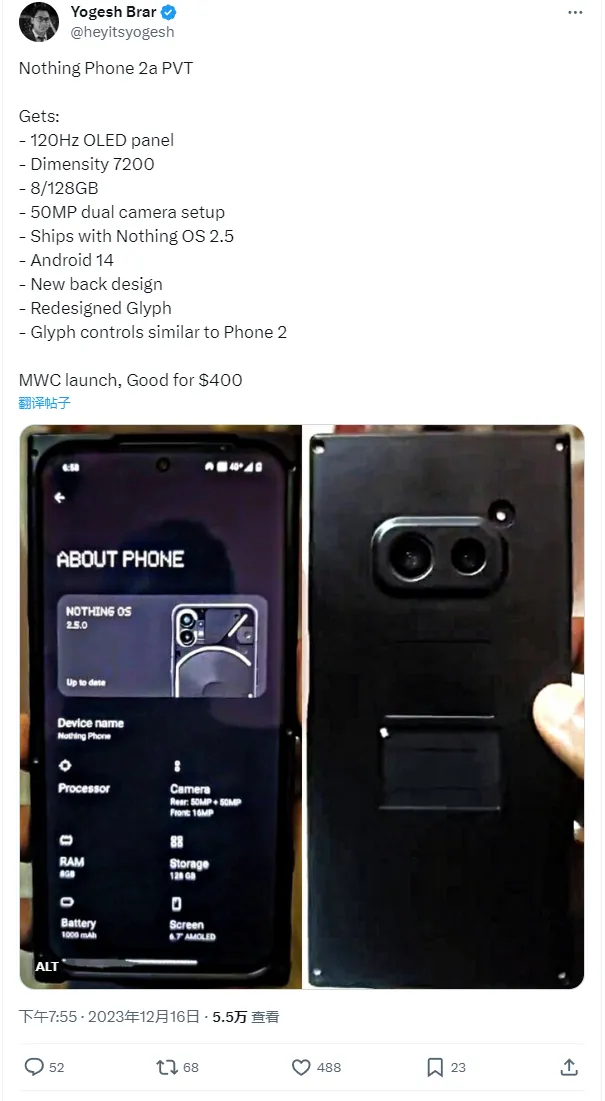 IT之家 12 月 17 日消息,Sanju Choudhary 上个月报道称,Nothing 正操持推出 NothingPhone 2a 智能手机,型号为 AIN142。 @Yogesh Brar 放出了这款手机 PVT(Process Verification Test,指小批量过程验证测试)工程机的照片,并给出了一些参数。 据称,这款手机将搭载联发科天玑 7200 芯片,采取了一块 6.7 英寸120Hz 革新率的 OLED 面板,提供8+128GB 存储,前置 1600 万像素 f / 2.0 自拍摄像头,后置50MP 主摄和 8MP 超广角镜头,还预装了基于安卓 14 的 Nothing OS 2.5 体系。 IT之家提示,工程机反面采取保密壳覆盖,与终极上市产物所出现的外貌差别。 ▲Nothing Phone 2a 工程机谍照 ▲Nothing Phone 2a 操持语言 ▲Nothing Phone 1 他表现,这款手机将会在2024 年 2 月 26 日至 2 月 29 日举行的 MWC 2024 上发布,定价约为400 美元(IT之家备注:当前约 2848 元人民币)。 |