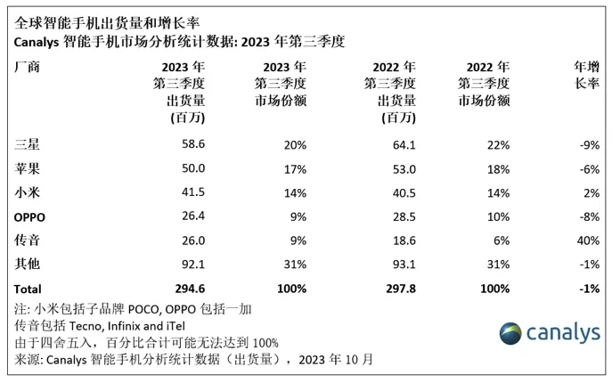 12月19日,市场调研机构Canalys最新陈诉指出,2023年第三季度,环球智能手机市场降落1%,由于厂商在二季度库存状态得到改善,并在三季度推出新品,因此出货量达2.946亿部。三星位居榜首,出货量达5860万部,市场份额达20%。在iPhone 15新品需求的推动下,苹果紧随厥后,出货量达5000万部,市场份额为17%。小米排名第三,出货量达4150万部。OPPO(包罗一加)位居第四,出货量达2640万部,市场份额为9%。传音(包罗Tecno、Infinix和iTel)继承保持第五的位置,出货量达2600万部。 |