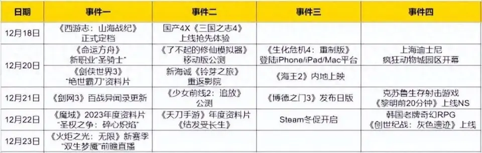 新的一周又开始了,本周又会有哪些好玩的新游戏等着我们呢?一起来看看吧。 【热门更新】 划重点:《魔域》2023年度资料片“圣权之争:碎心炽焰”将于12月22日公测 在本周五(12月22日),经典MMO《魔域》将推出2023全新年度资料片“圣权之争:碎心炽焰”。新资料片中,将有秘密BOSS重磅来袭、邪术师全新专精登场、以及全新军团玩法创造性升级,让我们来先睹为快。 新资料片的第一大重磅更新就是将会上线3个全新荒古火墓副本,挑衅对应副本可以得到90级神火誓灵之芒、渡魂之辉、圣权天炽。同时,现有的神火养成也将举行大幅优化,神火副属性洗练将会更加轻松;新增神火通行证,全新特权助力神火挑衅;神火心愿体系,资助玩家免费快速获取差别格位3星圣权天炽! 邪术师也将会在该次更新中迎来全新的专精技能、神性技能,都将让这个经典的法系输出职业更上一层楼。 别的,新版本将对军团玩法举行创造性升级,全新军团对抗性PK舆图、全新军团副本以及军团嘉奖加码升级,更有军团图腾翻新,享受更多的属性加成结果。 随着新资料片上线,更有多重限时活动期待与玩家见面,届时玩家可以一边体验全新玩法带来的丰富爱好,也可以在福利活动中得到更多嘉奖来进一步武装本身。感爱好的玩家可千万不要错过。 划重点:腾讯《运气方舟》新职业“圣骑士”12月20日上线 腾讯署理的MMO端游《运气方舟》,日前公布全新职业【圣骑士】将于12月20日上线。圣骑士是使用信心值的辅助型职业,既能通过圣书使用圣明技能给队友举行增益和支援,又能摆荡单手剑发挥惩戒技能在战场上赴汤蹈火,是玩家心心念念的奶爸职业。 圣骑士的职业特性可以强化本身的剑大概增长队友的战斗力,他将能量凝聚在自身剑上,增长使用剑技能的攻击范围和伤害量。而在辅助队友时,特性技能又可将光环扩散至附近,增长队友们的战斗本领。 划重点:《剑网3》百战异闻录新一期将于12月21日正式开启 12月21日,《剑网3》新一期百战异闻录玩法将会开启。 在更新后百战异闻录将开放新关卡,总层数从60层扩展至70。同时,全部百战招式都将能升级至第七重,全新精英首领与百战招式也会登场,相当于对玩法来了一次大更新。 撤消这个玩法更新外,不久后故里新赛季也将更新,新赛季将更新故里身份玩法、家具三轴旋转、家具五维分数取消等诸多玩法、体验上的优化更新。 划重点:新门派霸刀!《剑侠天下3》“绝世霸刀”资料片12月20日上线 西山居新一代剑侠情缘手游《剑侠天下3》官宣:2周年资料片“绝世霸刀”12月20日正式上线。 《剑侠天下3》迎来全新土系双刀门派“霸刀”,一身富丽紫衫,服佩皮毛,豪朗疏阔。 新版本还将推出全新小队生存玩法“野竞试炼”,差别于过往江湖中的大型pvp,该玩法类似吃鸡,玩家以小队的情势在限时毒圈内通过与其他队伍搏杀、开启限时宝箱、击败舆图首领等方式得到积分,拿到终极大奖。 感爱好的玩家不妨体验一下。 划重点:《天际明月刀手游》年度资料片定档12月22日 天刀手游年度资料片《结发受永生》定档12月22日。 新资料片中将会有天刀手游第十二门派“永生剑派”登场,该门派持唐刀,招式刚猛迅捷,并有强大变身技能,战斗结果非凡,是新一代的剑系输出职业。 感爱好的朋侪不妨体验一下。 划重点:火把之光无穷12月23日启动新赛季“双生梦魇”前瞻直播 《火把之光:无穷》将于12月23日启动新赛季“双生梦魇”的前瞻直播,玩家可以在此时获取新版本的更新信息。 别的,该赛季将会在12月29日正式上线,想要征战新赛季的玩家肯定要提前做足准备。 【新游发售】 划重点:《少女火线2:追放》公测定档12月21日 此前引发了轩然大波的《少女火线2:追放》正式官宣,将于12月21日正式全平台公测。 此前该作品就由于剧情暴雷,加上游戏优化、计划不公道等诸多标题遭遇了口碑雪崩,现在履历两个月的告急抢修,尚且不知道公测版本是否还能赢得玩家芳心。 不外,据加入了测试的玩家爆料,近期《少前2》中还给脚色参加了类似命座的脚色养成抽卡机制……这是否会引发新一轮风暴,我们公测后再见分晓。 划重点:模拟谋划游戏《了不得的修仙模拟器》移动版 12 月 20 日公测 《了不得的修仙模拟器》官方公布,游戏移动版公测正式定档 12 月 20 日,现已开启预约。 据官方先容,移动版针对移动装备举行优化,体验与 PC 端保持同等,可以免费玩到上百以致上千小时的内容。这款游戏在 Steam 上好评率已经到达了 88%,国区订价 88 元,现在七折 61.60 元。 划重点:真正的全平台!《生化危急4:重制版》12月20日发售:支持iPhone 15 Pro 不愧是生化4,真正的全平台游戏! 卡普空官方发文公布,《生化危急4:重制版》将于12月20日正式登岸iPhone/iPad/Mac平台。 官方还表现,苹果版《生化危急4:重制版》将会以“Play Before You Buy”的方式推出,用户可以亲身体验后再决定是否购买,美国售价59.99美元(约合437元人民币)。 评价为不忘初心。 【更多关注】 划重点:年度大促!Steam冬促12月22日开启 Steam冬季特惠将于从将于北京时间12月22日破晓2点正式开始,向来冬促属于年底清仓,打折幅度都非常大,各人可以思量购买本身喜好的游戏。 划重点:《博德之门3》在举行PC版日语当地化 12月21日将正式发布日版 此前Larian Studios发行总监Michael Douse在推特上发文透露,现在官方正在举行《博德之门3》PC