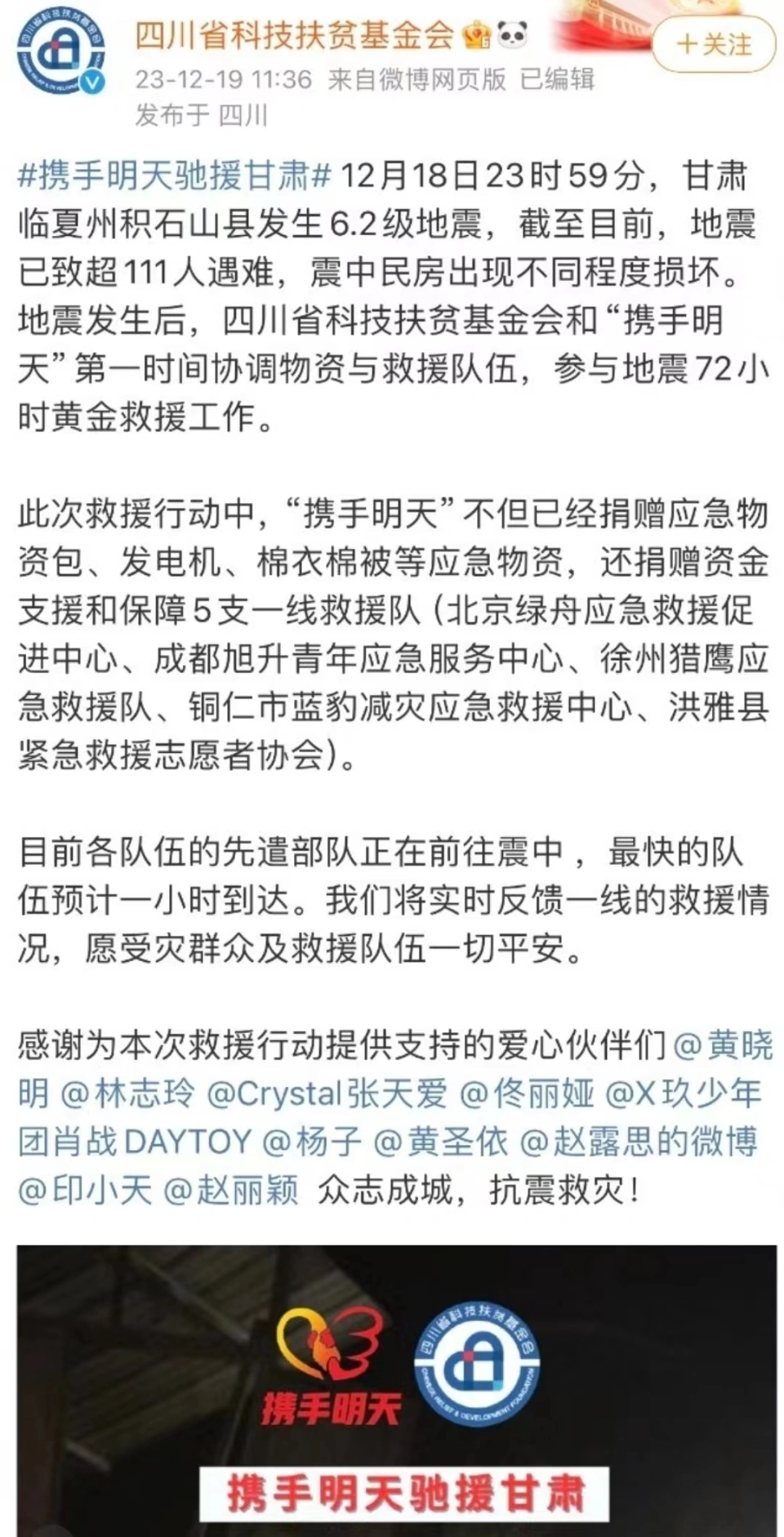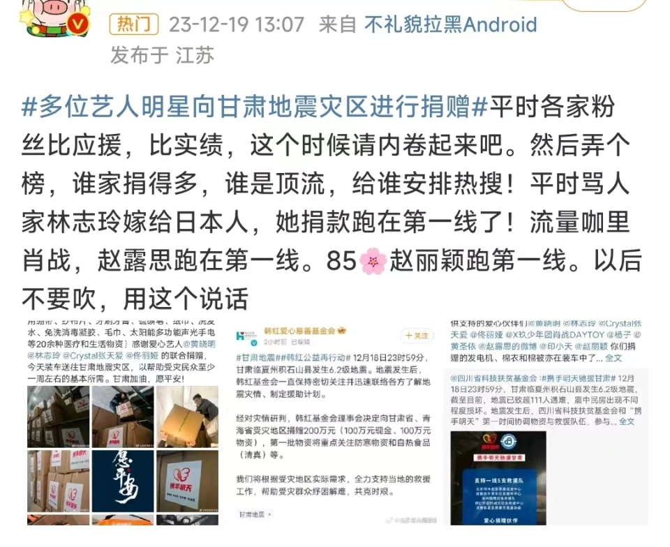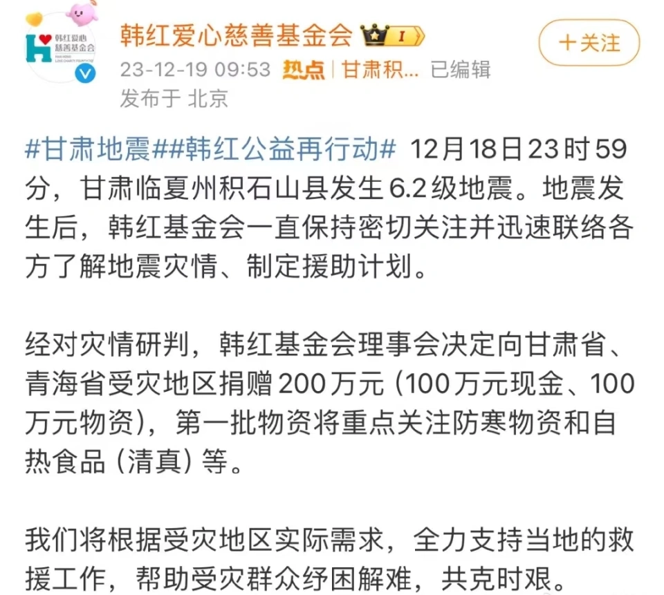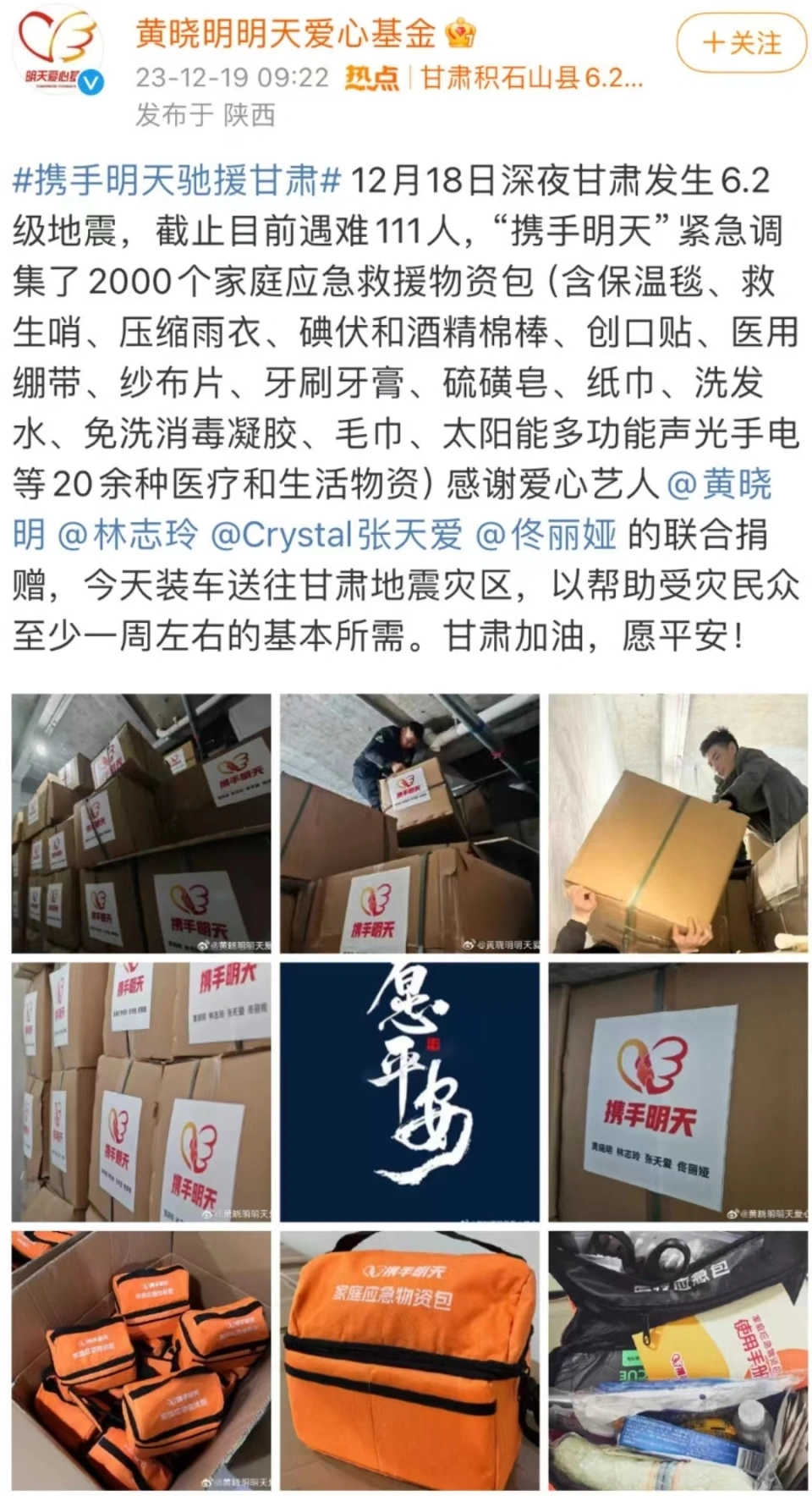 甘肃6.2级大地震牵动民气。 随着伤亡数字渐渐增长,浩繁娱乐圈明星们也纷纷开始“亮相”。 娱乐圈里能说得上名姓的大多明星都转发了来自央视消息或人民日报的祈福动态,“愿安全”三个字此时可谓是凝结了全部人的心意。 固然除了祈福祝愿,明星们的现实办法也来的相当敏捷。 韩红爱心基金会就此次灾情第一时间做出了反应,决定向甘肃省和青海省受灾地域捐赠200万,此中包罗100万现金以及100万物资。 团结现下天气严寒,韩红基金会还把物资的重心放在了防寒和自热食品上。这一系列操纵下来,是肉眼可见的得心应手。 每次出现灾情,韩红及其爱心基金会都会在第一时间给予资助。不停的低调的韩红,在这种危难关头都会成为明星赈灾的领头人,着实是难能惆怅。 除了韩红基金会首当其冲,演员黄晓明的基金会同样值得歌颂! 黄晓明基金会不但团结四川省科技扶贫基金会加入接济工作,而且捐赠了应急物资包,发电机,棉衣被等应急物资,还捐赠资金资源和保障接济队。 和黄晓明一起提供爱心的明星搭档有赵丽颖、肖战、赵露思,杨子黄圣依夫妇、佟丽娅、张天爱、印小天以及林志玲。 各人都是好样的,但不少网友感慨林志玲这波反应着实圈粉,为什么呢? 要知道台湾明星们就此次灾情,网络上发声的不少,沉默沉静的也有,但林志玲却是第一个出头捐实物的。 自从嫁给黑泽良平,林志玲这位女神渐渐淡出娱乐圈。婚姻为她带来幸福的同时,也使得她遭受了许多猜疑与质疑。 只管林志玲已经鲜少公开露面,可关于她的各种小道消息层出不穷。诸如被老公家暴,在日本家庭职位低劣等等。 此次出现灾情,林志玲低调脱手捐赠物资,再次证实女神还是谁人女神,身份改变了,但心意未变。 第一批明星们脱手赈灾,不少网友表现通常里各家粉丝争相比应援没什么意思,这个时间卷起来才是真的有面。 固然了,这种说法大概在粉丝看来有些道德绑架自己哥哥姐姐的意思,可换个角度想,这正是能真正显现偶像力气的时间。 渴望明星们能在本领范围之内做出一些楷模,让力气更大一些,让赈灾力气更雄厚一点。 |