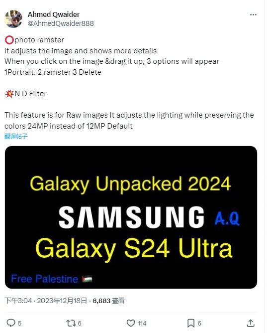 IT之家 12 月 19 日消息,根据消息源 Ahmed Qwaider 透露的最新消息,三星即将推出的 Galaxy S24 Ultra 手机拍摄 RAW 格式照片,默认分辨率从 1200 万像素升级到 2400 万像素。 三星此举大概是为了跟随苹果步调,苹果本年推出的 iPhone 15 Pro 系列机型中,颠末算法调解,默认输出 2400 万像素,文件体积没有 4800 万那么浮夸,也没 1200 万像素那么寒酸。 三星 Galaxy S23 Ultra 配备 2 亿像素主摄,支持拍摄 2 亿像素和 5000 万像素两种模式,而现在的爆料体现,三星 Galaxy S24 Ultra 依然会配备 2 亿像素主摄。 IT之家根据消息源信息,分享三星 Galaxy S24 Ultra 手机相机功能如下: Photo Remaster三星大概会相沿来自 Galaxy Book 4 条记本上的功能,通过调用 AI 元素进一步增强拍摄的照片。 消息称该功能共有 Portrait、Remaster 和 Delete 三个选项,此中 Portrait 可以创造景深,更好地出现拍摄主体;Remaster 是对图片的一键增强;而 Delete 预估是删除图片中的不须要元素。 ND Filter类似于单反相机上的 Natural Density 滤镜,通过控制快门曝光等参数,进步照相个性化体验。现在该功能已出现在 Galaxy S23 Ultra 中,潜伏在“Expert RAW Labs”部门。 |