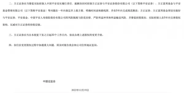 经济观察网 记者 黄一帆安全证券与方正证券(601901.SH)或将归并的市场听说愈演愈烈。 12月20日,中国安全(601318.SH)在回应上述市场听说时表现,公司将从股东代价最大化出发,按照有关羁系部分的规定和指引,稳步推进干系标题的办理。 方正证券则向经济观察网回应称,“我们会和各方一起严格按照金融羁系部分的规定、指引,来开展干系的工作。后续假如有新的希望,我们会实时披露”。 一位沪上券贩子士表现,现在市场会产生两家券商归并的预期,紧张缘故原由是中国安全须要办理同业竞争标题。 客岁12月19日,证监会下发允许批复,同意中国安全成为方正证券、方正证券承销保荐有限责任公司、方正富邦基金管理有限公司(以下简称方正富邦基金)的现实控制人。 在该批复中,证监会要求方正证券应当督促现实控制人中国安全切实推行责任,就办理同时控制方正证券与安全证券、方正富邦基金与安全基金等标题在一年内订定并上报方案,明确时间表和蹊径图,并在5年内完成规范整改。 泉源:证监会官网 按照上述要求,本年12月19日是中国安全提交并上报方案的末了限期。 现在市场尚在静待方案出炉。 在本年8月30日的中国安全2023中期业绩阐明会上,中国安全总司理兼联席首席实行官谢永林表现,方正团体资产交割进程顺遂,安全重整的根本原则是根据差别的板块,按照充实融入、深度赋能和加快处置处罚来举行。在提到方正证券时,谢永林表现,安全对方正证券赋能后,客岁方正证券的利润增长速率在全证券市场排名第一。 “由于中国安全控股的安全证券、安全基金的业务范围与方正证券、方正富邦基金雷同或相近,在现行政策的要求下,两家券商归并是现在呼声较高的办理方案。”上述券贩子士告诉记者。 据相识,前述现行政策要求是指“一参一控”要求。根据《证券公司监视管理条例》中的干系规定,同一现实控制人控制的多家机构参股证券公司的数目不得高出两家,此中控股证券公司的数目不得高出一家。 值得一提的是,从现在政策导向上看,羁系支持券商通过并购重组做优做强。 在本年11月3日的证监会消息发布会上,干系负责人表现,将支持头部证券公司通过业务创新、团体化筹谋、并购重组等方式做优做强,打造一流的投资银行,推动证券公司投行、投资、投研协同联动,不停提拔服务实体经济、服务注册制改革本领,助力构建为实体企业提供多元化接力式金融服务体系。 |