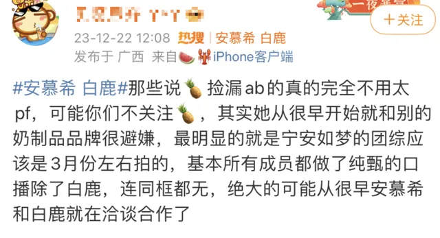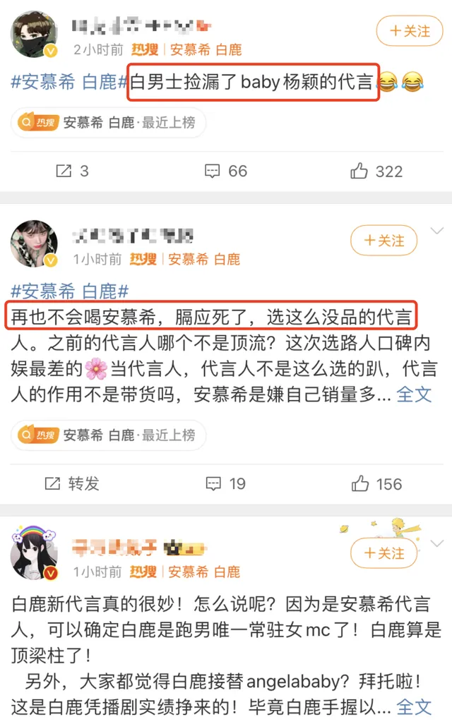 白鹿本年实现了电视剧“三爆”,分别是《长月烬明》《以爱为营》尚有《宁安如梦》,三部作品的热度都很高,均被平台认证成爆款,那同样一年播三部剧的又何止是白鹿,古力娜扎以致一口吻播了四部戏,但是水花都不大,对比之下,确实显得白鹿更受各人的接待。 多次上台领奖的白鹿,也感谢自己的作品可以或许被被喜欢,一句“轻舟已过万重山”固然被讽刺太自尊,但是这句话是说给她粉丝听的,对比当年的小透明,白鹿如今确实能当得起这句话。 接下来白鹿尚有《北上》,包罗正在拍摄的《白月梵星》两部剧会跟观众见面,不能看出来岁,白鹿仍旧会通过作品让观众看到她身上更多的大概性,说到底白鹿能走到本日,照旧在用作品语言,她真的很拼。 12月22日,白鹿官宣了一件功德情,那就是成为了安慕希品牌代言人,固然白鹿早就到场了《跑男》,也与安慕希是老熟人了,但这次才是真正意义上告竣了相助,而且本年照旧安慕希十周年,也是白鹿到场安慕希各人庭的第一年,也就预示着白鹿来岁仍旧会跟各人一起疾驰。 不丢脸出白鹿近两年在《跑男》里的表现,魔性的笑声一战成名,她为人幽默梗又多,做任务玩游戏也非常认真,到场《跑男》短短2年时间,就劳绩了很多的老实观众,观众眼睛不瞎,若白鹿不能给节目带来点利润,估计不消等各人开口,《跑男》节目组也早就把她out了。 此次代言安慕希,是功德,证实确鹿的积极被望见了,只是各人都清楚,安慕希之前的代言人是杨颖,这次官宣白鹿,就分析杨颖由于疯马秀彻底凉凉,白鹿已经全然代替了她的位置。 杨颖粉丝破防,由于官宣了白鹿,他们内心清楚,baby复出的时机又镌汰了,原来白鹿到场《跑男》后就抢走了baby不少的风头,如今baby被跑男除名,白鹿直接更换了她,如今白鹿又接下了baby之前的代言,也难怪baby粉丝会在网上阴阳怪气的讽刺白鹿是”捡漏王”要是baby还在,哪轮得着白鹿啊。 着实很多人说这种话就是直接否定了白鹿的个人代价,起首到场过《跑男》的成员,大多数都是安慕希的代言人,大概白鹿刚好赶在了这个节骨眼上,其二,白鹿如今的影响力也足以能撑起货品的销量,加上她有作品加持,每一年都会有作品播出,而且爆的大概性很大,那么找白鹿代言,就能年年有热度,品牌方何乐而不为呢? 别的,白鹿与安慕希的相助也肯定不是临时才决定,着实白鹿很早前就开始和别的奶成品品牌避嫌了,最显着的就是《宁安如梦》的团综,这个节目大概是3月份左右拍摄的,其时冠名这档节目的是纯甄,其他人都录了该品牌的口播,唯独白鹿没有,白鹿在节目里也没喝过一口,显然是在避嫌,大概谁人时间,白鹿跟安慕希的相助就在洽谈中了,齐备都有迹可循。 再看看安慕希其他两位明星代言人,一位是热巴,另一位是王鹤棣,品牌方也是从多个角度思量,既要看他们的贸易代价,也要看他们的输出本事,热巴也是安慕希的老朋侪了,跟baby一样,若baby没去看疯马秀,估计也跟热巴一样继承续约,而王鹤棣人气高,有作品加持,天然就受到了品牌方的青睐。 白鹿本就是《跑男》的常驻高朋,所谓“肥水不流外人田”自己家里有云云精良的艺人,天然就是相助共赢的结果,baby也是她咎由自取,即便是没有白鹿,安慕希也会找其他人。 |