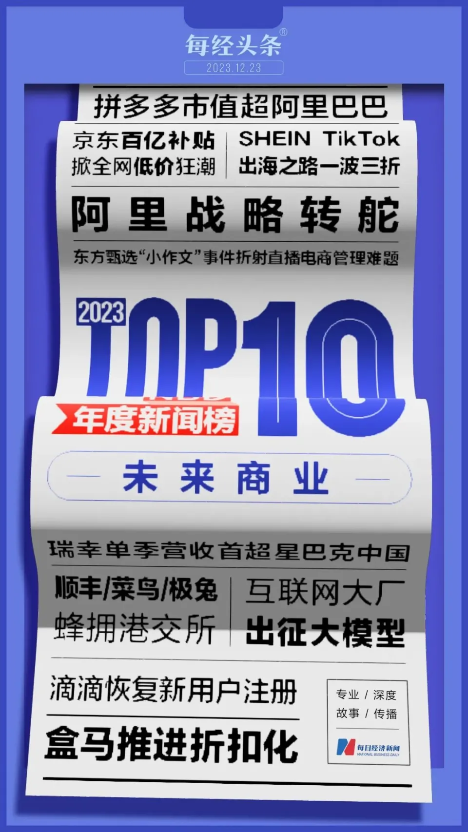 每经记者:陈婷 王郁彪 赵雯琪 2023年,互联网行业热门频发。在理性斲丧成为主流的大配景下,电商平台卷向低价,“双11”在哗闹中回归本质,行业随之迎来新的竞争格局。临比年底,零售企业接连竞逐“扣头化”,更是拉开了来年斲丧生态大厘革的序幕。 回首整年,互联网企业在厘革中寻觅新机。无论是接连押注大模子,还是战略上的迭代升级,抑或是行业屡现的换帅消息,都反映出厘革期企业心田的焦急与彷徨。与此同时,随着国内互联网增量见顶,互联网巨头们纷纷押宝跨境电商赛道。 经特邀专家评审,我们遴选出2023年未来贸易十大消息。十大消息并非孤立变乱,它们反映了一年以来互联网行业厘革的表里,预示着来岁的新斲丧景象。 NO.1 拼多多美股市值逾越阿里巴巴 在拼多多发布远超市场预期的三季报后,美股拼多多股价11月28日收盘大涨超18%,年内涨幅扩大至70.45%,以收盘价139美元盘算,市值到达1847亿美元,与其时阿里巴巴相差不到100亿美元。 一位阿里员工就此在内网发出感慨,马云也有数加入讨论。马云留言表现,要庆贺拼多多已往几年的决定、实行和积极,同时也坚信阿里会变,阿里会改。“全部巨大的公司都诞生在冬天里。AI电商期间刚刚开始,对谁都是时机,也是挑衅。” 11月29日晚间,拼多多股价盘中一度涨至144.87美元,市值初次逾越阿里巴巴,成为美股市值最大中概股。 NO.2 京东“百亿补贴”掀2023全网“低价”怒潮 3月6日,京东“百亿补贴”频道全面上线,位于京东主站App首页显着位置,打响京东2023“重塑低价心智”第一枪。除内部上线全网比价体系外,京东618公布百亿补贴“买贵双倍赔”等新玩法;“双11”京东采销不测翻红,更将“低价战局”推至高潮。 2023年一整年,京东相继在构造布局、平台生态、业务模式上全面构建低价场域,以期重回高增长。这同步掀起了包罗淘天、抖音电商、拼多多等平台在内的2023全网“低价”怒潮。 NO.3 阿里战略转舵 11月16日,阿里于3月尾启动的“创建24年最紧张的构造厘革和上市拆分操持”突然转向:不再推进云智能团体的完全分拆,盒马鲜生的初次公开募股操持暂缓;现在来看,仅菜鸟按操持走向上市。 2023年,阿里麋集“换帅”:由蔡崇信接任张勇阿里巴巴团体董事会主席职务,吴泳铭出任阿里巴巴团体CEO,吴泳铭同时兼任阿里云和淘天团体CEO。按照吴泳铭在2024财年二季度(2023天然年三季度)财报聚会会议上的表态,阿里将创建高度机动、快速决定的管理机制与鼓励体系,未来各业务线均以独立业务单位为单位,更加独立自主面向市场。蔡崇信12月20日最新全员信表态:“唯一稳固的是变革,让我们点燃重新创业的精神!” NO.4 跨境新生代SHEIN、TikTok 出海之路一波三折 外洋市场被中国企业看作是增长的新蓝海,但出海的征程挑衅重重。2023年11月尾,SHEIN被曝机密交表赴美IPO后,美国立法机构增强了对SHEIN的查察,要求其提供不使用欺凌劳动的证据。2023年5月及8月,亦有多名美国议员和多个州的总查察长接续联名致信美国证券买卖业务委员会,对SHEIN赴美上市表达密切关注。 出海遭遇阻力的不但仅是SHEIN。本年9月尾,印尼总统佐科·维多多在内阁聚会会议上正式克制“像TikTok如许的”社媒平台举行直接贩卖买卖业务,并称该法规将纳入修订后的印尼贸易部第50/2020号条例,10月下旬,印尼TikTok Shop关停。直至12月11日,TikTok印尼电贸易务官宣将与印尼科技巨头GoTo团体旗下电商平台Tokopedia归并,TikTok对归并后的实体占股75%并拥有控制权。至此,TikTok印尼电贸易务辗转腾挪于“双12”正式规复上线。 NO.5 顺丰、菜鸟、极兔蜂拥港交所 本年8月,顺丰控股在港交所递交招股书寻求二次上市。一旦在香港挂牌上市,顺丰控股将成为国内首家在A股和H股同时上市的快递企业。9月26日,菜鸟也向港交所递交了IPO申请,被以为将冲刺“举世智慧物流第一股”。10月27日,2020年刚刚进入中国市场的极兔速递在港上市,创下国内快递公司最快上市纪录,敲钟当日市值超千亿港元,一举凌驾圆通、韵达、申通,仅次于顺丰、中通。 2023年,头部物流企业蜂拥港交所,正式宣告新一轮资源化高潮,通过更加国际化的资源撬动资源、积极出海,走向国际化。 NO.6 美团、阿里、字节、京东、拼多多 出征大模子 2023年初,ChatGPT横空出世,引爆了国内大厂对大模子的热情:美团、阿里、字节、京东、拼多多等互联网大厂更是重金押注、无一缺席。 本年2月,美团团结首创人王慧文建立光年之外,美团首创人王兴投资入股;6月,美团公告,以20.65亿元完成光年之外境表里主体100%股权的收购,正式开启了美团大模子征程;4月11日,阿里云公布推出大语言模子“通义千问”,并表现包罗天猫、钉钉、高德舆图、淘宝、优酷、盒马等阿里巴巴全部产物,未来都将接入“通义千问”大模子全面改造;6月28日,字节跳动火山引擎发布大模子服务平台“火山方舟”;7月13日,京东推出灵犀大模子;拼多多11月也被曝开出百万年薪招兵买马杀入大模子。 互联网巨头“神仙打架”,大模子也成为本年绕不开的重点布局的业务。 NO.7 瑞幸咖啡单季营收首超星巴克中国 本年8月,根据瑞幸咖啡公布的2023年第二季度财报,此中国地域总净收入为62.014亿元,而星巴克中国在2023财年第三财季(4月3日至7月2日)的单季营收为8.22亿美元(约合59.6亿元),瑞幸单季营收初次凌驾星巴克中国。 停止第二季度末,瑞幸咖啡门