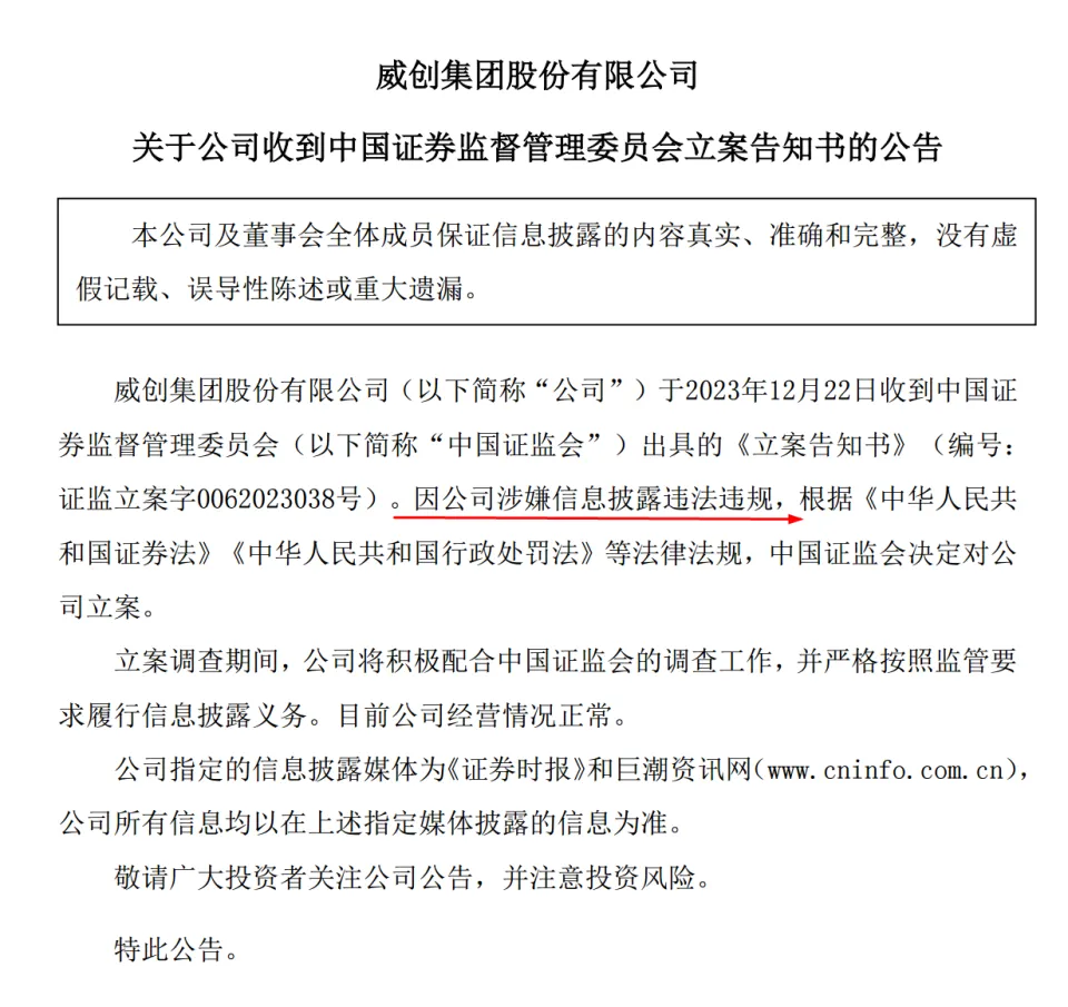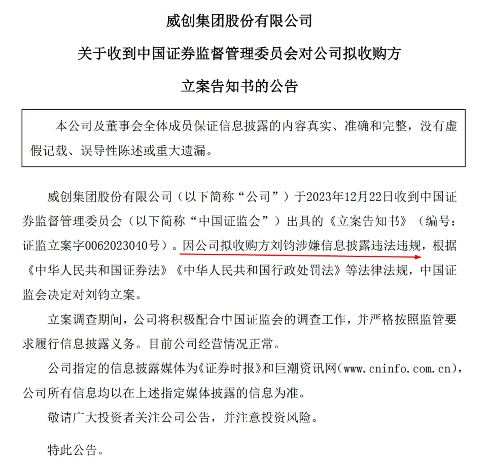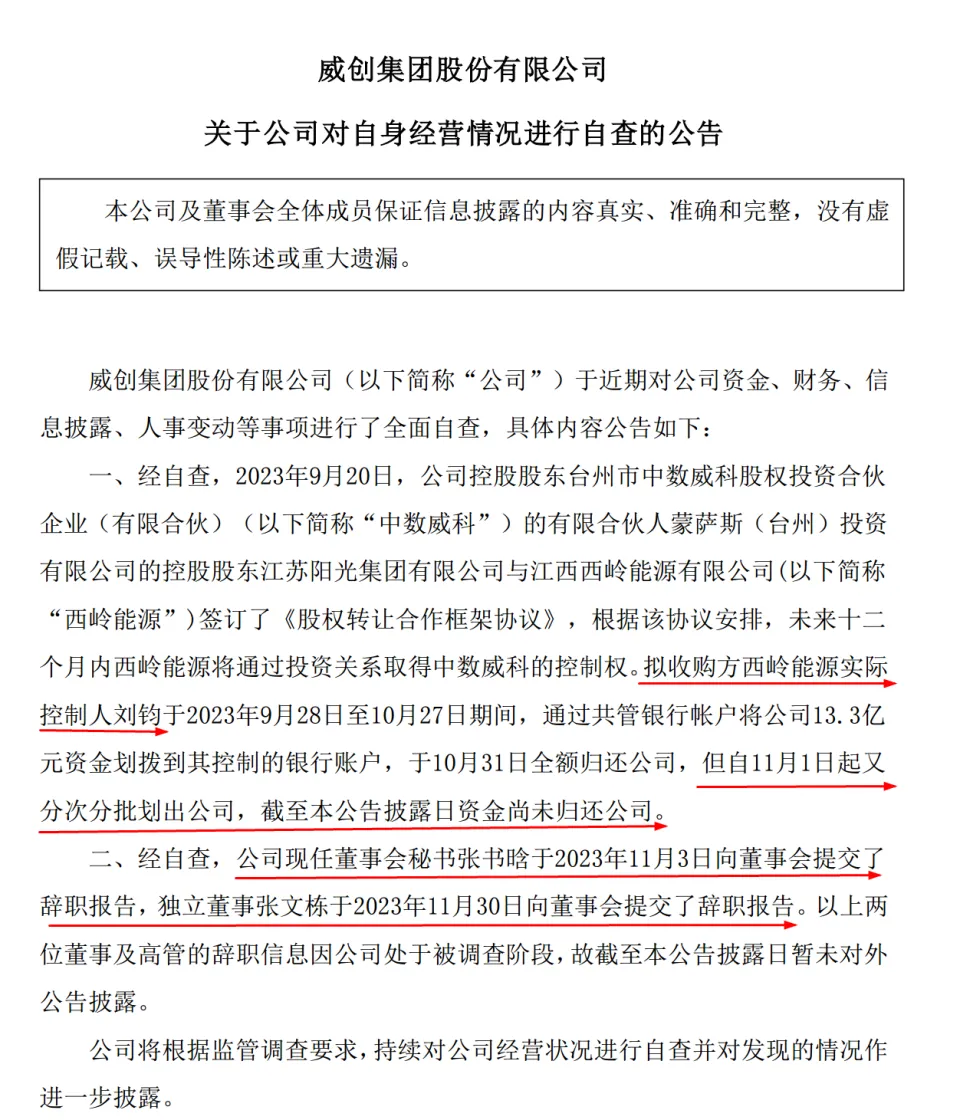 上市公司威创股份深夜暴雷,一天连收两份存案告知书,随后公司敏捷发布自查公告。公告称,其约13.3亿元被刘钧自11月1日起分次分批划出公司,公司现任董事会秘书张书晗于本年11月3日向董事会提交了辞职陈诉,独立董事张文栋于本年11月30日向董事会提交了辞职陈诉。 资料表现,威创股份告急从事视讯业务和儿童发展平台。本年前三季度,公司实现营收3.63亿元,同比下滑15.68%;实现归母净利润1347.1万元,同比下滑82.36%。停止9月30日,公司股东总户数为4.1万户。停止12月22日收盘,威创股份报4.82元/股,年内上涨约13%,最新市值44亿元。 12月22日晚间,威创股份发布两则公告,该公司以及公司的拟收购方刘钧,于当日分别收到中国证监会出具的《存案告知书》,刘钧及公司均涉嫌信息披露违法违规,被中国证监会决定存案。 随后公司敏捷发布自查公告,其公告称,本年9月20日,公司控股股东中数威科的有限合资人蒙萨斯(台州)投资有限公司的控股股东江苏阳光团体有限公司,与西岭能源签订了《股权转让互助框架协议》,根据该协议安排,未来十二个月内西岭能源将通过投资关系取得中数威科的控制权。拟收购方西岭能源现实控制人刘钧于本年9月28日至10月27日期间,通过共管银行帐户将公司13.3亿元资金划拨到其控制的银行账户,于10月31日全额归还公司,但自11月1日起又分次分批划出公司,停止本公告披露日资金尚未归还公司。 别的,公司现任董事会秘书张书晗于本年11月3日向董事会提交了辞职陈诉,独立董事张文栋于本年11月30日向董事会提交了辞职陈诉。以上两位董事及高管的辞职信息因公司处于被观察阶段,故停止本公告披露日暂未对外公告披露。 威创股份的自查公告发布后,厚交所告急下发关注函。关注函表现,厚交所对上述事项表现高度关注,公司应当接纳统统须要本领追回干系资金,维护公司及中小股东的优点,并对内部控制存在的缺陷举行认真自查和整改。 厚交所还表现,对威创股份及干系当事人涉嫌存在的信息披露违法违规举动,后续厚交所将根据证监会观察结果,依据《股票上市规则》的干系规定对公司及干系责任人启动规律处分步伐。 (财联社) |