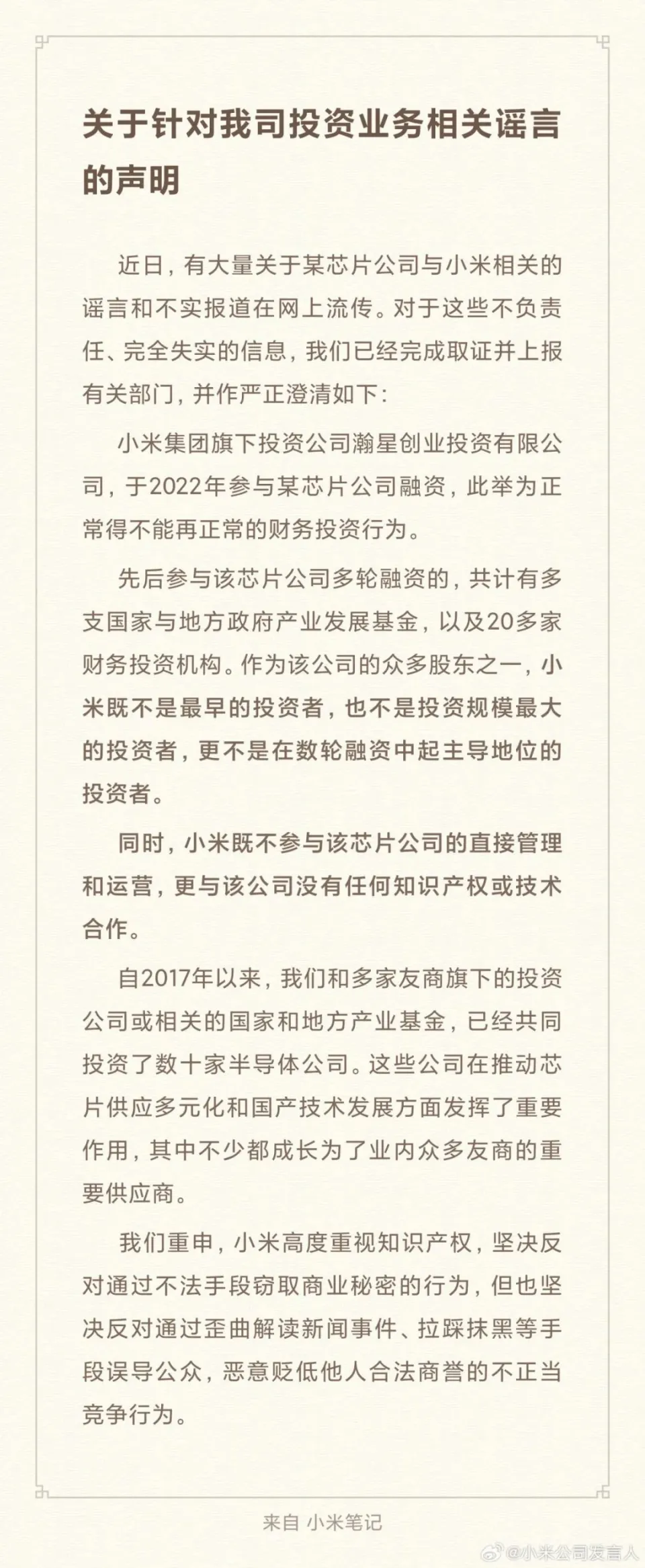 12月24日晚,小米团体官博发布声明:克日,有大量关于某芯片公司与小米相干的谎话和不实报道在网上传播。对于这些不负责任、完全失实的信息,我们已经完成取证并上报有关部门,并作严正澄清。 小米表现,团体旗下投资公司瀚星创业投资有限公司,于2022年参加某芯片公司融资,此举为正常得不能再正常的财务投资举动。先后参加该芯片公司多轮融资的,共计有多支国家与地方当局财产发展基金,以及20多家财务投资机构。 小米称,作为该公司的浩繁股东之一,小米既不是最早的投资者,也不是投资规模最大的投资者,更不是在数轮融资中起主导职位的投资者。 小米在声明中表现,小米既不参加该芯片公司的直担当理和运营,更与该公司没有任何知识产权或技能互助。小米高度器重知识产权,果断反对通过非法本领盗取贸易机密的举动。 值得注意的是,本年8月华为旗下上海海思技能有限公司与尊湃通讯科技(南京)有限公司(以下简称为“尊湃通讯”)等申请诉前财产保全一审非诉保全检察裁定书公开。 文书表现,申请人上海海思技能有限公司向法院申请诉前财产保全,哀求冻结被申请人尊湃通讯科技(南京)有限公司及其上海、北京、苏州、深圳分公司和子公司上海尊湃通讯科技有限公司银行存款9500万元,或查封、冻结、扣押代价相应的其他财产。法院检察以为上述申请符合法律规定,裁定实行。 工商信息表现,尊湃通讯科技(南京)有限公司由上海琨昊企业管理合资企业(有限合资)、张琨、瀚星创业投资有限公司等共同持股。上海琨昊建立于2021年1月27日,是一家以从事商务服务业为主的企业。 在官方先容中,尊湃通讯建立一年就完成了总额超3亿人民币的融资。 2022年5月,尊湃通讯公布超募完成数亿人民币Pre-A轮融资,该轮投资由小米团体、湖杉资源、天涯资源、嘉御资源、上海科创旗下海望资源、平治信息等着名财务投资机构以及财产投资方构成,资金将紧张用于研发投入、投片测试、市场拓展以及公司运营等。此前,尊湃通讯于2021年5月已完成由高榕资源事投,江北佳康科技跟投的近亿人民币天使轮融资。 别的,上海市公安局经济犯罪侦查总队12月21日透露的一则消息引发关注。 上海市公安局经济犯罪侦查总队称,经查,2021年2月,权利公司原高管张某、刘某等人为牟取非法长处,在离职后设立某科技公司,以付出高薪、股权利诱等方式,诱导多名原权利公司研发职员跳槽至其公司,并挑拨这些职员在离职前通过摘抄、截屏等方式非法获取权利公司芯片技能信息,抄袭并运用于张某公司操持的同范例芯片上,计划以此非法牟利。 经判定,侵权芯片技能有40个技能点与权利公司贸易机密的密点具有90%以上同一性,构成实质性类似。张某团伙的窃密举动,导致权利公司贸易机密灭失,应根据该项贸易机密的研究开辟本钱、实行该项贸易机密的收益等贸易代价来认定造成了权利公司丧失。 本年4月19日,上海警方在江苏警方的鼎力大肆共同下,在沪苏两地开展会合收网举措,乐成抓获包罗张某、刘某等人在内的14名涉案公司核心成员,在侵权芯片投入量产前及时予以查处。 如今,张某、刘某等4名紧张犯罪猜疑人已因涉嫌侵占贸易机密罪被警方依法实行逮捕,别的10名犯罪猜疑人已被依法取保候审。 编辑|何小桃盖源源 校对|刘思琦 封面图片泉源:每经记者 张建 摄 逐日经济消息 |