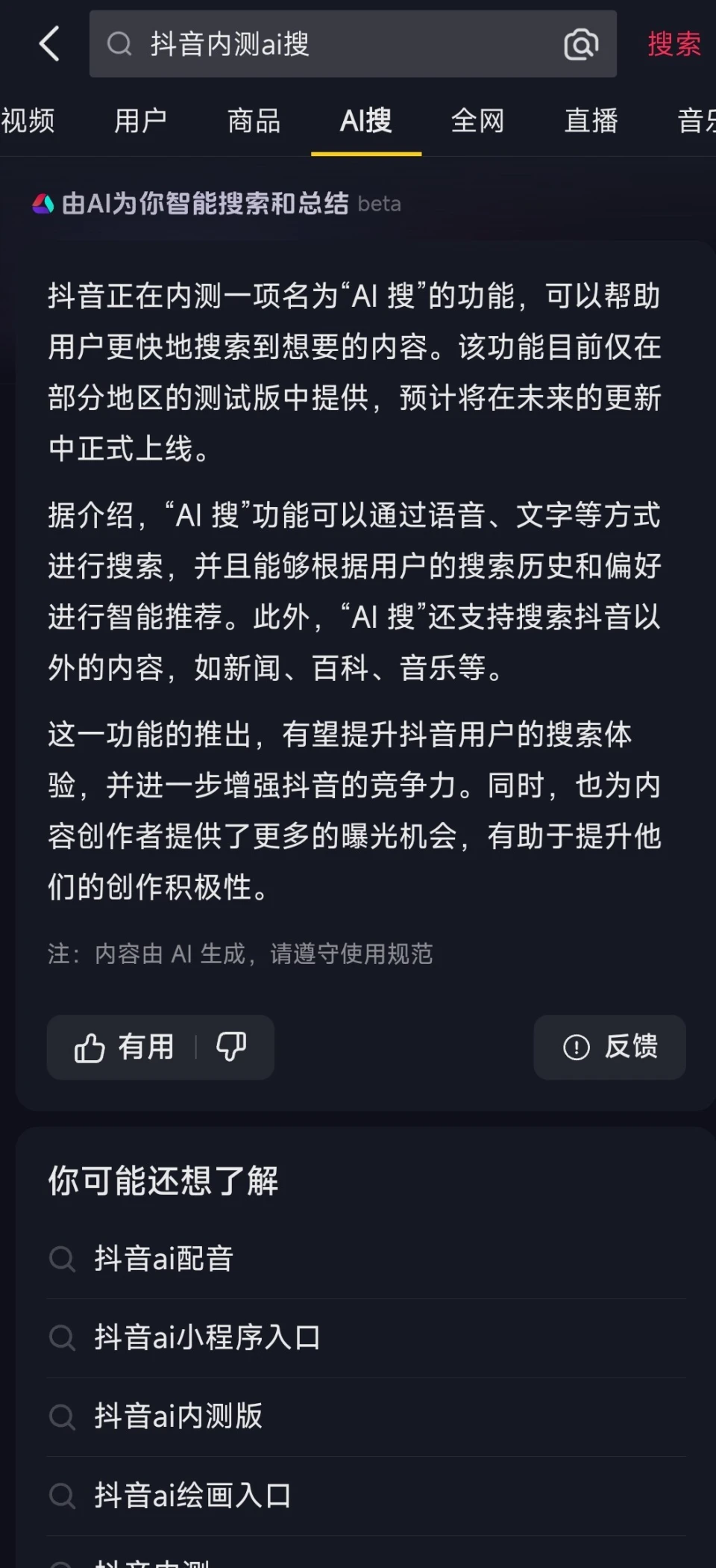 IT之家 12 月 25 日消息,前几天有IT之家用户发现抖音已经开始内测“AI 搜”功能,但现在仅在部门地域的测试版中提供,可以“从抖音 App 智能搜索总结答案”。 这是一种基于人工智能的搜索问答服务,可以为用户提供须要的答案。对此,抖音相干负责人对中国证券报表现,相干功能还在测试中,现在尚不成熟。 据先容,“AI 搜”功能可以通过语音、笔墨等方式举行搜索,而且可以大概根据用户的搜索汗青和偏好举行智能保举。别的,“AI 搜”还支持搜索抖音以外的内容,如消息、百科、音乐等。 据IT之家相识,“AI 搜”功能位于抖音 App 的搜索界面内,与其他搜索服务如商品、团购、用户、视频等并列。用户只需在“AI 搜”内输入相干的题目或信息,就可以得到“AI 搜”通过智能搜索技能为用户天生的回复。回复的内容不但泉源于抖音内的优质视频,还包罗第三方网站的信息,而且提供了跳转链接,方便用户检察更多的细节息争说。别的,“AI 搜”还可以根据用户的题目,给出用户大概感爱好的相干题目。 抖音的“AI 搜”功能是抖音进入智能搜索期间的告急标志,不但给用户带来了更便捷、更高效、更智能的搜索体验,也给创作者带来了新的机会和挑衅。通过“AI 搜”,创作者的优质视频内容有大概被作为回复的参考泉源,从而得到更多的曝光和流量,鼓励创作者连续创作更多的有代价的内容。 抖音并不是唯逐一个推出 AI 搜索问答服务的平台。从本年开始,国内各大 App 都在积极布局智能搜索范畴。比方,淘宝在原有的搜索功能上,推出了“淘宝问问”,专门针对电商搜索导购的场景。百度 App 和B站也分别推出了 AI 智能搜索和搜索 AI 助手,为用户提供更多的智能搜索信息服务。 |