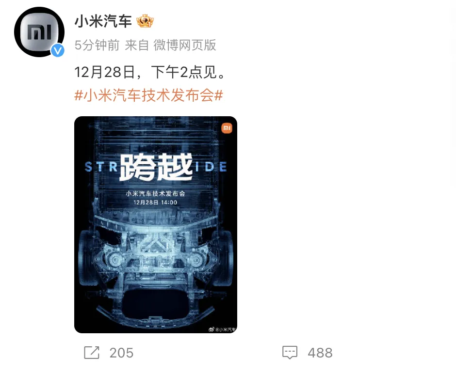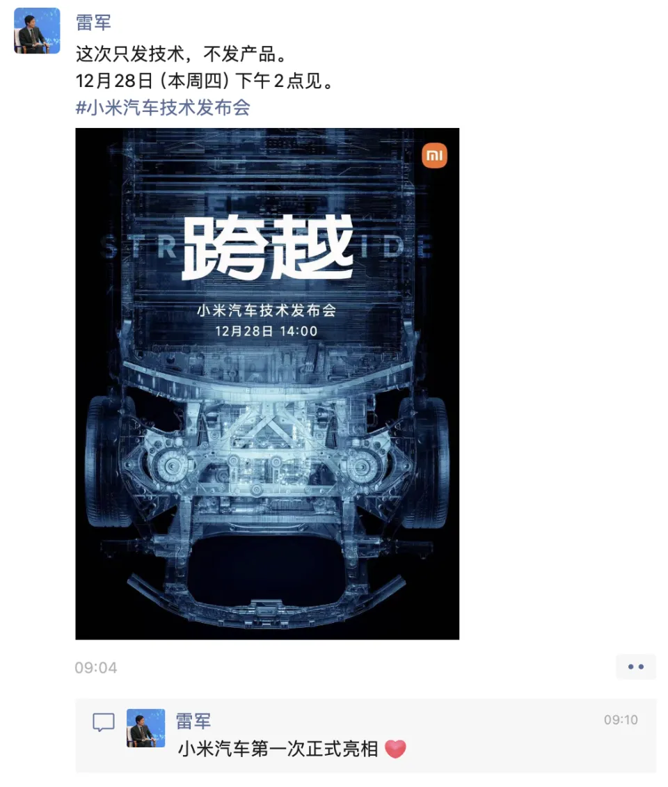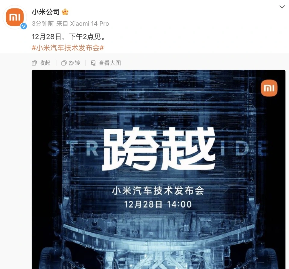 腾讯汽车讯 小米公司、小米汽车微博12月25日发布消息称,小米汽车技能发布会将于12月28日(本周四)下战书2点举行。 小米团体首创人、董事长及首席实行官雷军也发布微信朋侪圈称,这次只发技能,不发产物。12月28日(本周四)下战书2点见。 同时,雷军在朋侪圈复兴,这是“小米汽车第一次正式亮相”。 另据腾讯汽车查阅,小米汽车的官方微信公众号、视频号昨晚也已正式上线。 |