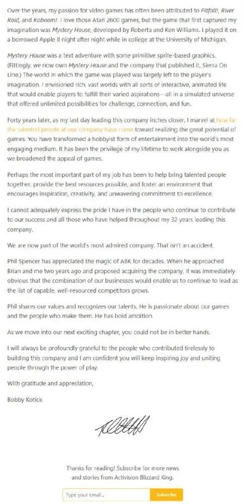 2023年现已进入倒计时,而客岁的这个时间,国内玩家们则大多还沉醉在动视暴雪游戏即将退出国服的“哀痛”中。一年时间已往,动视暴雪游戏国服回归依然遥遥无期,而近期又有人要退出了。固然,他不是游戏中的某个脚色,而是动视暴雪的现任CEO考迪克。 为动视暴雪掌舵三十余年的的考迪克,将于12月29日正式离职,克日他已发布了离职信。从1990年为动视改组使其死去活来,到21世纪光辉的前十五年动视暴雪成为最巨大的游戏公司之一,背后都有考迪克的影子。 自《守望先锋》发布后,暴雪游戏就再没能推出过口碑、销量双丰收的作品。2021年由于暴雪内部被控告存在性别鄙视文化,考迪克的个人风评进一步急转直下。不但是国内玩家,外洋的暴雪游戏粉丝同样有如许的看法。 在得知考迪克的任期仅剩末了一周时,推特上掀起了一轮新的狂欢。外网玩家各种开香槟,庆祝这一汗青性的时间。只是站在考迪克这个当事人的角度,这次的离职感觉上并非“被开除”而是退休。不但云云,他还还将得到丰厚的嘉奖。 按照动视暴雪此前的财务数据披露,考迪克持有的动视暴雪股份,在该公司高管中占比最高共计约430万股。这意味着按照微软每股95美元的并购价,考迪克将可在离职后一次性套现高出4亿美元(约合28亿人民币)。 别的,考迪克还将在离职时收到高出1500万美元(约合1.07亿人民币)的,名为“金色降落伞”驱逐补偿,以柿攴斧考迪克将带着近30亿离开。对于已经六十多岁的他来说,是时间到了享受人生的时间了。 在外媒PCGame发布的关于《鲍比-考迪克是怎样陈伟“电子游戏界最令人悔恨的人”》的文章中,作者对其如许评价道: 在员工和玩家们眼中,这位执掌动视暴雪多年的CEO,经常捐躯作品的艺术性创作调换利润;又或是举行大规模裁人来节省开支。然而1990年濒临倒闭的动视也是被他给救返来的,动视暴雪的乐成也离不开他。但在投资者看来,考迪克是个极为乐成的企业家。 当2024年到来时,动视暴雪将初次更换掌舵人。对于新的一年,玩家们有着很多精美向往。不外在考迪克离职后,动视暴雪能否回到谁人乐意谛听玩家诉求,可以连续更新有代价的游戏作品的期间还是个未知数,这很大概不是由某个人的意志是否存在来决定的。 那么各人对此又有什么看法呢? |