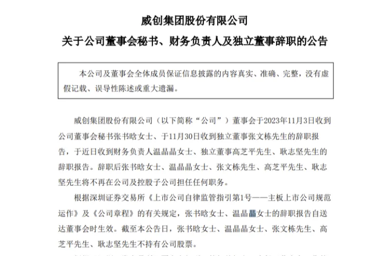 继超13亿巨款被不在公司任职的天然人古怪划走,威创股份(002308.SZ)再发公告,称5位公司高管近期相继离职。 12月25日晚间,威创股份公告称,公司董事会于2023年11月3日收到公司董事会秘书张书晗的辞职报陈诉、于11月30日分别收到独立董事张文栋的辞职陈诉。同时,还相继收到财务负责人温晶晶,以及独立董事高芝平、耿志坚的辞职陈诉。五人辞职后,将不在公司及控股子公司担当任何职务。 现在,根据《深圳证券生意业务所股票上市规则》相干规定,威创股份在未正式聘任新的董事会秘书、财务负责人期间,暂由公司董事长陆宇代行董秘及财务负责人的职务。 同时,威创股份还在公告中特别指出:两位高管辞职后不能免去其履职期间答应担的责任,如其履职期间给公司造成不良影响或丧失的,公司将生存追究其法律责任的权利。 三名独立董事辞职,导致威创股份的独立董事人数少于董事会成员的三分之一。根据相干法律法规的规定,其辞职将自公司股东大会推选产生新任独立董事之日起见效。 值得注意的是,这已是威创股份两个月内第二次出现多名公司管理层辞职的情况。 2023年10月11日,威创股份就曾公告称,因工作安排调解,陈香辞去公司董事、董秘、副总司理职务,陆宇辞去总司理职务,周丰辞去财务负责人职务。 随后,张书晗、温晶晶二人进入威创股份,自10月13日开始分别担当董秘、财务负责人职务。但仅任职二十余天,董事会秘书张书晗便提交了离职陈诉。 值得注意的是,分析股权架构,威创股份背后的“上层股东”浮出水面,正是被市场称为“毛纺巨子”的陆克平,而现在担当董事长的陆宇正是陆克平之子。12月24日晚间,威创股份公告称,因涉嫌信息披露违法违规,陆克平已被证监会存案。此前陆克平就曾因限定生意业务期内无法生意业务股票等违法活动,被证监会采取终身市场禁入步调,后又在本年10月因涉嫌利用证券市场被证监会存案。此次陆克平再因涉嫌信息披露违法违规遭证监会存案。 受相干消息影响,12月25日-12月26日两个生意业务日,威创股份股价一连跌停。停止12月26日午间收盘,报3.91元/股,跌9.91%,市值35.43亿元。威创股份2023年三季度陈诉表现,该公司陈诉期末平凡股股东总数为41030股。在威创股份股吧讨论中,不少股民对后续走势持悲观态度,以为未来将一连跌停,渴望索赔的股民不在少数。 采写:南都湾财社记者 严兆鑫 |