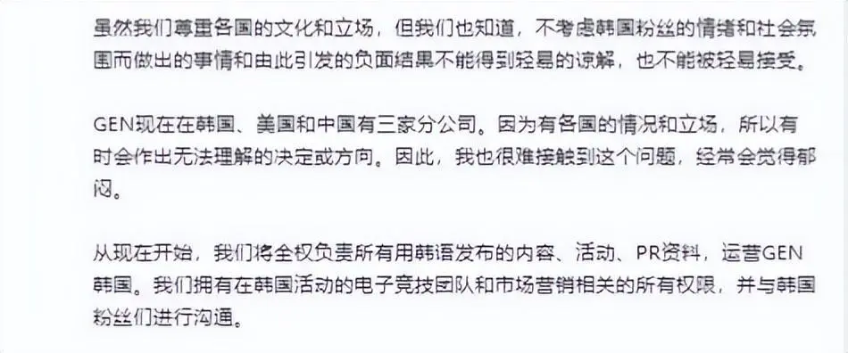 作为LCK的冠军战队,Gen在环球范围内,都有着不小的着名度,在12月下旬,由于共同赞助商发表了一些不当言论,导致这支队伍遭到了LPL观众的团体诛讨,在宣传文案中,Gen将LMS(台湾赛区)称作外洋国家,引发一阵热议,这种原则性标题,是LPL不能容忍的。 在文案发布14小局势后,被团体责备谴责的情况下,Gen不得已只能删除宣传文案,而且对于LPL观众举行致歉,在第一次的致歉中,Gen表现TD言论是稽核不严谨导致,由于致歉态度诚实,一众LPL玩家也没有举行过多的追究,但LCK的玩家,却由于Gen的态度,感到不满。 在LCK玩家看来,Gen发表的致歉,是在跪舔LPL,于是致歉声明发出没多久,很快就被Gen删除了,这番操纵之下,Gen算是彻底把LPL给得罪了,无数愤愤不平的LOL玩家,跑到Gen的官博下留言,让其滚出LPL赛区,同时另有不少人喊话LPL官方,对这支战队举行封杀。 又一次卷入舆论中央的Gen,在新的致歉声明中,表现俱乐部就TW标题上,保持明白的中立,而Gen在LPL分部的工作职员爆料,删除致歉声明,是由于发表公告,必要LPL、LCS、LCK三家公司,共同答应才可以,由于没有得到母公司的答应,以是终极做了删除处理处罚。 颠末这两波骚操纵过后,Gen的诚实粉丝管泽元带头取关,而且将这支队伍的相干内容,全部举行了删除,LPL的Gen粉丝,也开始划清界限,究竟战队之间的竞争,无论怎么样都可以忍受,但这种原则性标题,是绝对不答应反复横跳的,否则就对不起LPL观众的身份了。 本来删除致歉声明,重新发布中路言论,得罪LPL之后,这事儿就告一段落了,但在12月26日,Gen在LCK的母公司CEO,又举行了一波回应,他明白转达了两个态度,第一点是认可并撤回12月19日上传的,Gen赞助商文案中包罗的TD言论,以及“国土完备”等错误用词。 简单来说,就是Gen既不认可也不否认LMS是外洋国家,而国土完备等用词,算是错误的,在第一个态度的末了,Gen的CEO表现:作为电竞企业,不支持任何见解,这番又当又立的公告,既把LPL和LMS给得罪了,又让LCK观众感到不满,一席话直接得罪了三个了赛区。 而在第二态度中,Gen对两名“背锅侠”举行了停职处理处罚,观察竣过后,会清除相干条约,但由于“Gen是上市小公司”,要掩护个人信息,以是不能公开涉事职员的详细信息,而CEO自己负全责,扣除已往三年薪资,上交返还给公司,说真话这个公告,好不如不发来得好。 结语:Gen最初的致歉,得到了LPL的认可,但LMS和LCK不买账,于是删了保持中立,这一次又得罪了LPL观众,后续被曝光删除致歉声明,是由于LCK和LCS公司差别意,加上这次CEO模棱两可的乱来公告,算是彻底把LPL得罪了,估计以后没法在LPL驻足了,搞欠好下次在LPL举行的MSI,Gen连们都进不来。 对于Gen,你们作何评价呢? 接待留言讨论! |