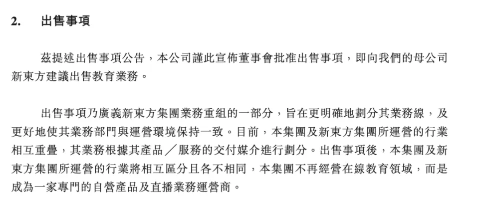 12月27日,东方甄选(1797.HK)在港交所公告,董事会允许向母公司新东方发起出售教诲业务,合计代价15亿元。 公告体现,出售事项乃广义新东方团体业务重组的一部门,旨在更明白地分别其业务线,及更好地使其业务部门与运营情况保持同等。 出售事项后,团体及新东方团体所运营的行业将相互区分且各不雷同。团体将不再谋划在线教诲范畴,而是成为一家专门的自营产物及直播电商业务运营商。 定价15亿元 东方甄选出售教诲业务 12月27日东方甄选发布公告,董事会允许向母公司新东方发起出售教诲业务,合计代价为人民币15亿元,以现金付出。 根据公告,出售事项完成后,教诲业务将不再是团体的一部门,东方甄选及其附属公司(简称“团体”)将不再谋划在线教诲业务,且团体与新东方团体之间不再有任何有关教诲业务的关连交易业务。因此,作为教诲业务转让之不可或缺之部门,全部与团体所谋划的在线教诲业务有关的协议及交易业务将停止或转让予新东方团体(或由新东方团体重新进入)。 出售事项的标的,公告体现包罗(a)东方优播(香港)教诲有限公司(一家于2020年8月13日在中国香港注册创建的公司)(“ 优播香港 ”)的全部股权 ; (b)北京酷学慧思网络科技有限公司(一家于2013年2月1日创建的公司)(“ 酷学慧思 ”) 的全部股权 ; (c)西安睿盈慧师网络科技有限公司(一家于2020年4月3日创建的公司)(“西安睿 盈”)的全部股权 ; 出售协议所载与教诲业务有关及本团体(指东方甄选本公司及其附属公司,包罗综合联属实体)“大学教诲”及“机构客户”业务分部附属的相干知识产权资产、业务合约权利及责任、应收账款及应付账款、存货、其他相干资产及僱用资源。 出售事项后,目的实体(上述(a)至(c)中的实体为“目的实体”),将不再于本团体综合入账。 经参考董事会翰札,出售事项是新东方对其附属公司之业务线举行内部重组之一部门,此受以下因素所驱动:中国有关校外培训业务之羁系情况发生变革;由于COVID-19疫情,中国门生的学习及生存风俗以及广义新东方团体之客户群发生变革,这导致在线及线下教诲的边界含糊以及向OMO学习及生存风俗之变革;及公司开发其自营产物及直播业务,广受中国用户的欢迎。这一情况变革已促使广义新东方团体重新思量新东方团体及团体之间之业务分别。出售事项乃广义新东方团体对其业务举行重组之一部门,厥后,各团体将可以大概更好地专注于一个详细而特定之行业(即新东方团体专注于教诲行业,而贵团体专注于自营产物及直播行业)。 制止2023年9月30日,教诲业务的账面值(净负债)约为1.53亿元。东方甄选预计录得收益约16.53亿元,由出售代价减教诲业务净负债1.53亿元,交割日期为2024年3月1日或订约方另行协定的日期后十个业务日内付出。 对于上述出售事项的所得款净额,东方甄选在公告中提到,10%将用于营销及贩卖,利用时间为自出售事项完成起5年内;10%将用于人才入职及挽留;20%用于研发;40%用于其他一样寻常发展及营运自营产物、直播业务;20%用于一样寻常营运资金。 至于公司将来的筹划,东方甄选体现,团体已经自身定位为一个直播平台,专注于通过尖端技能以寓教于乐的方式为斲丧者甄选及提供优质产物。 制止12月27日收盘,东方甄选跌6.93%,报26.85港元。 东方甄选前身为新东方在线,为新东方旗下在线教诲平台,“双减”政策后,剥离K12培训业务,渐渐转型直播电商平台。 2022年5月19日,俞敏洪发文称,“开发一个新的赛道(东方甄选),将来大概可以大概为新东方来带来新的转机。”以后,新东方在线于2023年1月公告,公司简称更名为东方甄选。 董宇辉新号一天涨粉超100万 俞敏洪为新公司终极受益人 值得一提的是,12月26日,董宇辉抖音新账号“与辉偕行”正式开通,已获平台官方认证,企业认证为与辉偕行(北京)科技有限公司。 在26日19时左右界面消息报道时,该账号粉丝数目为8.3万。制止27日发稿,该账号粉丝数目已达123.9万。据观察,如今该账号粉丝数仍在较快增长。 企查查App体现,12月22日,由北京新东方迅程网络科技有限公司全资持股的与辉偕行(北京)科技有限公司创建,其注册资源1000万人民币,董宇辉继续法定代表人、实行董事、司理,俞敏洪继续监事并为公司实控人。 公司谋划范围包罗日用品批发、互联网信息服务、出书物零售、演出经纪、业务性演出、旅游业务等。股东信息体现,该公司由北京新东方迅程网络科技有限公司全资持股。 值得一提的是,该公司注册地点与东方甄选关联公司东方优选(北京)科技有限公司为同一栋楼。 此前,俞敏洪体现董宇辉将创建个人工作室,工作室产生的收益都管帐入到东方甄选。 12月21日晚间,董宇辉与新东方教诲科技团体CEO周成刚表态东方甄选直播间。直播中,董宇辉称,将来的独立工作室仍会对峙大量卖农产物,“俞老师跟我聊过,将来东方甄选能卖的,我也能卖。货品可以完全重合,也会相互瓜代。统统都在实验。” 编辑|程鹏杜恒峰 校对|何小桃 封面图片泉源:截图 逐日经济消息综合自公司公告、与辉偕行抖音号、界面消息、企查查、中国证券报 逐日经济消息 |