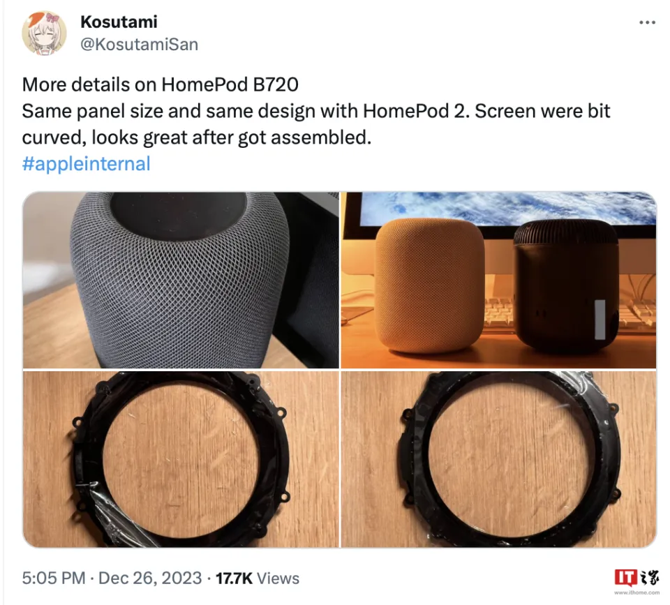 IT之家 12 月 27 日消息,苹果博主Kosutami本日在X平台发布贴文,展示了苹果新款HomePod 3音箱的工程机,该工程机据称是用于“声学测试”的机型。 IT之家从Kosutami贴文中得知,这款HomePod音箱代号为“B720”,采取全贴合曲面 OLED 屏幕,拥有“弧形”上盖,据称能让屏幕“看起来更大”。 另据此前报道,苹果公司正在定制的iPad mini原型上,为未来推出的带屏幕HomePod产物,测试运行tvOS体系。 别的,郭明錤也在本年3月爆料,苹果预计在2024年推出带有大屏幕的全新HomePod,天马为独家面板供应商,因此相干音箱很有大概将在来岁与小同伴们晤面。 |