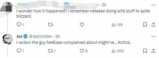 也有国外玩家好奇这件事是怎么发生,由于网易“做了一些疯狂的事来反攻暴雪”。对此,Jez表现这些举动大概只是针对鲍比·科蒂克个人而已。