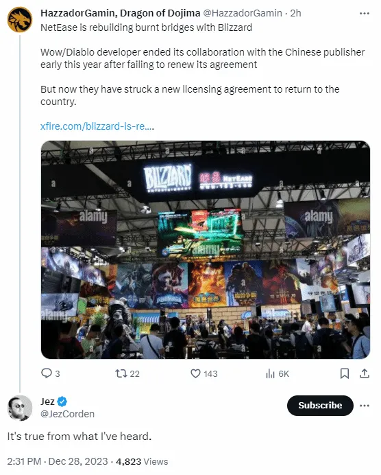 别的着名母舅党Jez也表现:“据我相识(暴雪和网易复合听说),这是真的”。