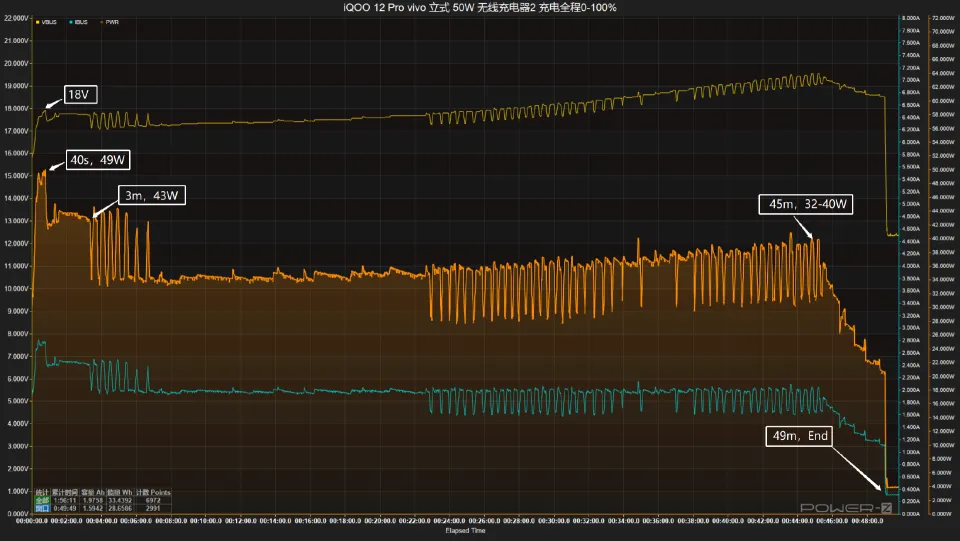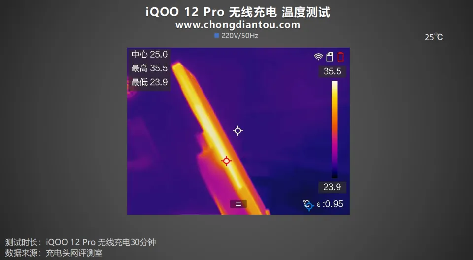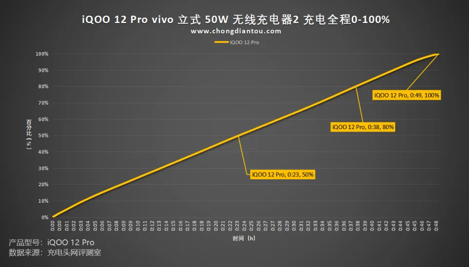 前言此次,iQOO 12 Pro 手机搭配了第三代骁龙8旗舰芯片处置惩罚器和自研电竞芯片 Q1,提升用户游戏体验。别的,它也接纳了创新的超极石墨电池,拥有5100mAh大容量,支持 120W 快充、50W无线快充和10W反向无线充电功能,多种充电续航体验;下面,就看看这部手机搭配原厂无线充电器时的详细体现怎样。 手机先容包装内附赠的手机配件中拥有卡针、掩护套以及120W充电套装。 此次最新推出的 iQOO 12 Pro手机正面搭载了一块6.78英寸三星 E7 2K微曲全感屏,依然接纳正面顶部开孔;分辨率为 3200*1440,最高支持144Hz的屏幕革新率,高刷丝滑更流畅。除此之外,搭载全新的第三代骁龙8移动平台处置惩罚器+LPDDR5x内存+UFS 4.0闪存,组建性能铁三角,拥有超能装、超耐用和超敏捷的使用体验。 iQOO 12 Pro 手机仍旧拥有传奇版、赛道版两款经典格局,同时新增燃途版格局。此款为赛道版,背板接纳萤石 AG玻璃材质,手感风雅顺滑,光影活动更为闪烁。iQOO 12 系列手机拥有全新计划的【万里舷窗】模组,还带来了出众的拍摄体现。 充电接口天然是 USB-C端口,同时扬声器条形开孔、麦克风、SIM卡槽也依次分列在底部。 vivo 50W无线充电座团体雪白简约,正面无线充电地区为磨砂外壳,底部拥有硅胶支持架。 通过原厂120W充电套装为无线充电座供电,同时为 iQOO 12 Pro手机举行无线充充电,可以看到充电器输出端功率为17.72V 2.8A 49.62W。 充电全程测试为了到达 iQOO 12 Pro手机50W无线快充最大功率,本次测试充电头网选择了同厂最新款的vivo立式50W无线充电座2为其充电,下面来看看无线充电体现怎样? 接通电源后,握手18V电压档位;前40秒充电功率最高到达49W;随后功率降落至43W左右并连续充电至第3分钟;随后功率降落至32-40W左右并连续充电至第45分钟;之后功率骤降,并于第49分钟充至满电。 绘制出折线图,可以清楚看出使用原厂vivo 立式 50W 无线充电器2为iQOO 12 Pro 23分钟充至50%;38分钟充至80%;从0%开始至完全布满耗时约49分钟。 温度测试来看看无线充电发热体现怎样。 使用vivo 立式 50W 无线充电器2为iQOO 12 Pro充电30分钟,使用热成像仪拍摄手机侧面 ,最高温度为35.5℃。散热体现相称不错。 充电头网总结对于iQOO 12 Pro手机的理论硬件参数,此前就详细先容过第三方充电器、原厂充电器及电池自界说电量功能的实际测试,用户的充电体验更加友爱。 别的,iQOO 12 Pro手机在举行50W无线快充时,其充电耗时约为49分,在其充电过程中举行温度丈量,实测多个阶段下的测试到充电温度最高仅在35.5℃左右,体现优秀。 团体来说,iQOO 12 Pro手机的无线充电方面的体现正如官方所形貌,同时,这款充电座具备自散热功能,使得手机在无线充电时,温度进一步降落,用户体验更加友爱。 |