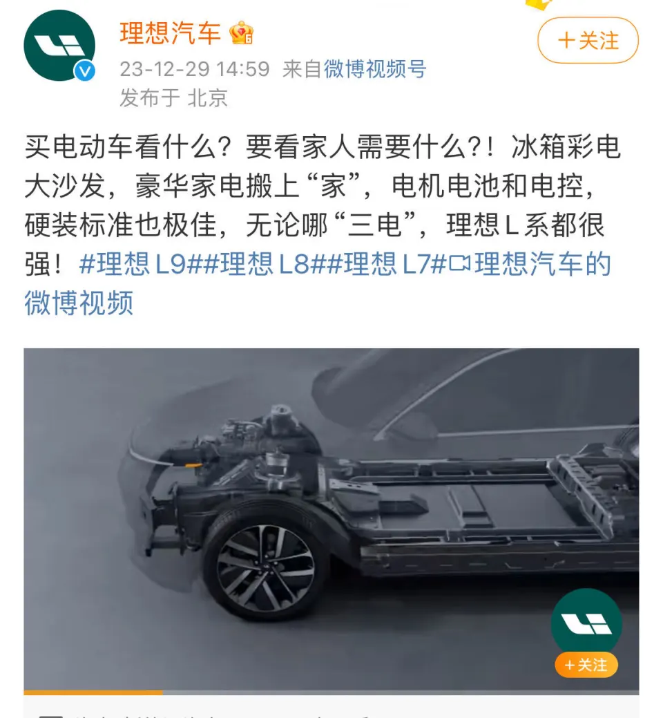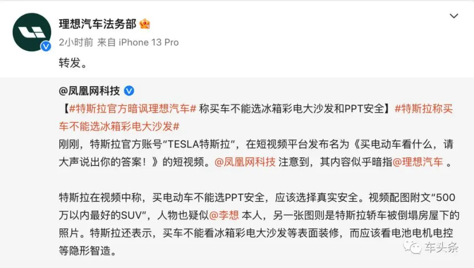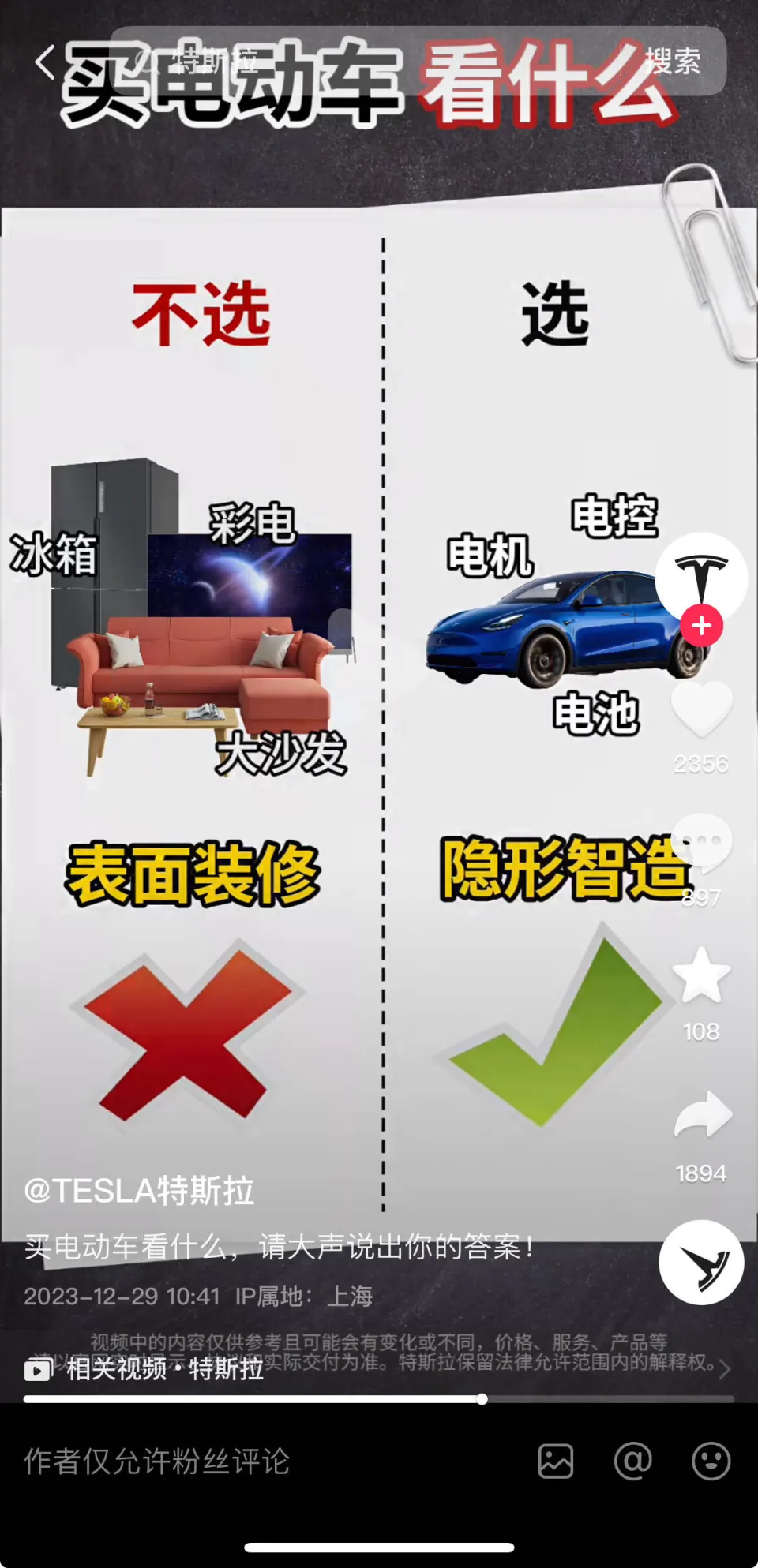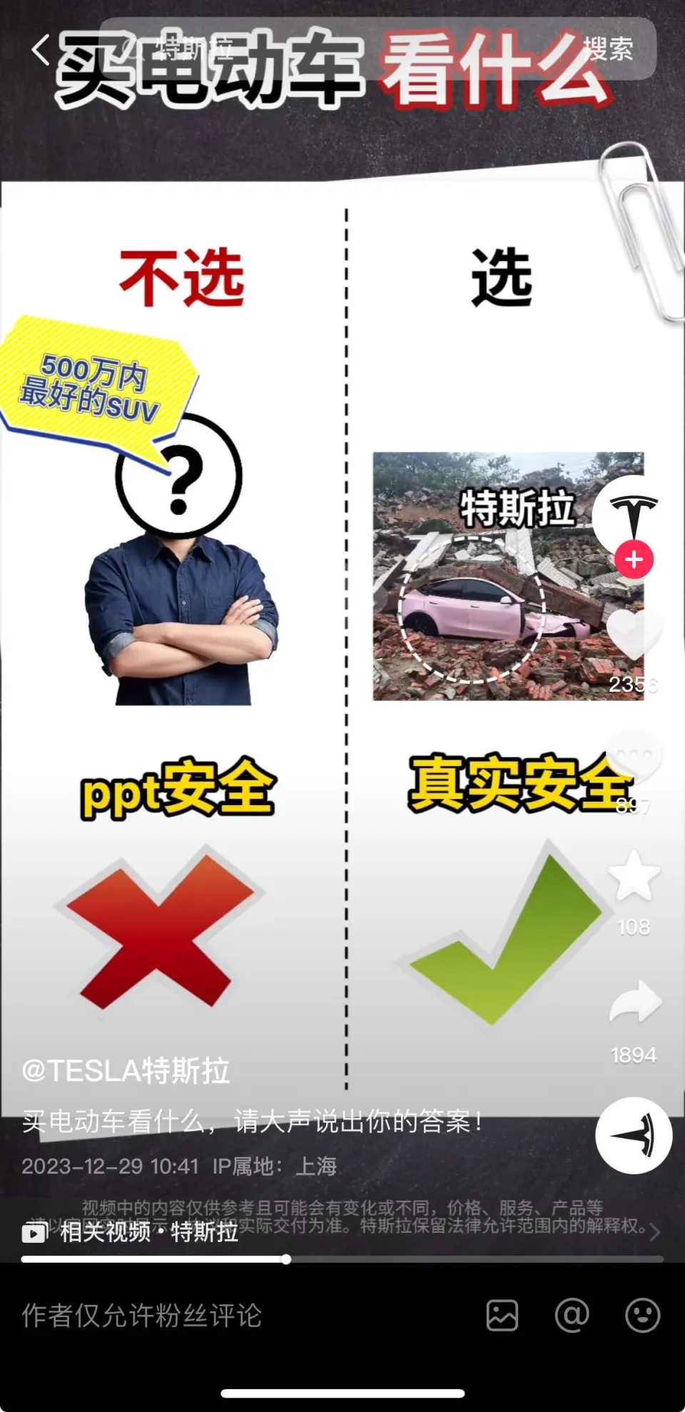 三言科技 12月29日消息,本日,特斯拉官方抖音账号发布名为《买电动车看什么,请高声说出你的答案!》的短视频。 视频称买电动车不能选PPT安全,应该选择特斯拉的真实安全。值得注意的是,视频配文“500万以内最好的SUV”以及一张被盖住脸部的人物,疑似指向抱负汽车和李想。李想曾称L9是“500万以内最好的SUV”。 特斯拉还称买车不能看冰箱彩电大沙发等外貌装修,要看电池电机电控等隐形智造。 对此,抱负汽车官方微博发文称,买电动车看什么?要看家人必要什么?!冰箱彩电大沙发,豪华家电搬上“家”,电机电池和电控,硬装尺度也极佳,无论哪“三电”,抱负L系都很强! 而抱负汽车法务部则转发了相干报道。 |