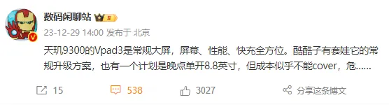 12月29日,OPPO忽然官宣Find X7系列将于1月8日下战书2:30发布,并公布了新机表面和全系配色,让各人来了点绿厂震撼(街边门店换门头颜色之前,我是不会认同黑厂的名号的)。 玄色素皮(Find X7 Ultra独享)连纹路都差异↑ Find X7系列有天南地北(新的深蓝素皮)、大漠银月(棕色素皮)、烟云紫、松影墨韵四个颜色。 特意往相机奥利奥加银色装饰,让我不禁想起了Reno11系列。好不悦目就交个各人判定吧,我们机佬就不做评价了。 相机矩阵里,最下面是一个点的是Find X7标准版↑ Find X7 Ultra最下面是相机镜头,全系素皮↑ 官方玩梗↑ 预计1月8日一起发布的尚有OPPO Pad 3和支持eSIM的智能圆表。汇总下Find X7系列的爆料: Find X7 型号PHZ110,天玑9300,顶配16GB内存,5000mAh电池+100W快充。雷同Find N3,会引入一加那样的三段式拨钮。 6.78英寸2780x1264的京东方X1基材屏幕(一加12/一加Ace 3屏幕同款基材) 5000万像素LYT-808(一加12同款),F1.6。5000万像素JN1超广角,等效16mm,6400万像素OV64B 3倍70mm潜望长焦 Find X7 Ultra(有个Find X7 Ultra卫星通讯版) 型号PHY110,骁龙8 Gen 3,5000mAh电池+100W快充。高位超薄屏下指纹+三段式拨钮+VIP模式(一键禁用相机、麦克风和定位)。 6.82英寸2K LTPO微曲屏,3168x1440,8T LTPO(应该就是和Find X6 Pro和一加12一样的造型,一加12同款屏幕),首个双潜望长焦旗舰 首发索尼1英寸LYT900主摄,F1.8 LYT-600超广角(1/1.953型,5000万像素,0.8μm,IMX586接替者,规格弱于前代的IMX890超广角) 超广角从1/1.56型的IMX890回退到1/1.95型5000万像素的索尼LYT-600,等效14mm 2.7倍潜望长焦(IMX890,1/1.56型,5000万像素,1μm,2×2 OCL),上代同款,放在相机矩阵正中心 6倍潜望长焦(IMX858,1/2.51型,5000W,0.7μm,2×2 OCL),等效135mm 12月29日,明哥没关照我们就直接在官网上架了光彩X50 Pro。 光彩X50 Pro搭载3GHz的骁龙8+。192g重,163.6x75.5x7.98mm。 6.78英寸2652x1200的120Hz中置打孔曲屏,有1920Hz 高频PWM调光。 1亿像素主摄+200万像素战术副摄,前置800万像素。 5800mAh电池+35W快充(11V 3.2A)。有NFC,单扬声器。 光彩X50 Pro如今只有12+256一个版本,订价2799元…… 之前担心背刺的用户,如今可以放一万个心了。 末了补个天玑9300平板的消息。 闲聊站在12月29日体现,vivo Pad 3是天玑9300,会是和前代一样的大屏方案。上一代是天玑9000,这波连跳两代直接登顶。但渴望vivo能给新机减下肥吧,vivo Pad 2 ↓是真的重。iQOOPad 2预计又是它的换标版(然而并不会自制多少)。 而坏消息是,8.8英寸屏幕的天玑9300平板时间更晚,且项目伤害,能不能量产都难说…… |