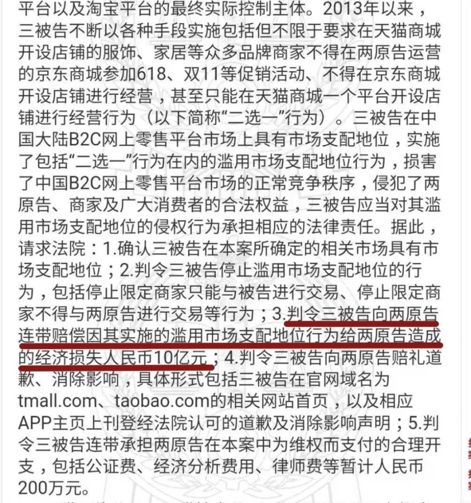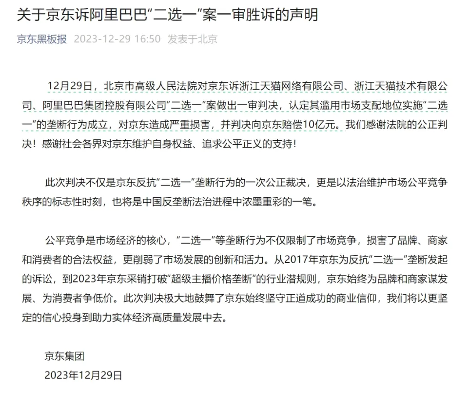 每经编辑:张锦河 据公众号“京东黑板报”,12月29日,北京市高级人民法院对京东诉浙江天猫网络有限公司、浙江天猫技能有限公司、阿里巴巴团体控股有限公司“二选一”案做出一审讯断,认定其滥用市场支配职位实行“二选一”的把持活动建立,对京东造成严峻陵犯,并讯断向京东赔偿10亿元。我们感谢法院的公正讯断!感谢社会各界对京东维护自身权益、寻求公平公理的支持! 此次讯断不但是京东反抗“二选一”把持活动的一次公正裁决,更是以法治维护市场公平竞争秩序的标记性时候,也将是中国反把持法治进程中浓墨重彩的一笔。 公平竞争是市场经济的核心,“二选一”等把持活动不但限定了市场竞争,陵犯了品牌、商家和消耗者的合法权益,更减弱了市场发展的创新和活力。从2017年京东为反抗“二选一”把持发起的诉讼,到2023年京东采销突破“超等主播代价把持”的行业潜规则,京东始终为品牌和商家谋发展、为消耗者争低价。此次讯断极大地鼓舞了京东始终服从正道乐成的贸易信仰,我们将以更刚强的信心投身到助力实体经济高质量发展中去。 据证券时报,针对京东下战书公告的“二选一”案件效果,阿里对记者回应体现:已获悉此消息,恭敬法院的讯断效果。 据中国青年报此前报道,两大电商的“二选一”口水战开端于2015年,京东以“天猫滥用市场支配职位欺压商户二选一”将天猫诉至法院。而天猫方面主张此案由浙江省高级人民法院审理,因此该案件一度陷入法院管辖权之争。 2017年,北京市高级人民法院一审驳回天猫法院管辖权贰言,天猫不平提出上诉。 最高法裁定书表现,原告为北京京东世纪贸易有限公司和北京京东叁佰陆拾度电子商务有限公司,被告为浙江天猫网络有限公司、浙江天猫技能有限公司、阿里巴巴团体控股有限公司。 京东诉称,2013年以来,三被告不绝以“签署独家协议”“独家互助”等方式,要求在天猫商城开设店肆的服饰、家居等浩繁品牌商家不得在两原告运营的京东商城到场618、双11等促销运动、不得在京东商城开设店肆举行策划,以致只能在天猫商城一个平台开设店肆举行策划,京东将其概括为“二选一”。 为此,京东哀求法院: 1.确认三被告在本案所确定的相干市场具有市场支配职位; 2.判令三被告克制滥用市场支配职位的活动,包罗克制限定商家只能与被告举行买卖业务、克制限定商家不得与两原告举行买卖业务等活动; 3.判令三被告向两原告连带赔偿因实在行的滥用市场支配职位活动给两原告造成的经济丧失人民币10亿元,以及赔罪致歉及付出维权开支。 停止12月29日港股收盘,阿里巴巴(HK9988)股价75.6港元,下跌0.33%,最新市值1.5万亿港元;京东团体(HK9618)股价112.5港元,下跌0.09%,最新市值3577.1亿港元。 逐日经济消息综合自公众号“京东黑板报”、证券时报、最高法裁定书、中国青年报 逐日经济消息 |
