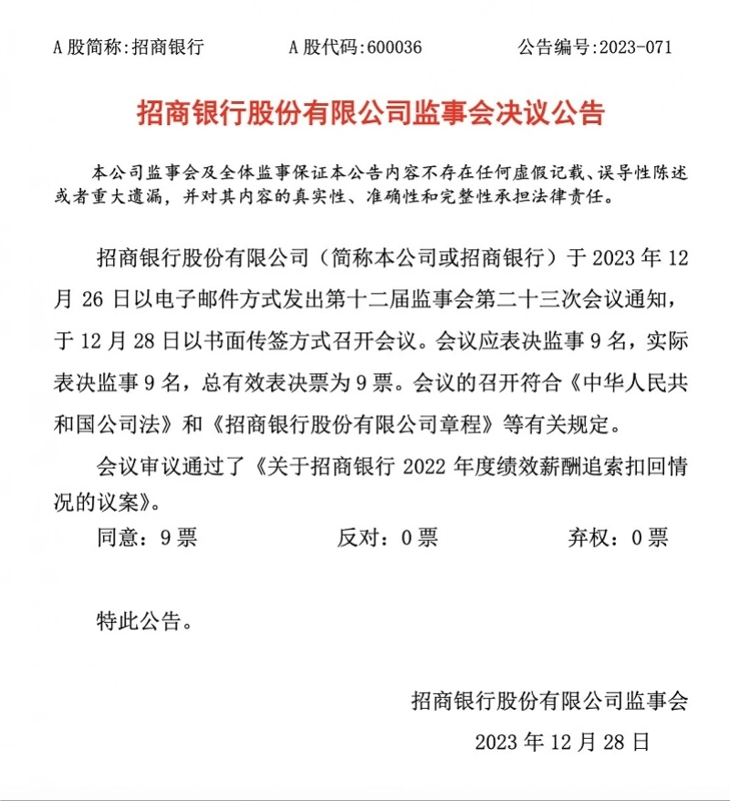 克日,招商银行“反向讨薪”话题引发关注。12月29日,南都记者从招商银行股份有限公司(下称“招商银行”)发布的监事会决定公告获悉,集会审议通过了《关于招商银行2022年度绩效薪酬追索扣回情况的议案》。 招商银行发布公告。 南都记者注意到,招商银行曾多次披露有关绩效薪酬追索扣回的情况。2023年12月1日,招商银行就发布了董事会决定公告,称审议通过了《关于招商银行2022年度绩效薪酬追索扣回情况的议案》。12月28日,该行又发布监事会决定公告称,集会审议通过了《关于招商银行2022年度绩效薪酬追索扣回情况的议案》。 别的,招商银行股份有限公司在2022年度陈诉(A股)中曾公布有关情况称,为缓释各类谋划和管理风险,公司根据羁系要求及谋划管理须要,创建了薪酬延期付出和绩效薪酬追索扣回干系机制。陈诉期内,公司实行绩效薪酬追索扣回的员工2876人,追索扣回绩效薪酬总金额5824万元。 在更早之前,2022年12月28日,招商银行发布的董事会、监事会决定公告表现,集会审议通过了《招商银行绩效薪酬追索扣回管理办法》。 值得注意的是,羁系部门早已对此发布有关文件。2021年1月,原银保监会发布了《关于创建完满银行保险机构绩效薪酬追索扣回机制的引导意见》,要求银行保险机构根据风险袒露情况追回不当发放的绩效薪酬,强化薪酬与风险负担的同等性。 另据2023年3月羁系部门公布情况,停止其时,95%以上银行保险机构已订定并实行了绩效薪酬延期付出和追索扣回制度。特别是在一些高风险机构,干系制度为追究违规高管责任、挽回资产丧失发挥了告急作用。 南都记者梳剃头现,创建银行、工商银行、兴业银行等多家银行已订定绩效薪酬追索扣回干系的制度。渤海银行股份有限公司2022年度陈诉披露,对发生违规违纪、因存在显着不对或未尽到审慎管理使命导致职责范围内风险超常袒露等情况的干系责任人,追索扣回其相应限期内的绩效薪酬。2022年,该行追索扣回370人绩效薪酬1760万元。 九江银行股份有限公司2022年度陈诉表现,该行对于已出现的责任风险丧失超常袒露,根据行内干系绩效追索扣回制度已举行追索扣回工作,陈诉期内绩效追索扣回金额人民币163万元。 采写:南都记者 敖银雪 |