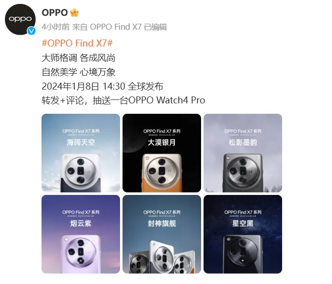 鞭牛士 12月29日消息,本日OPPO官方公布OPPOFind X7系列五款配色。 据悉,OPPOFind X7系列提供天南地北、大漠银月、松影墨韵、烟云紫、星空黑配色。OPPO Find X7系列将搭载行业首发70亿参数端侧大模子,配备OPPO全新自研的软硬芯片融合技能栈——潮汐架构。OPPOFind X7系列将是OPPO第一款支持卫星通讯的产物,初次支持了听筒/免提双模卫星通话,通过独特的卫星天线方向图调控技能,可以实现用户举行头手的卫星通话。 |
