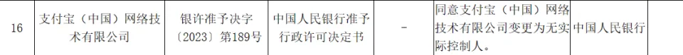 中国人民银行官网的非银行付出机构庞大事项变更答应信息公示(停止2023年12月)表现,央行发布银许准予决字 [2023] 第189号文,同意付出宝 (中国) 网络技能有限公司变更为无现实控制人。 |