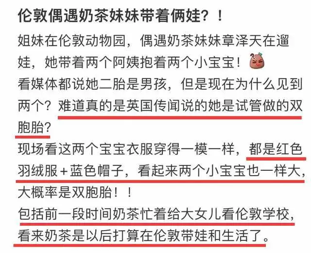 有网友在交际平台上晒出,在英国伦敦偶遇章泽天(奶茶妹妹)嬉戏的画面。 从曝光的画面中看,章泽天身边有2个保姆,每人各自抱着一个小宝宝,看上客岁事差不多大,都是穿着红羽绒服,戴着帽子。固然没有看到正面,但是仍然感觉到很可爱,没有猜错应该是双胞胎。 章泽天出行带娃,保姆随行也不是希奇事变。在9月份刚刚生产完2胎没有多长时间的章泽天,带着6岁的女儿在地中海度假,其时身边有一位外籍密斯,有网友称是随行的家教西席,也有称是保姆。 有网友表现,请如许的保姆代价不菲。看到章泽天母女俩出行,隔着屏幕都可以或许嗅到了款子的味道。有钱真是任性,可以做自己想做的事变,而且生存质量不停进步,对孩子辅导更加注意和讲求。 从网友晒出的照片中看,章泽天穿着白色羽绒服,头戴着玄色棒球帽,皮肤白皙水嫩,给人感觉很年轻,一点也看不出已经生过娃的妈妈。 前不久,有网友拍摄到章泽天出现在英国伦敦某学校,疑似为女儿挑选学校。细细数一数,女儿也是到了上学的年事了。其时的章泽天穿着咖色长款毛衣,没有施一点粉黛,黑眼圈、眼袋显着,一脸疲劳又干瘪的样子。相比之下,章泽天这一次的曝光,状态比之前要好。 章泽天站在2个保姆中心,与她们谈天,很随和,没有半点阔太太的架子。2个小宝宝也很乖巧,不吵不闹。比年章泽天被网友拍摄到,险些每一次都在英国。在网络上流传,章泽天的儿子也是英国出生,说不定她与小孩子们已经定居英国了。着实也不不测,一个人的生存环境与家庭气力有莫大的关系。 2022年9月有网友在美国的超市拍摄到,章泽天与刘强东在购物的画面,其时的章泽天已经怀有身孕,四肢纤细,肚子大如箩。按时间算一算,章泽天的2胎差不多1岁了。 追念起,章泽天在母亲节前更新了一条动态英文写道:“Happy Mother's Day triple love”,翻译成中文是“3倍的爱”。 其时章泽天的发文引起了不少网友的讨论和关注,纷纷误以为章泽天怀上三胎。这个消息没有得到证明,末了不了了之了。云云看来,章泽天为刘强东诞下三胎也是有迹可循,如果章泽天2胎是喜获双胞胎儿子,她与刘强东实现了儿女双全。 不外,有网友爆料章泽天的2胎是做试管双胎儿子。关于外界的听说,章泽天与刘强东现在为止没有回应。 章泽天自从在读高中时手捧一杯奶茶火出圈后,她的一举一动都是受到外界的关注。最让各人津津乐道的是,刘强东美国“性丑闻”事变在网络上闹得沸沸扬扬。各种飞短流长的攻击,章泽天一声也不吭,不说刘强东好话,也不说刘强东浮名,静静去英国继承学业,然后生下2胎。从外貌上看,章泽天没有什么动静,实际上她的感情控制本领真是很让人敬佩。换作是其他一样平常的女人遇到老公出轨,早就一哭二闹三吊颈了。 章泽天不但有亮眼的学历,而且懂得深耕自己的内在和自己的古迹。只有自己有气力,哪还必要在乎外界的闲言碎语呢。正由于有一份野心,以是她敢于凌驾世俗的各种眼光。 对于章泽天来说,有野心也好,淡泊名利也罢,没有真正的对与错。跟随自己的心田一步步走,才是王道。毕竟上,光有野心是没有用的,是必要富足的气力来支持。 章泽天在最正值精美的光阴爆火网络,与贸易大佬刘强东爱情、完婚,生小孩、产业统统都是来得太顺遂了。试问如许的人生有几个女性可以或许拥有呢? |